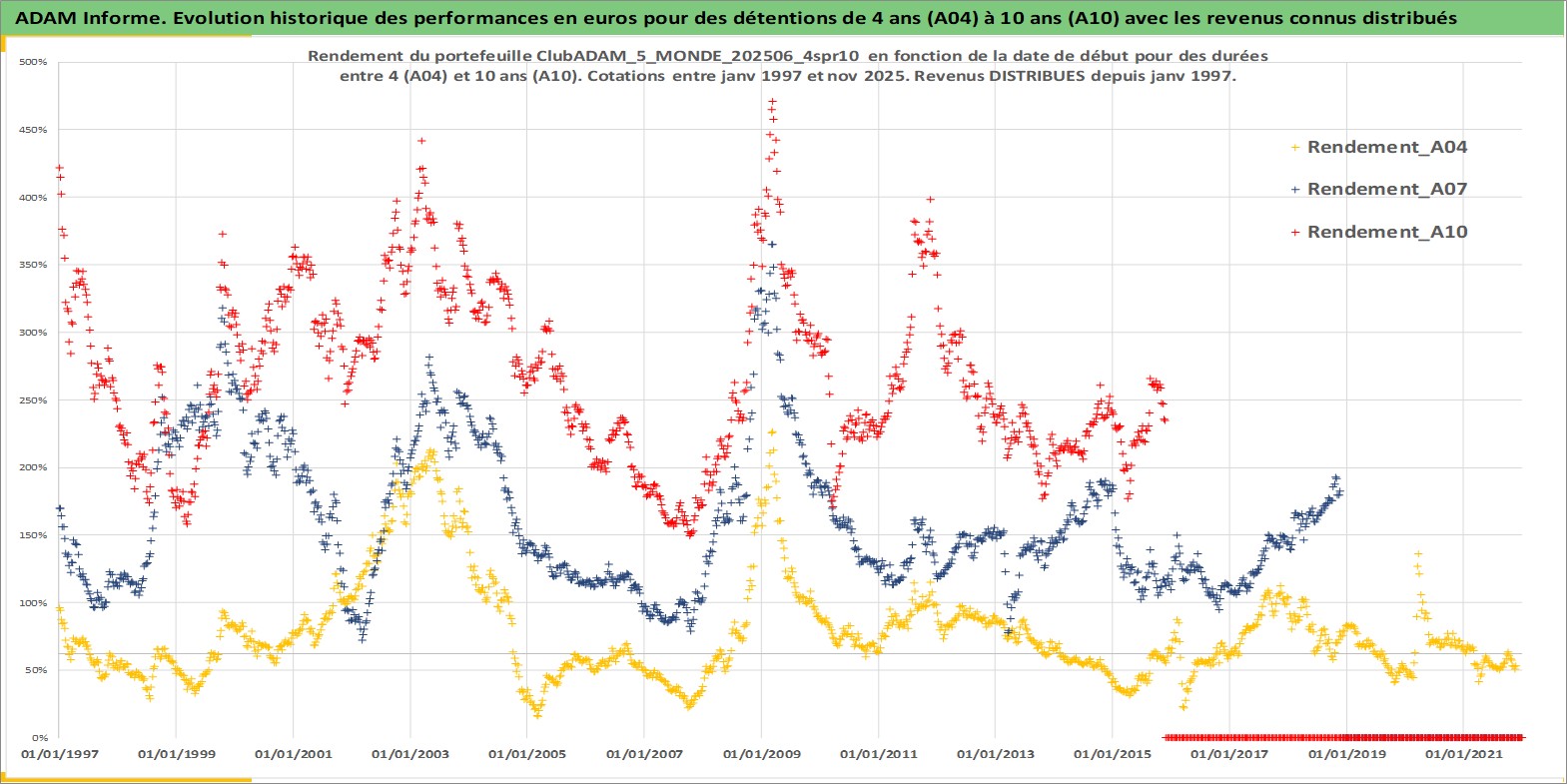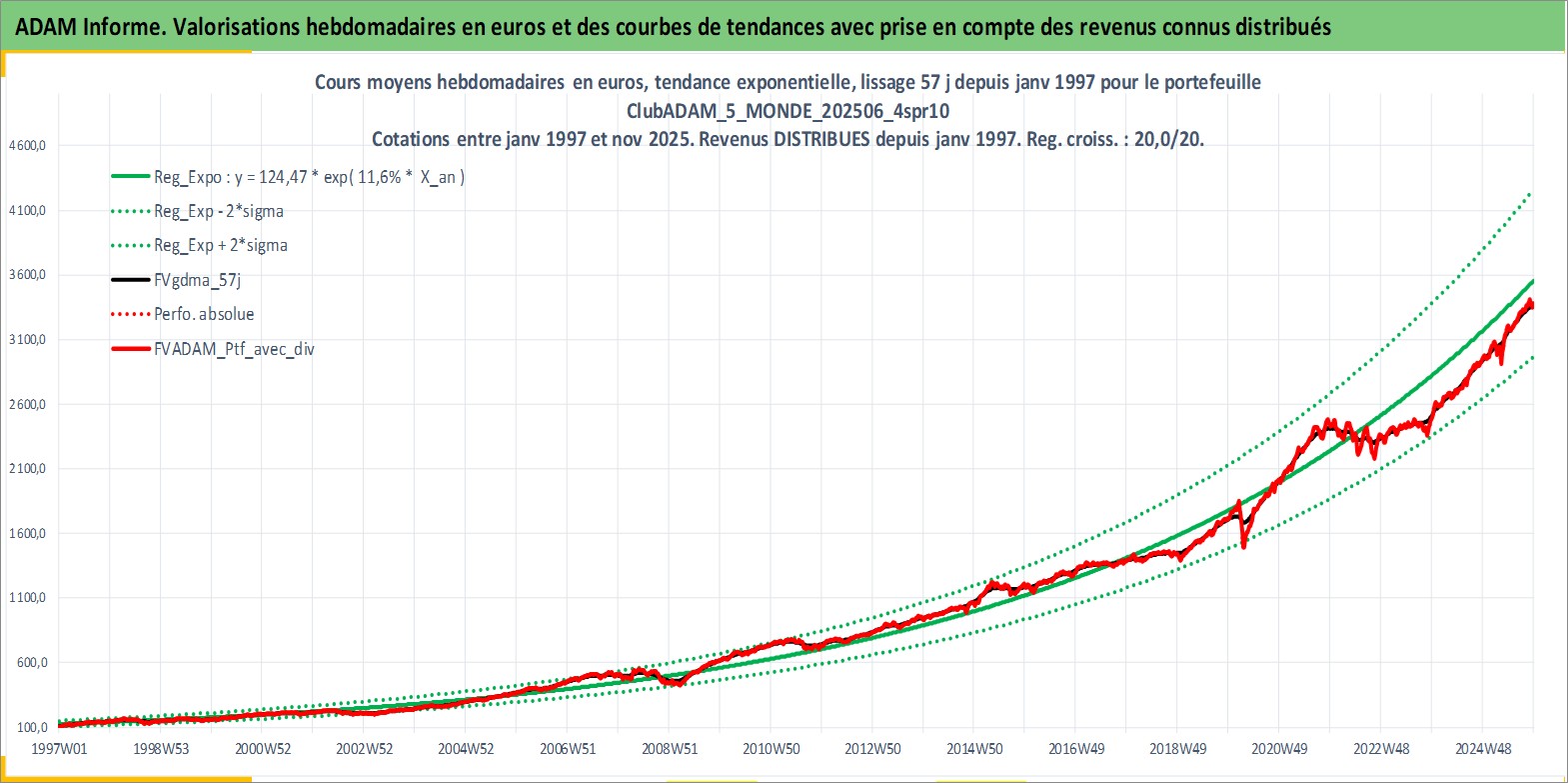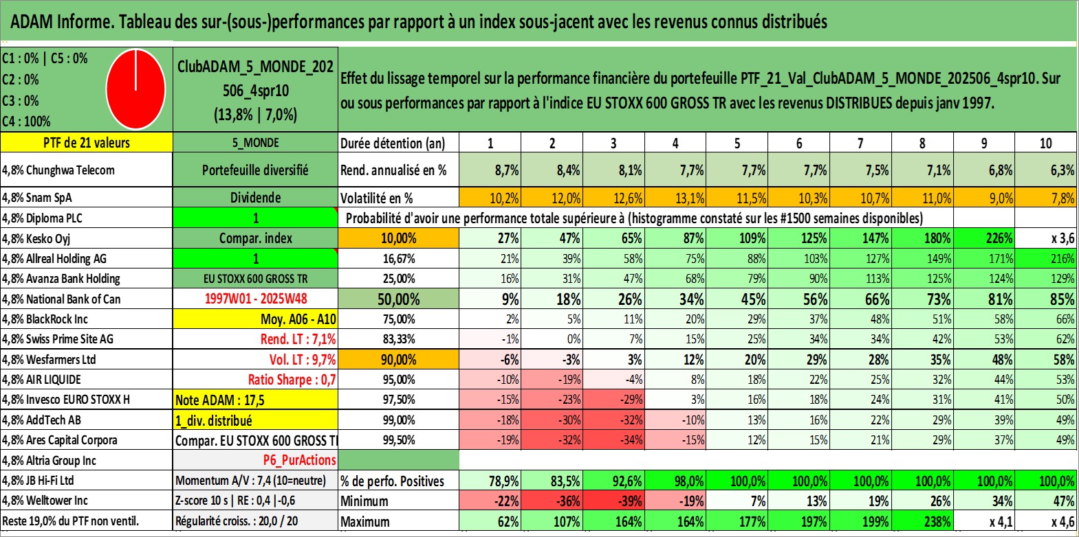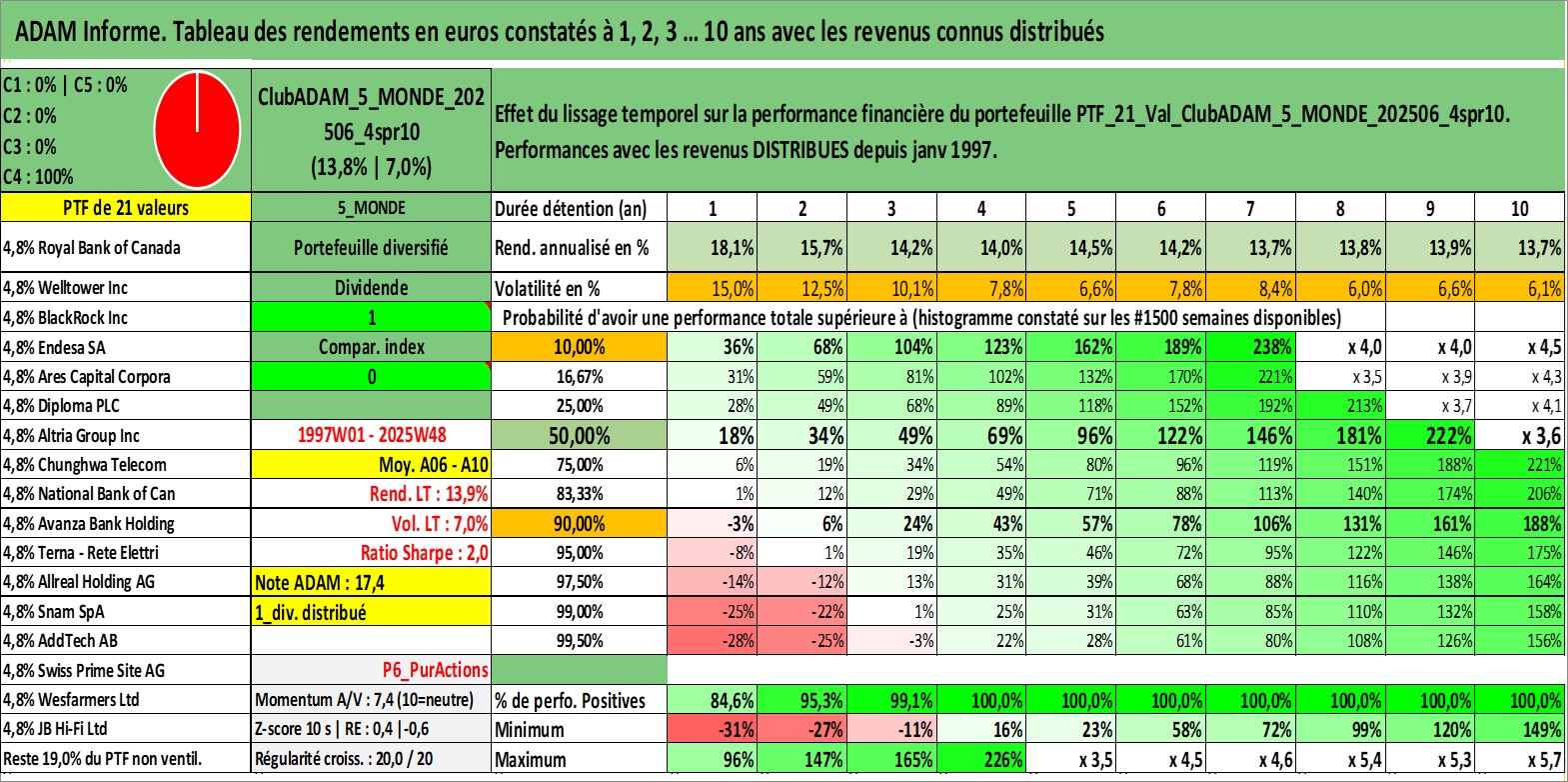 Site dédié aux investisseursPage dédiée sur site financeAnalyse des valorisations hebdomadaires du portefeuille ClubADAM_5_MONDE_202506_4spr10_21actifs avec un profil P6_PurActions. Ce portefeuille est cote en EUR. Les valorisations couvrent les semaines 1997W01 a 2025W48. Les revenus de cet actif financier sont pris en compte depuis la semaine 1997W01. La note globale ESG de cet actif est estimee a 13.0 (apres rebasage entre 0 et 20).