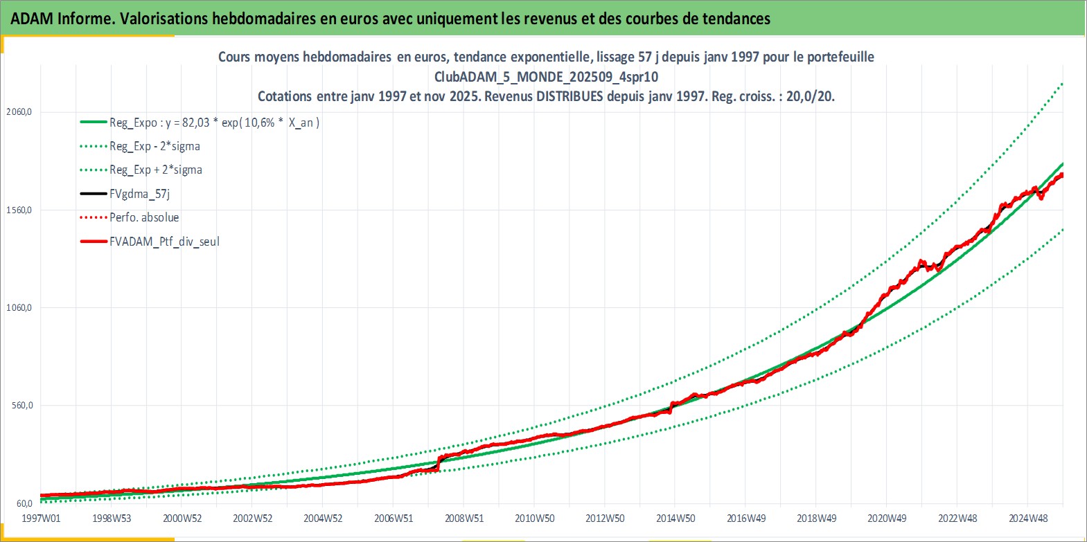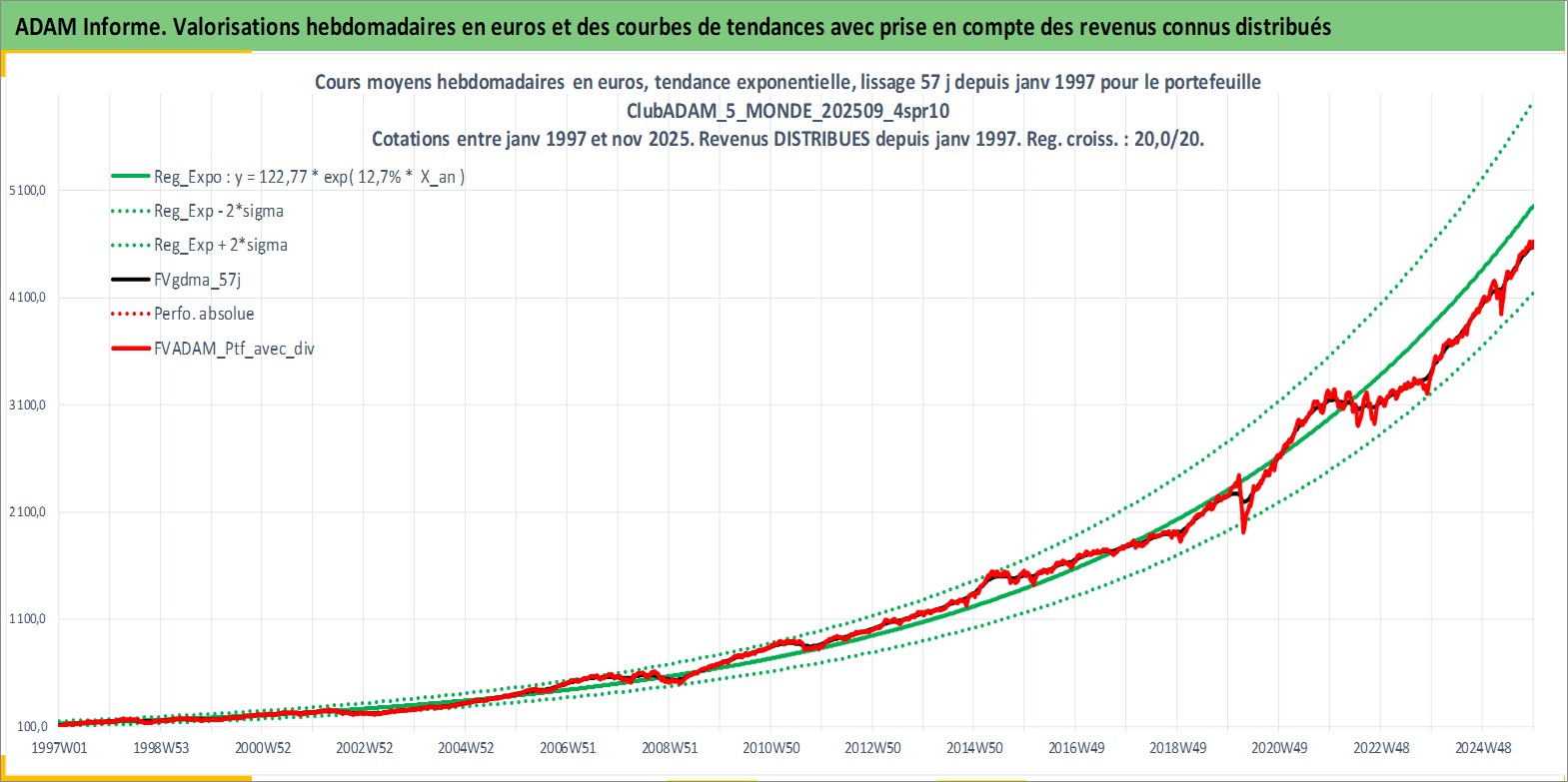 Site dédié aux investisseursPage dédiée sur site financeAnalyse des valorisations hebdomadaires du portefeuille ClubADAM_5_MONDE_202509_4spr10_25actifs avec un profil P6_PurActions. Ce portefeuille est cote en EUR. Les valorisations couvrent les semaines 1997W01 a 2025W48. Les revenus de cet actif financier sont pris en compte depuis la semaine 1997W01. La note globale ESG de cet actif est estimee a 12.1 (apres rebasage entre 0 et 20).