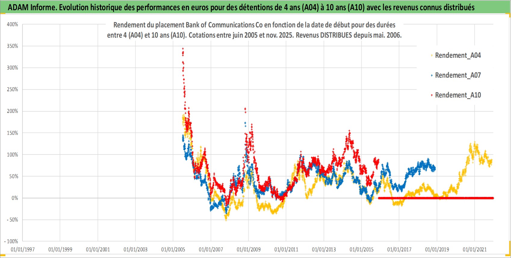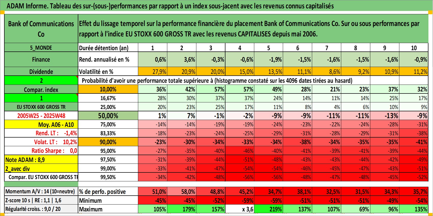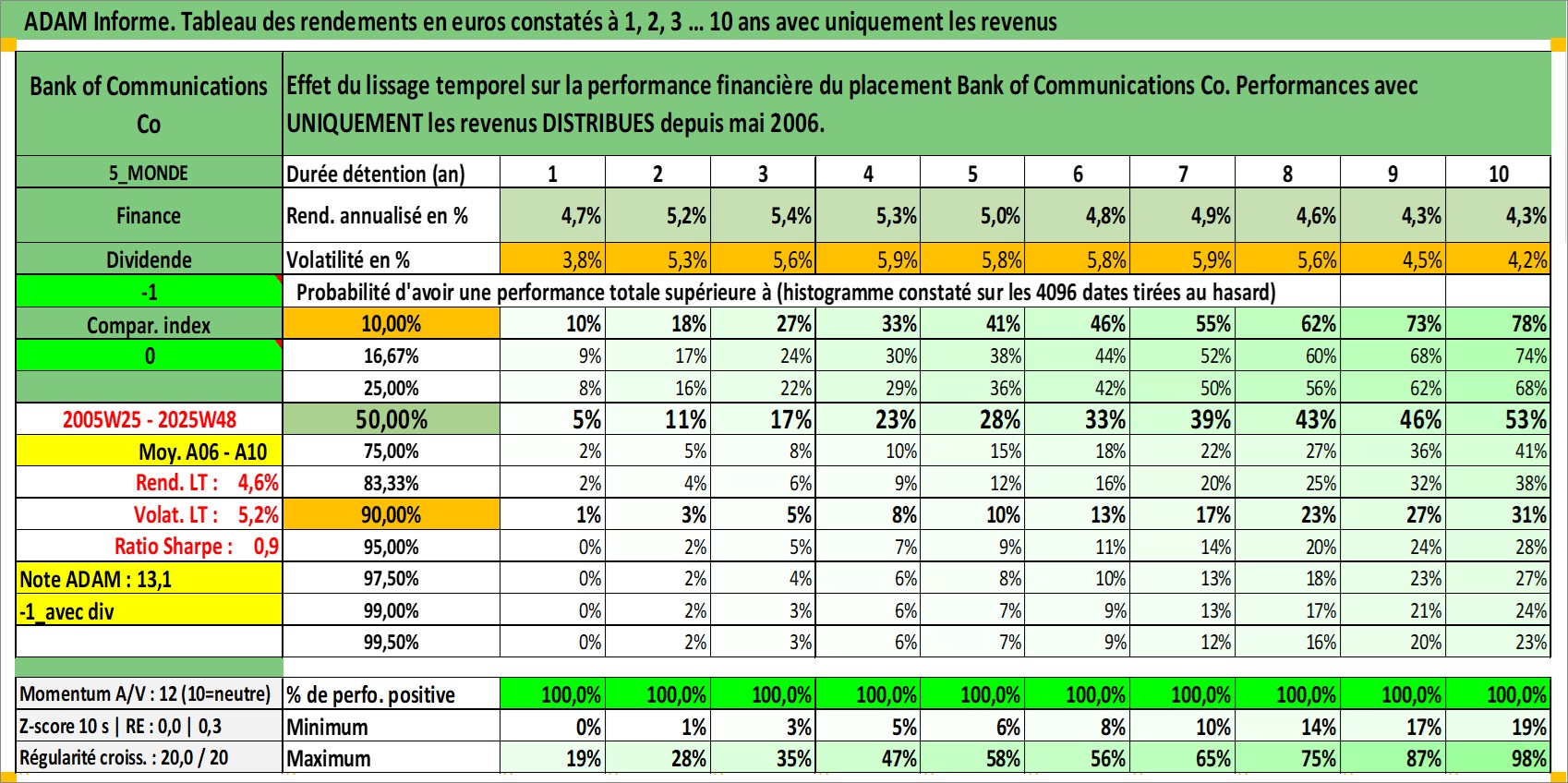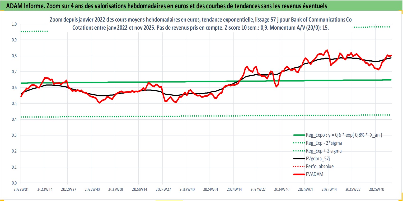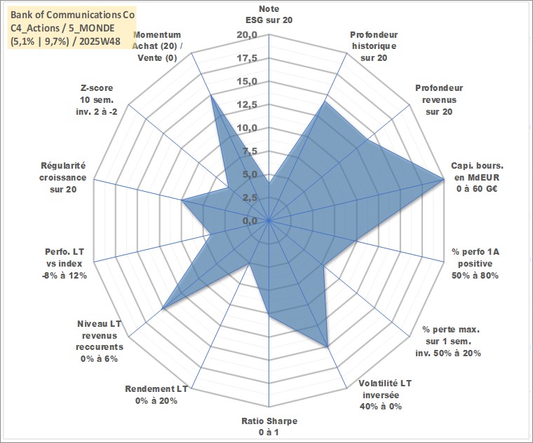 Site dédié aux investisseursPage dédiée sur site financeAnalyse des valorisations hebdomadaires de l'action Bank of Communications Co. Cet actif est cote en HKD. Les valorisations sont en contrevaleur EURO et couvrent les semaines 2005W25 a 2025W48. Les revenus de cet actif financier sont pris en compte depuis la semaine 2006W22. La note globale ESG de cet actif est estimee a 4.0 (apres rebasage entre 0 et 20).