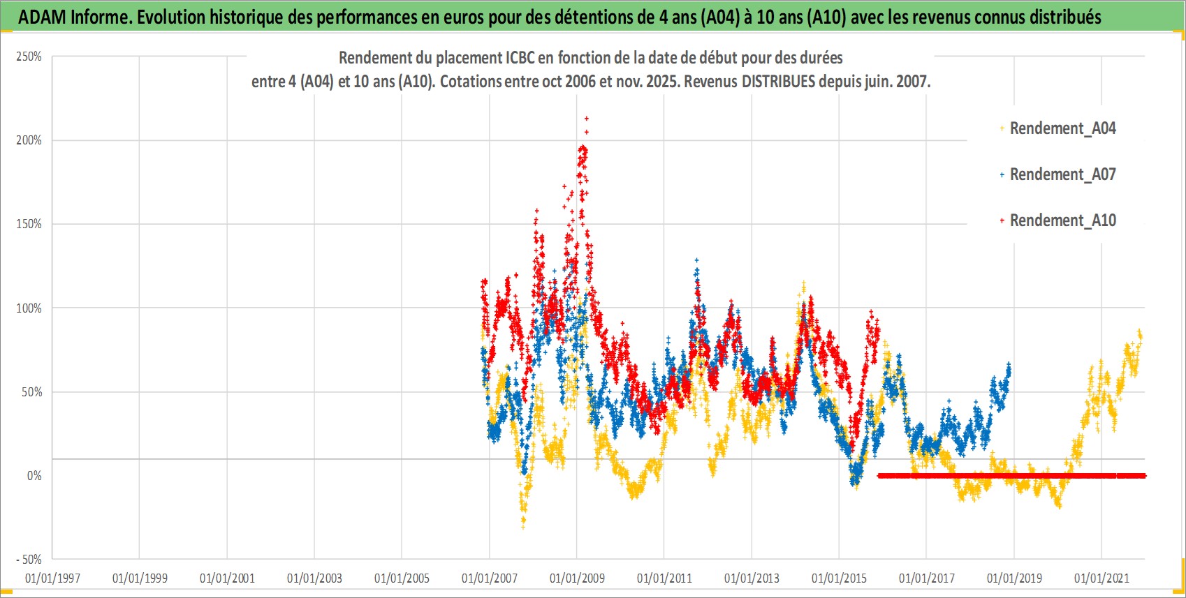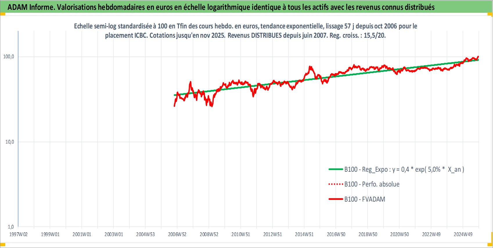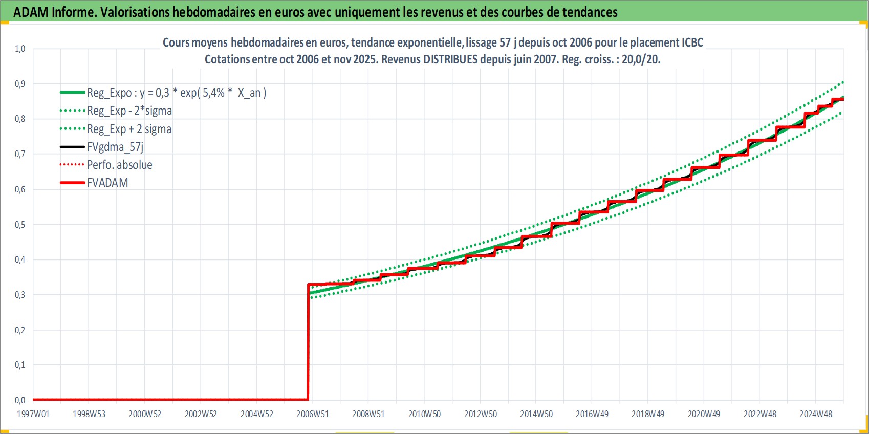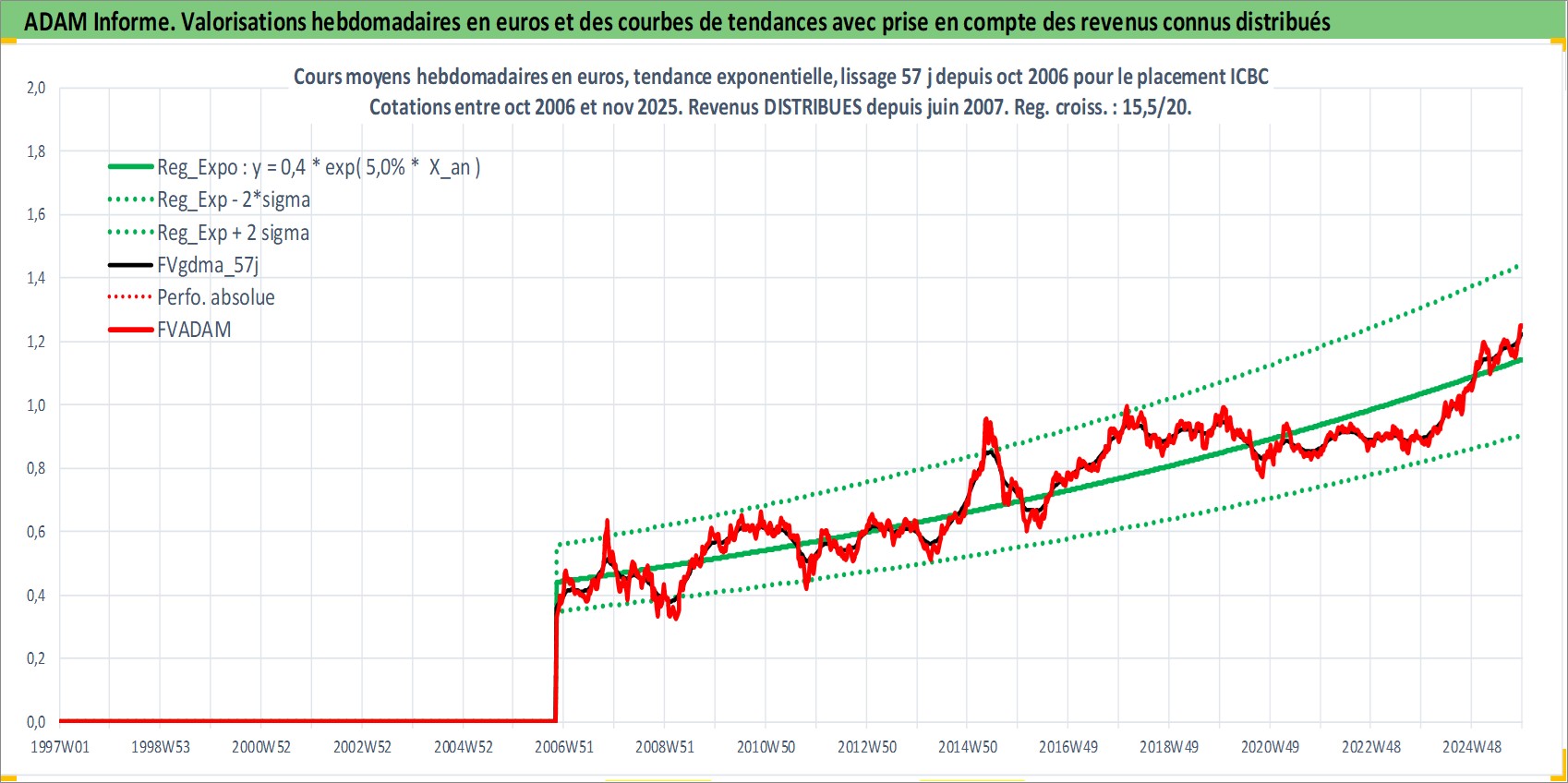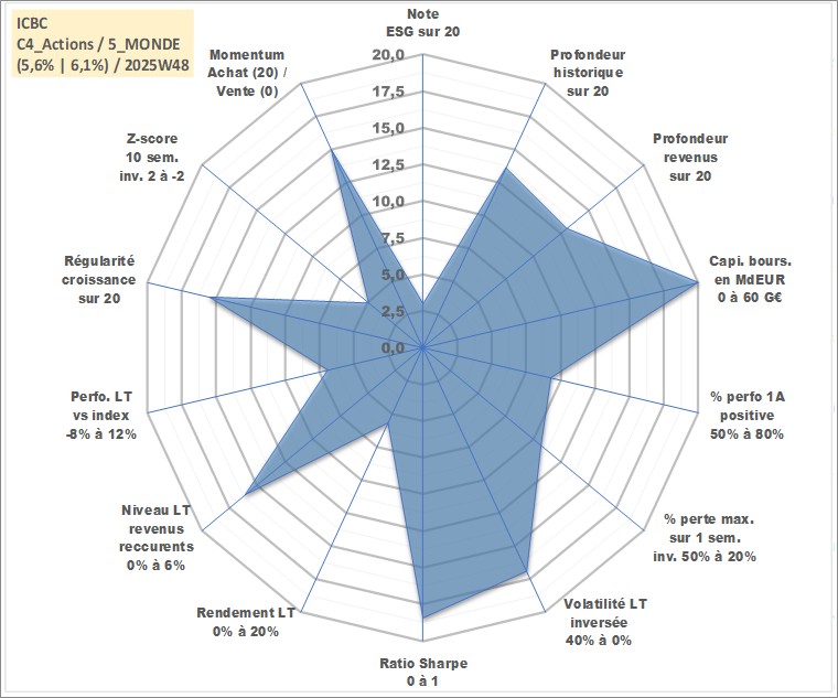 Site dédié aux investisseursPage dédiée sur site financeAnalyse des valorisations hebdomadaires de l'action ICBC. Cet actif est cote en HKD. Les valorisations sont en contrevaleur EURO et couvrent les semaines 2006W43 a 2025W48. Les revenus de cet actif financier sont pris en compte depuis la semaine 2007W24. La note globale ESG de cet actif est estimee a 3.0 (apres rebasage entre 0 et 20).