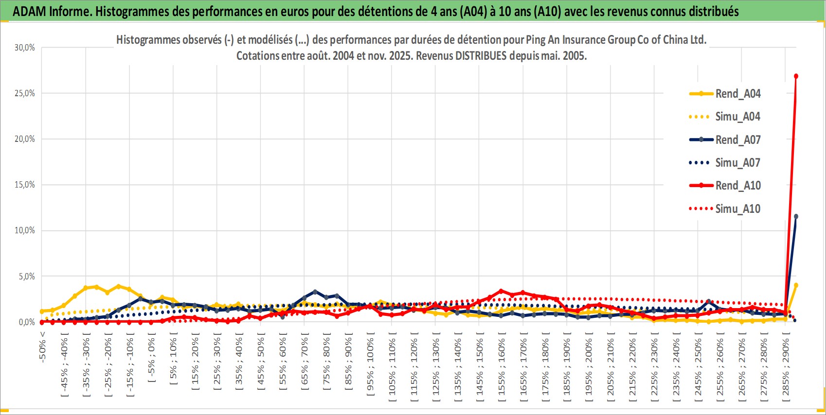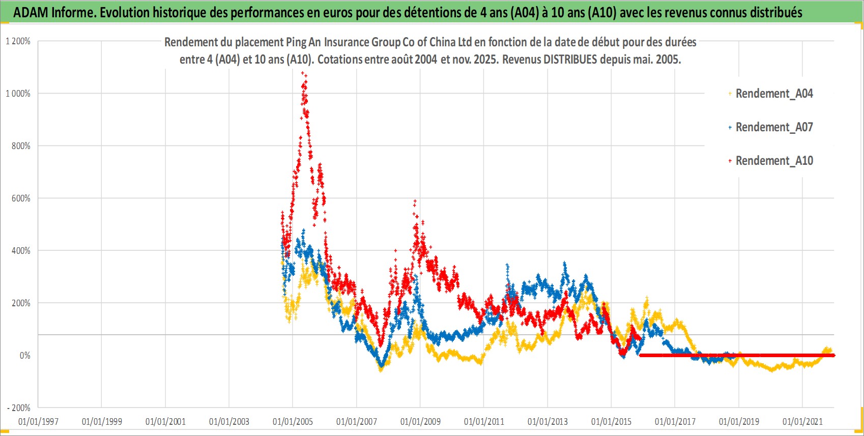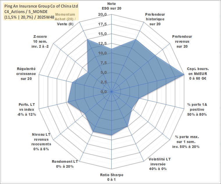 Site dédié aux investisseursPage dédiée sur site financeAnalyse des valorisations hebdomadaires de l'action Ping An Insurance Group Co of China Ltd. Cet actif est cote en HKD. Les valorisations sont en contrevaleur EURO et couvrent les semaines 2004W34 a 2025W48. Les revenus de cet actif financier sont pris en compte depuis la semaine 2005W20. La note globale ESG de cet actif est estimee a 11.0 (apres rebasage entre 0 et 20).