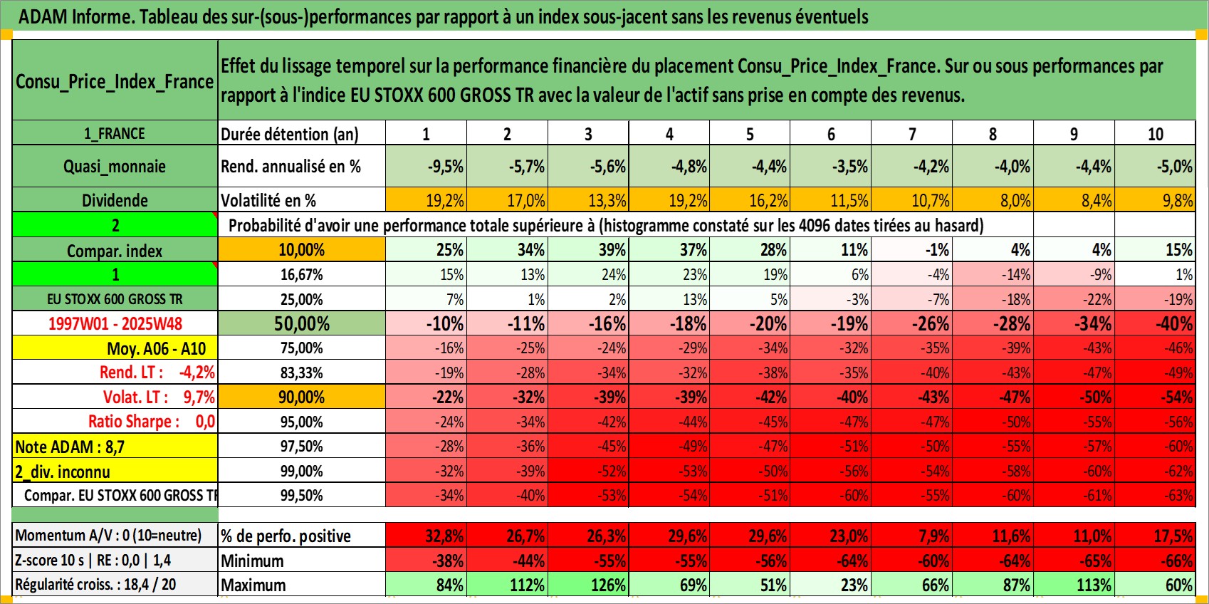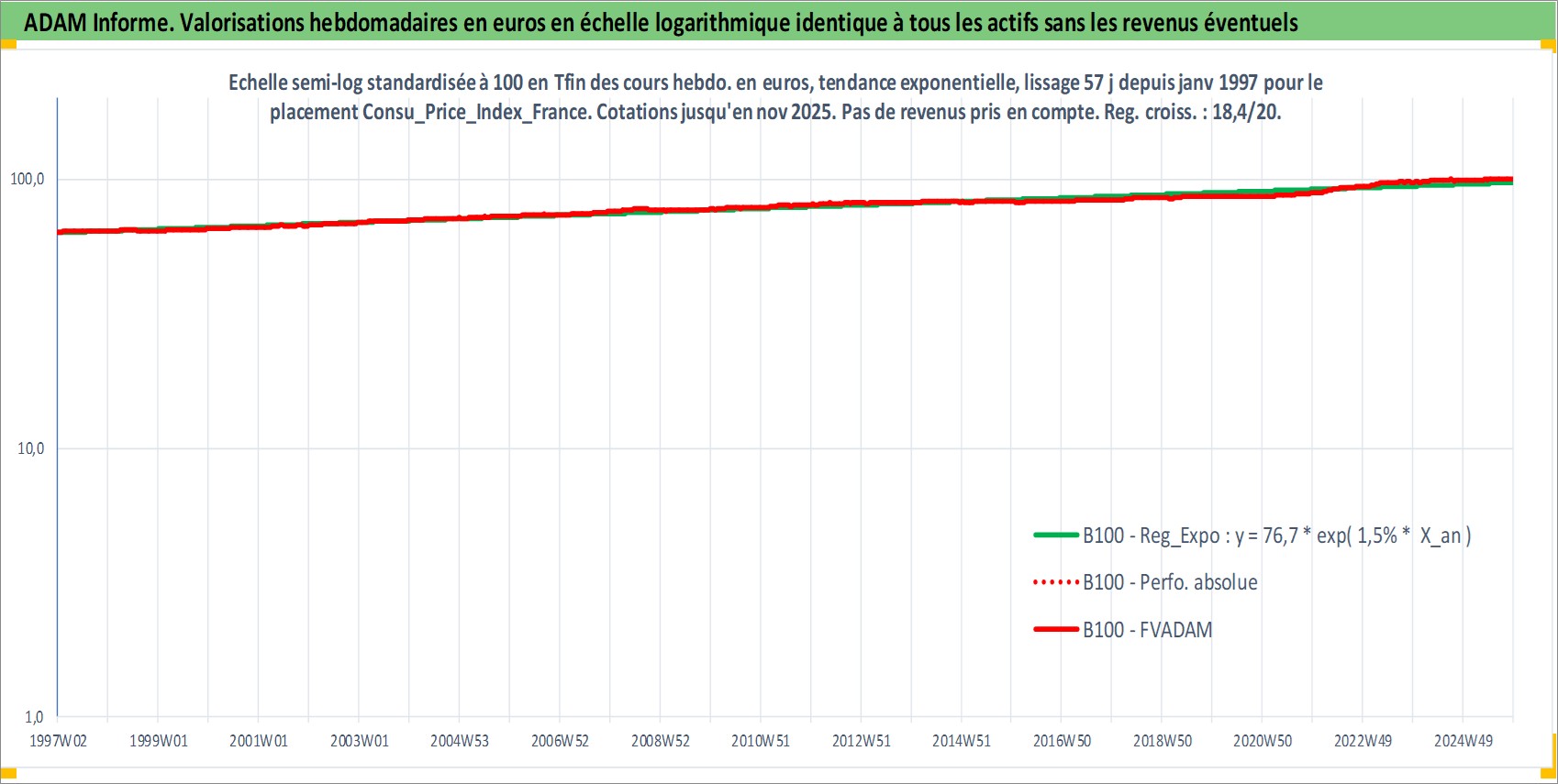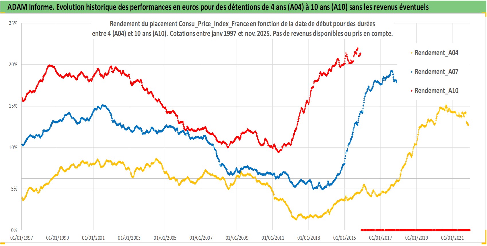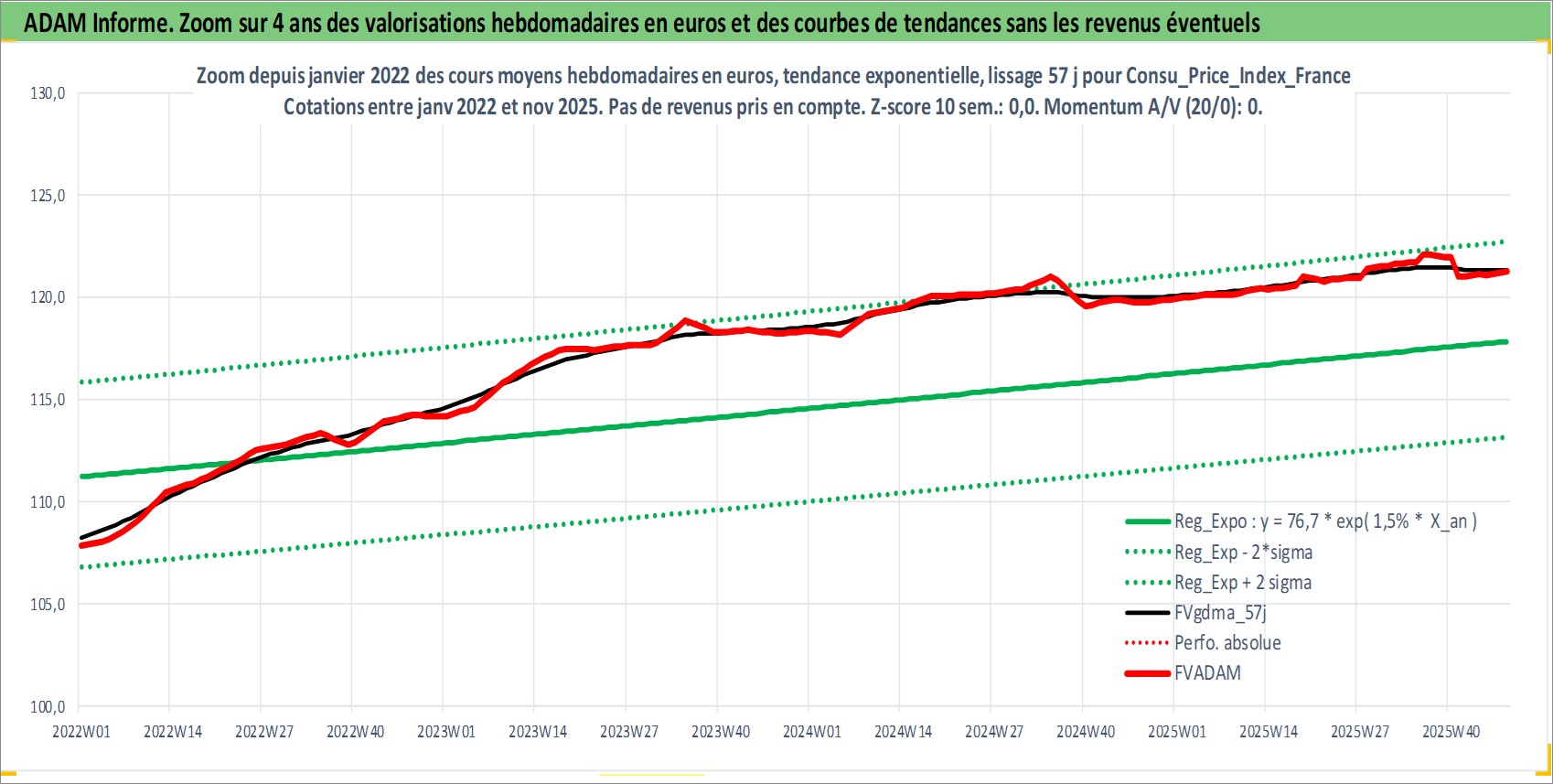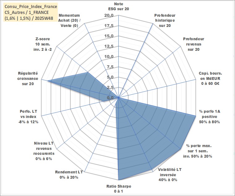 Site dédié aux investisseursPage dédiée sur site financeAnalyse des valorisations hebdomadaires de l'action Consu_Price_Index_France. Cet actif est cote en EUR. Les valorisations couvrent les semaines 1997W01 a 2025W48. Les revenus de cet actif financier ne sont pas connus car non existants ou non disponibles sur le site Yahoo Finance. La note ESG de cet actif n'est pas connue.