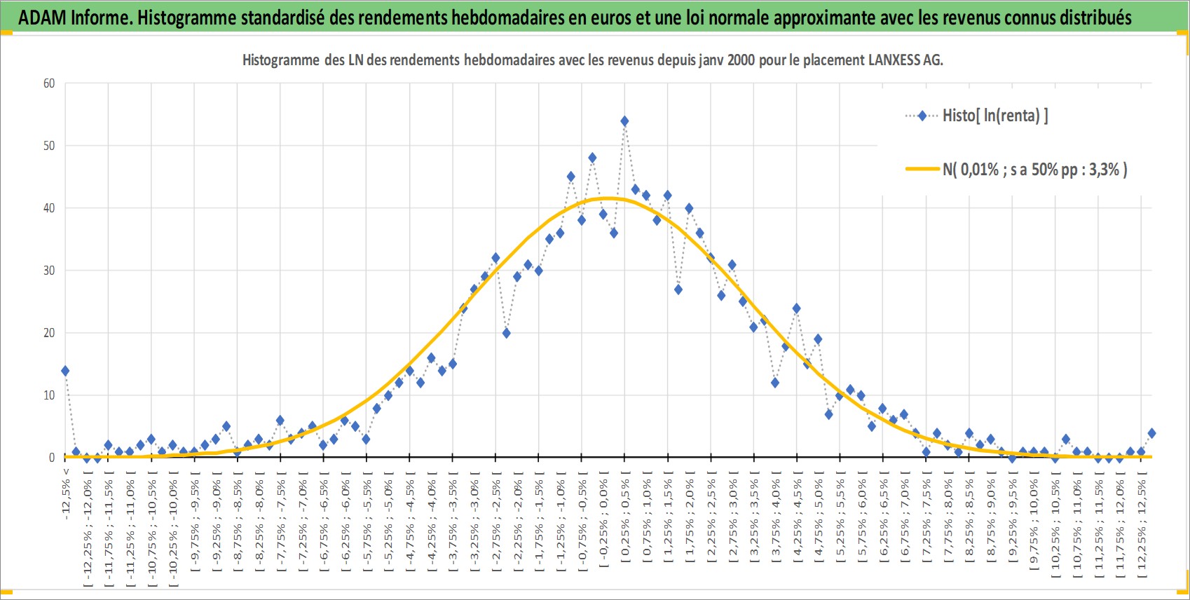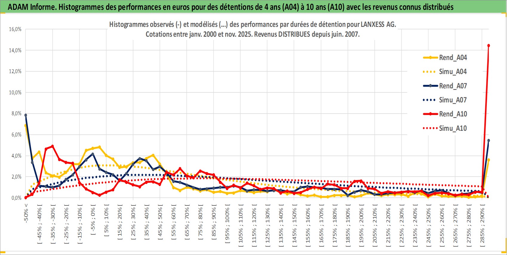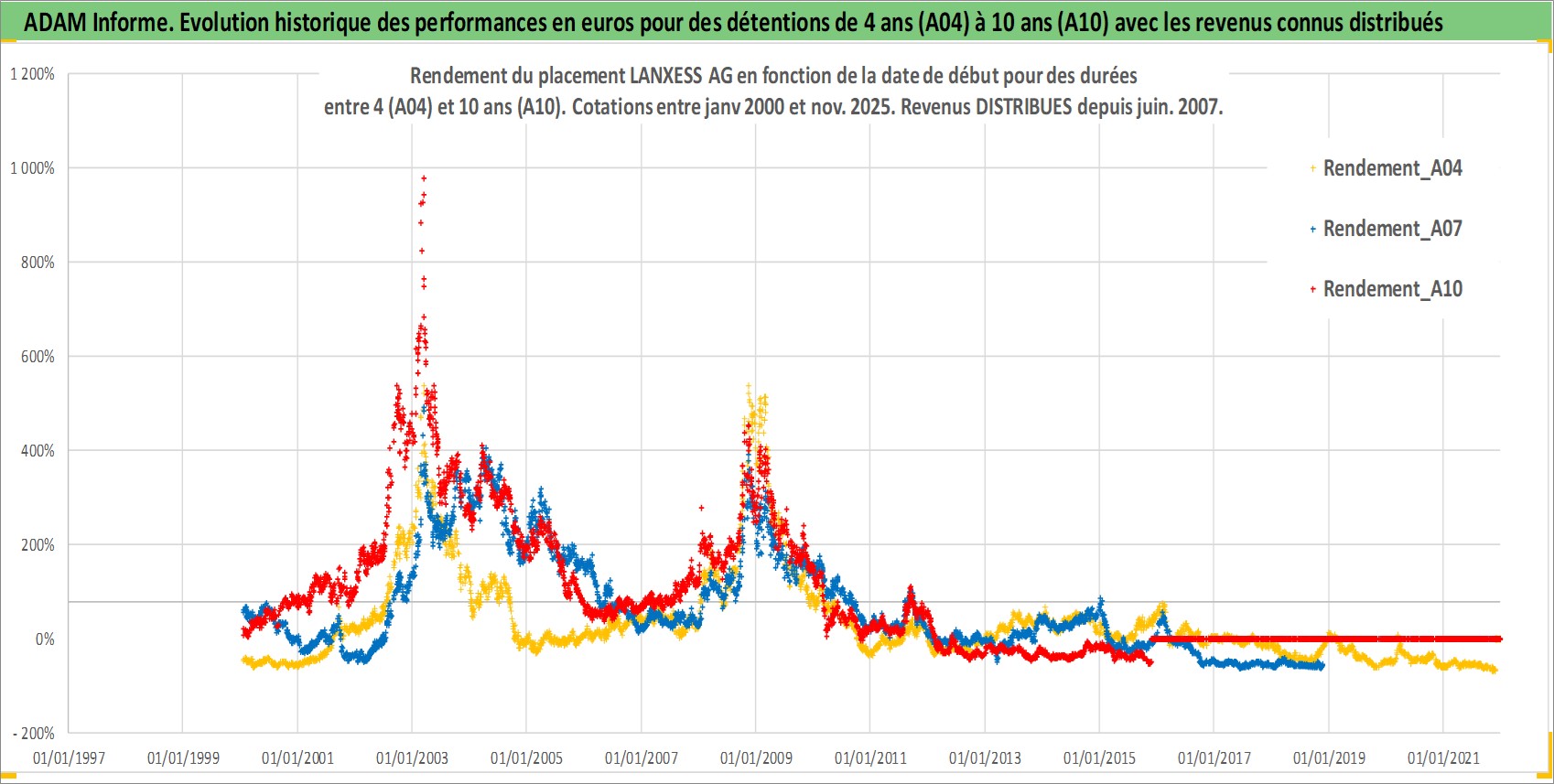 Site dédié aux investisseursPage dédiée sur site financeAnalyse des valorisations hebdomadaires de l'action LANXESS AG. Cet actif est cote en EUR. Les valorisations couvrent les semaines 2000W01 a 2025W48. Les revenus de cet actif financier sont pris en compte depuis la semaine 2007W22. La note globale ESG de cet actif est estimee a 7.0 (apres rebasage entre 0 et 20).