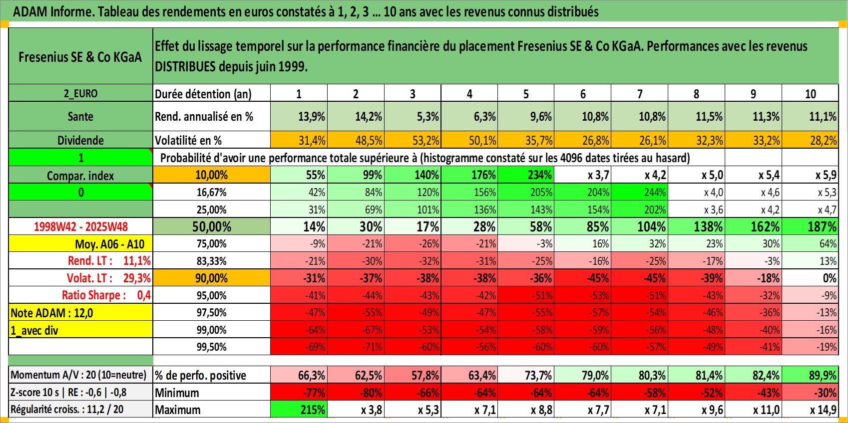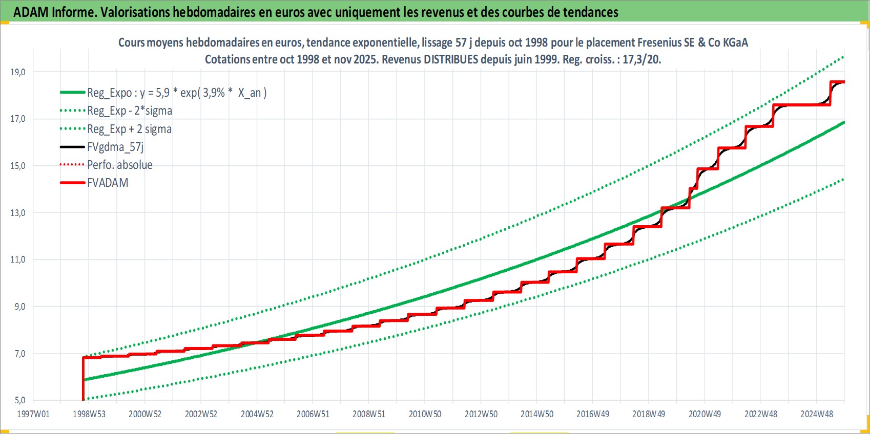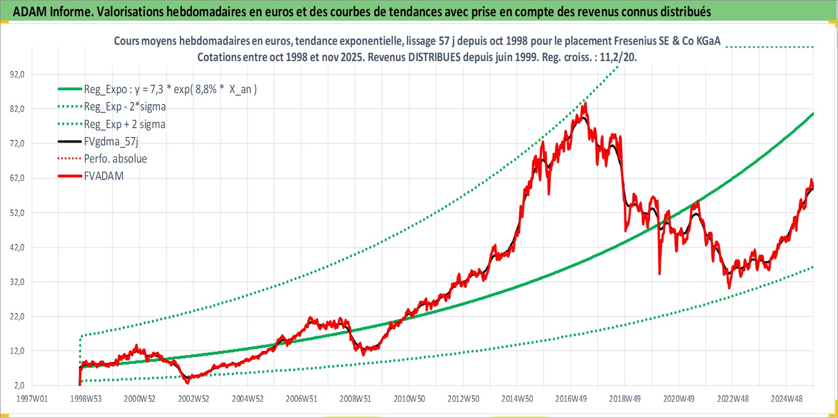 Site dédié aux investisseursPage dédiée sur site financeAnalyse des valorisations hebdomadaires de l'action Fresenius SE & Co KGaA. Cet actif est cote en EUR. Les valorisations couvrent les semaines 1998W42 a 2025W48. Les revenus de cet actif financier sont pris en compte depuis la semaine 1999W23. La note globale ESG de cet actif est estimee a 10.0 (apres rebasage entre 0 et 20).