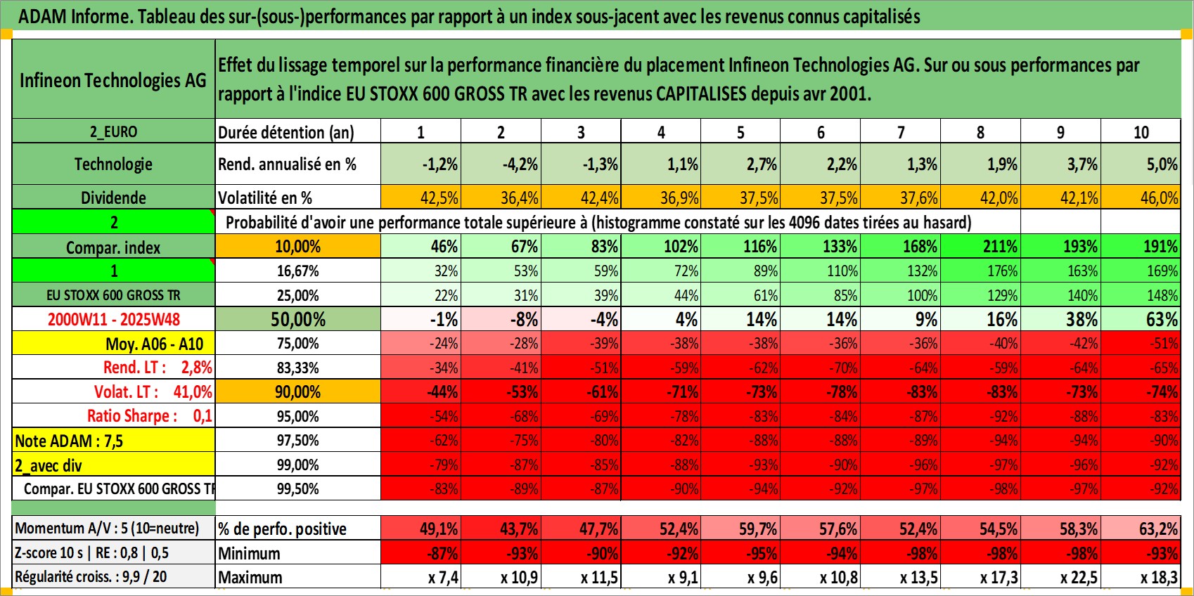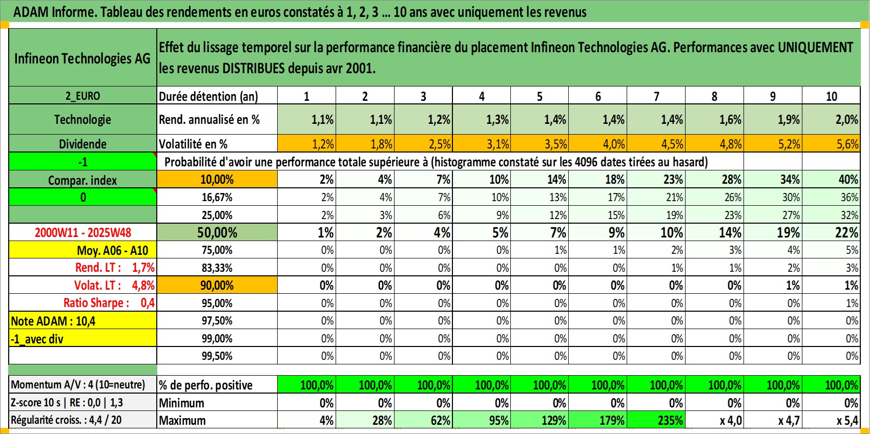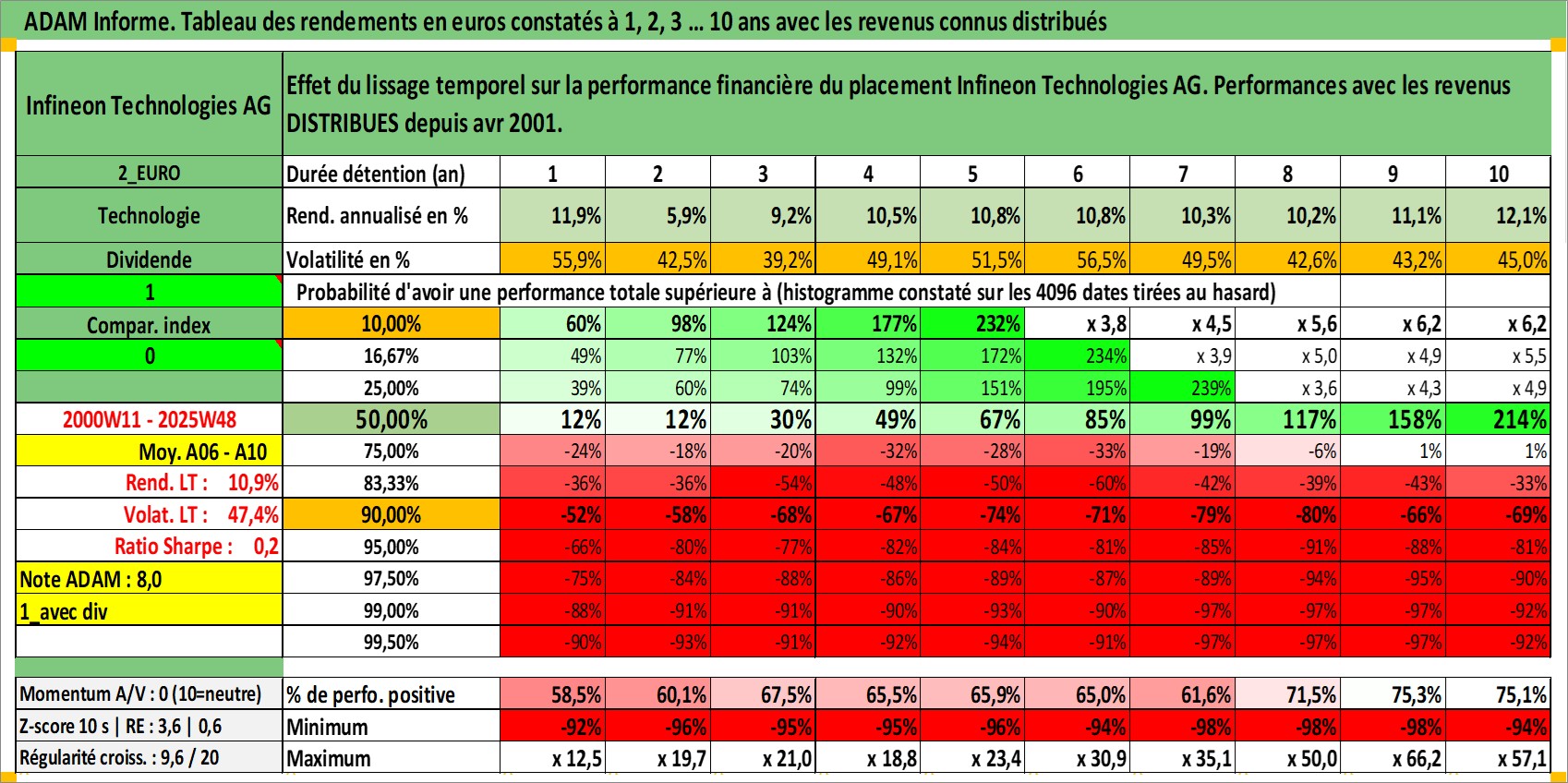 Site dédié aux investisseursPage dédiée sur site financeAnalyse des valorisations hebdomadaires de l'action Infineon Technologies AG. Cet actif est cote en EUR. Les valorisations couvrent les semaines 2000W11 a 2025W48. Les revenus de cet actif financier sont pris en compte depuis la semaine 2001W15. La note globale ESG de cet actif est estimee a 11.0 (apres rebasage entre 0 et 20).