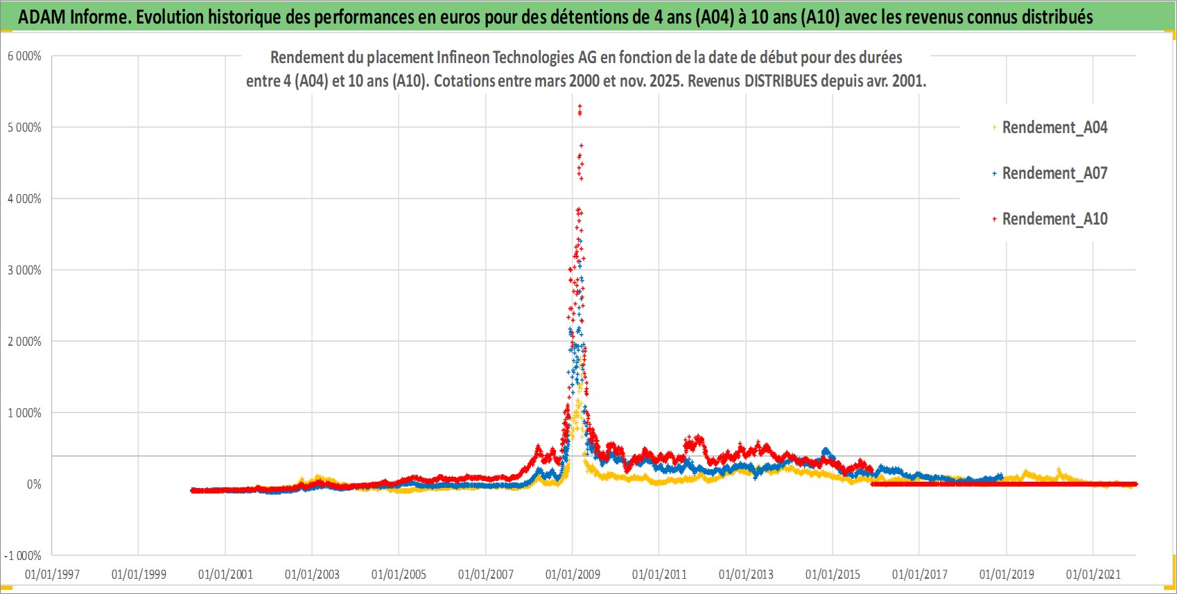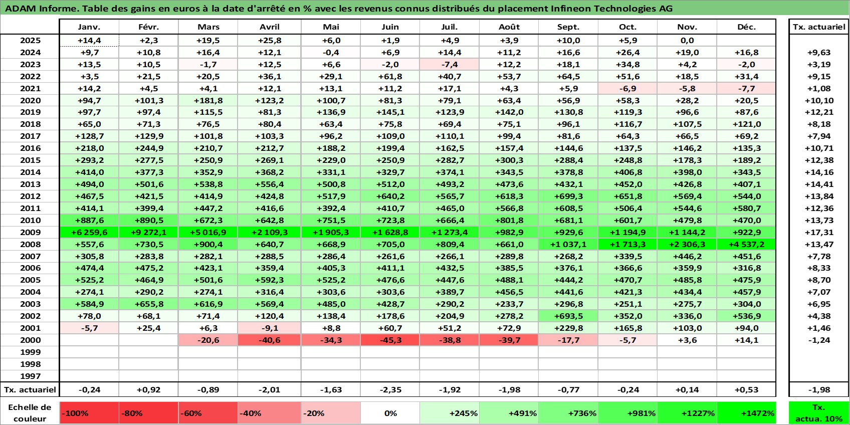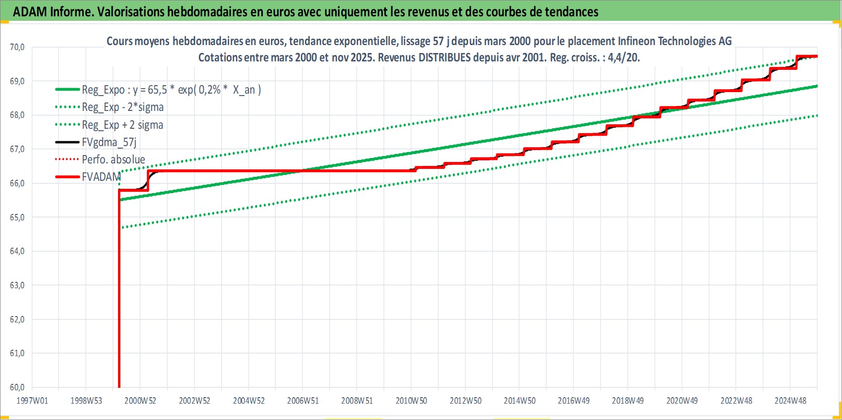 Site dédié aux investisseursPage dédiée sur site financeAnalyse des valorisations hebdomadaires de l'action Infineon Technologies AG. Cet actif est cote en EUR. Les valorisations couvrent les semaines 2000W11 a 2025W48. Les revenus de cet actif financier sont pris en compte depuis la semaine 2001W15. La note globale ESG de cet actif est estimee a 11.0 (apres rebasage entre 0 et 20).