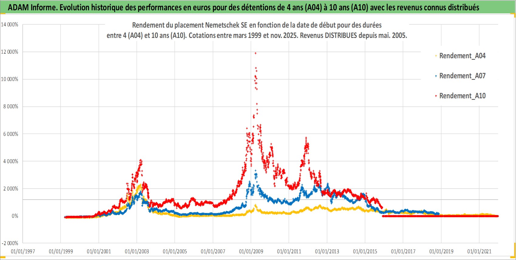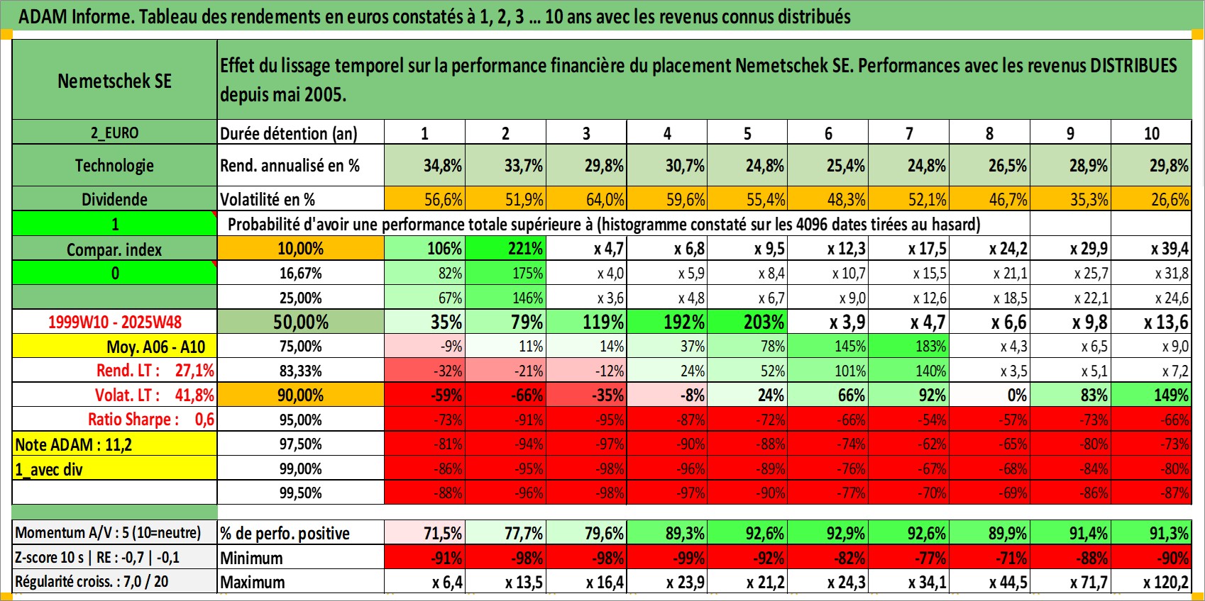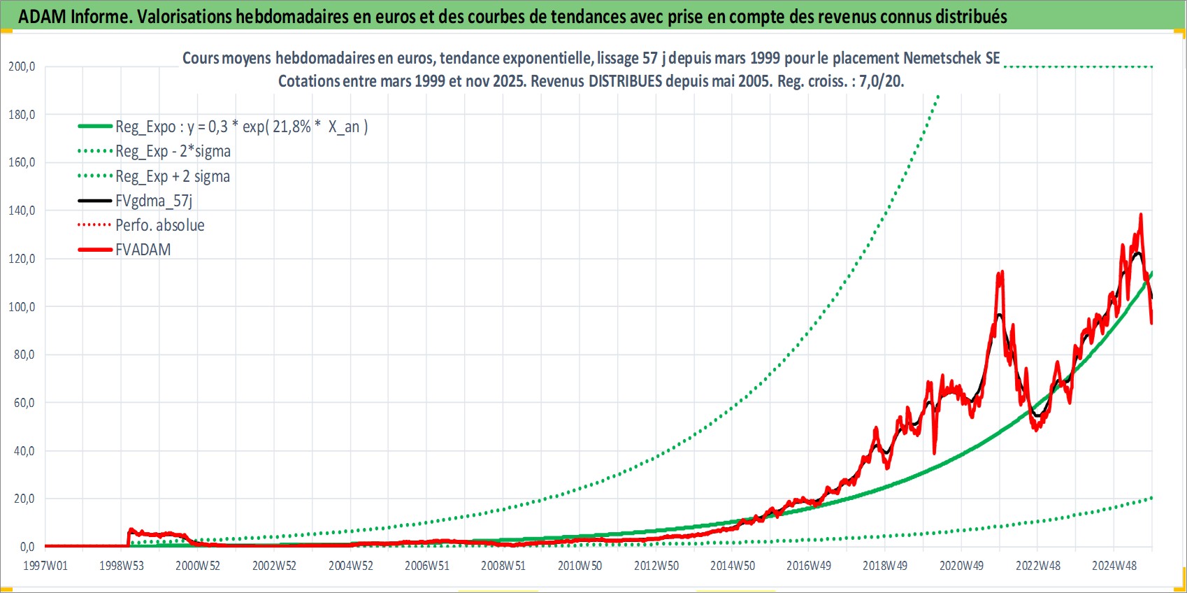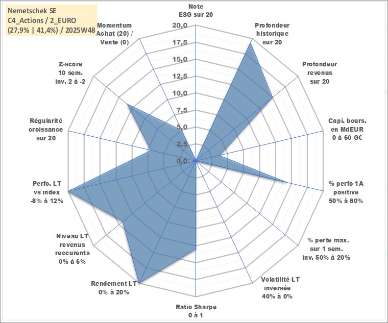 Site dédié aux investisseursPage dédiée sur site financeAnalyse des valorisations hebdomadaires de l'action Nemetschek SE. Cet actif est cote en EUR. Les valorisations couvrent les semaines 1999W10 a 2025W48. Les revenus de cet actif financier sont pris en compte depuis la semaine 2005W21. La note ESG de cet actif n'est pas connue.