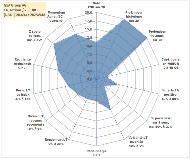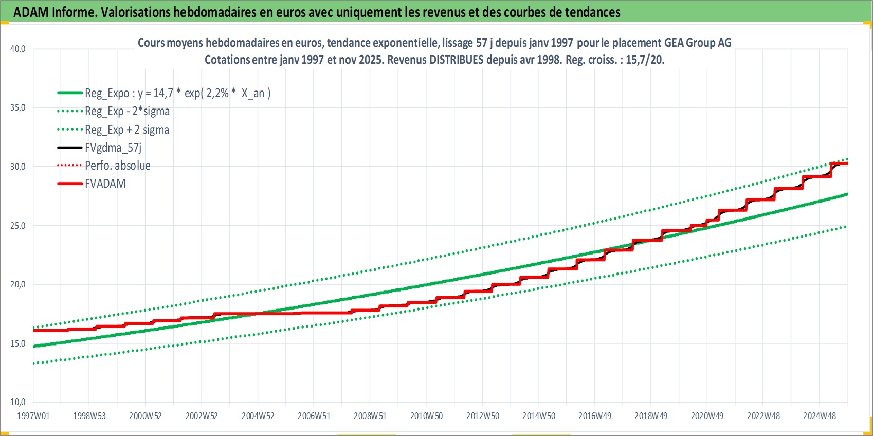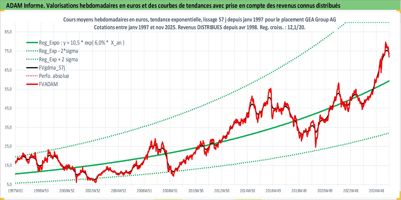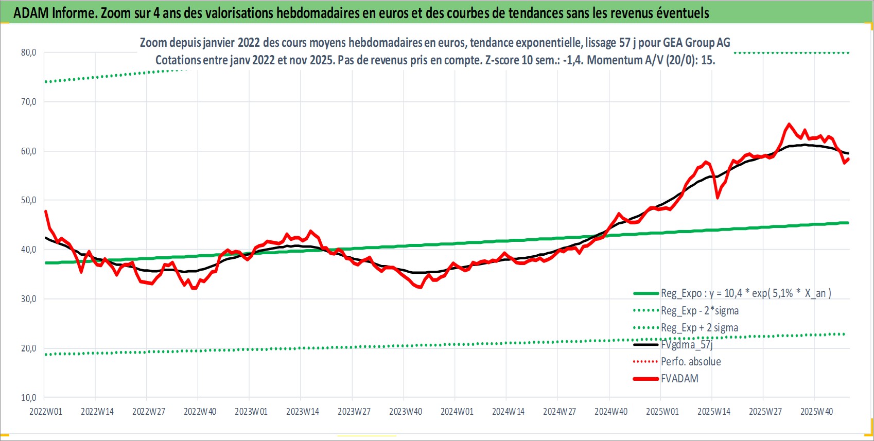 Site dédié aux investisseursPage dédiée sur site financeAnalyse des valorisations hebdomadaires de l'action GEA Group AG. Cet actif est cote en EUR. Les valorisations couvrent les semaines 1997W01 a 2025W48. Les revenus de cet actif financier sont pris en compte depuis la semaine 1998W14. La note globale ESG de cet actif est estimee a 11.0 (apres rebasage entre 0 et 20).