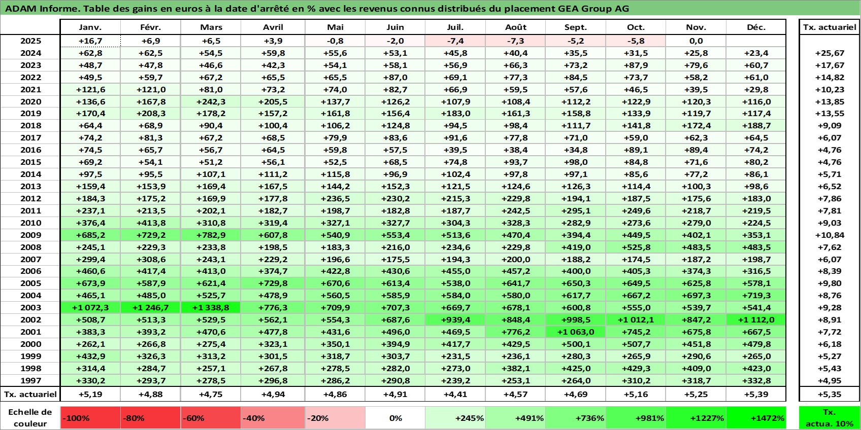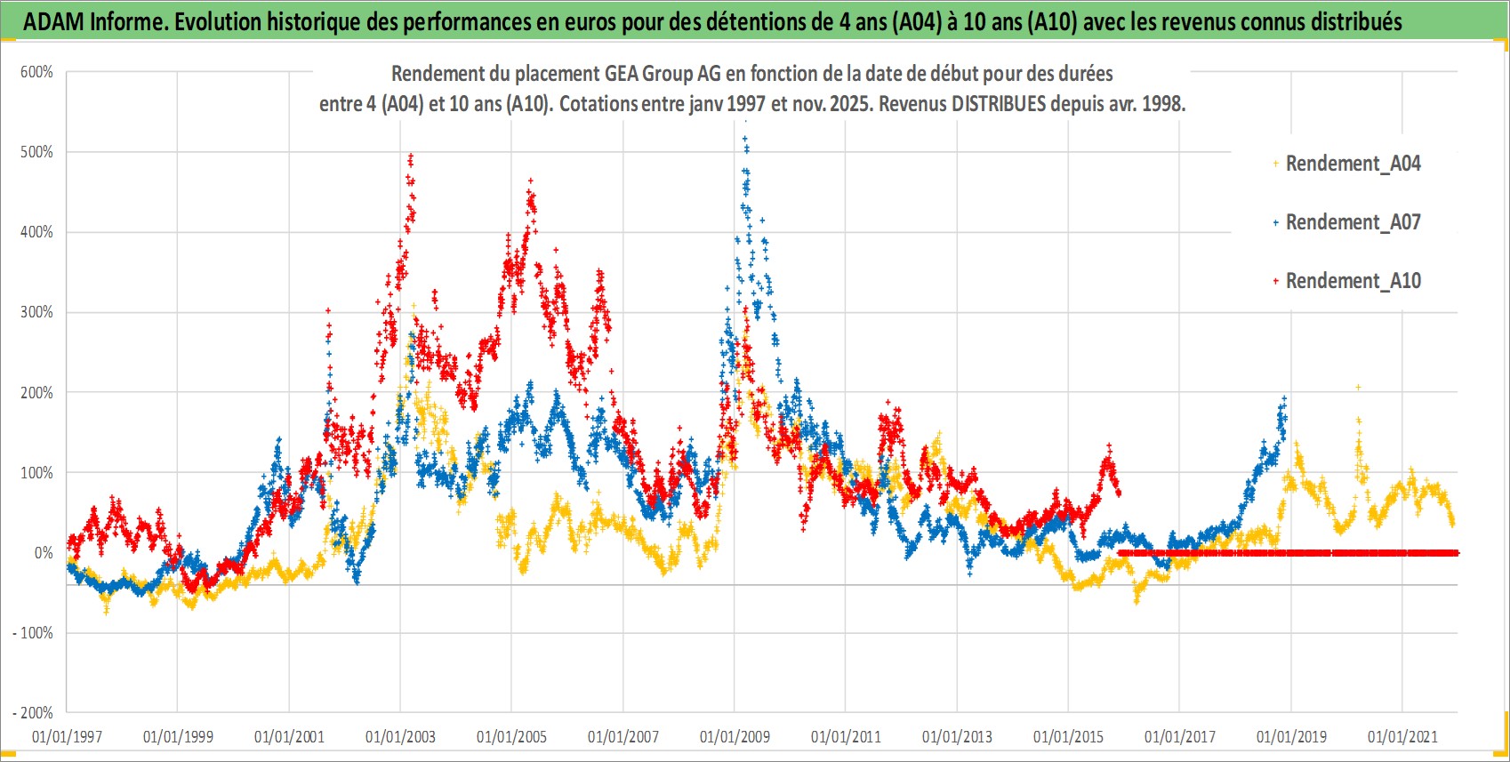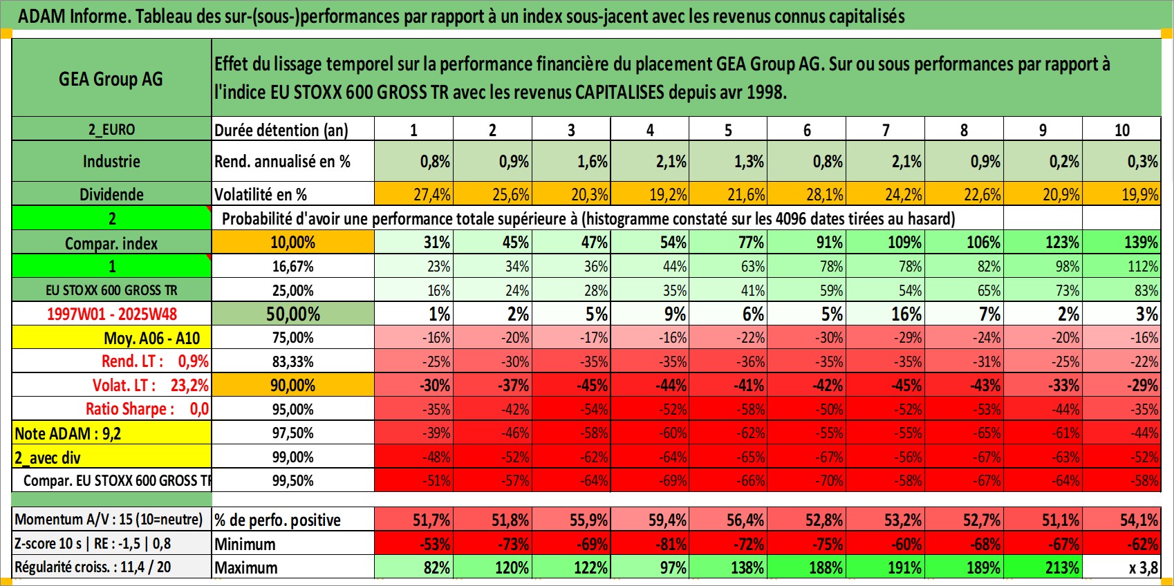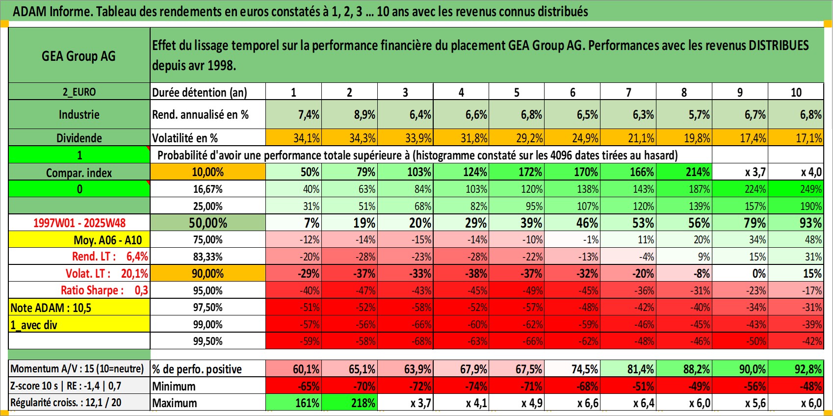 Site dédié aux investisseursPage dédiée sur site financeAnalyse des valorisations hebdomadaires de l'action GEA Group AG. Cet actif est cote en EUR. Les valorisations couvrent les semaines 1997W01 a 2025W48. Les revenus de cet actif financier sont pris en compte depuis la semaine 1998W14. La note globale ESG de cet actif est estimee a 11.0 (apres rebasage entre 0 et 20).