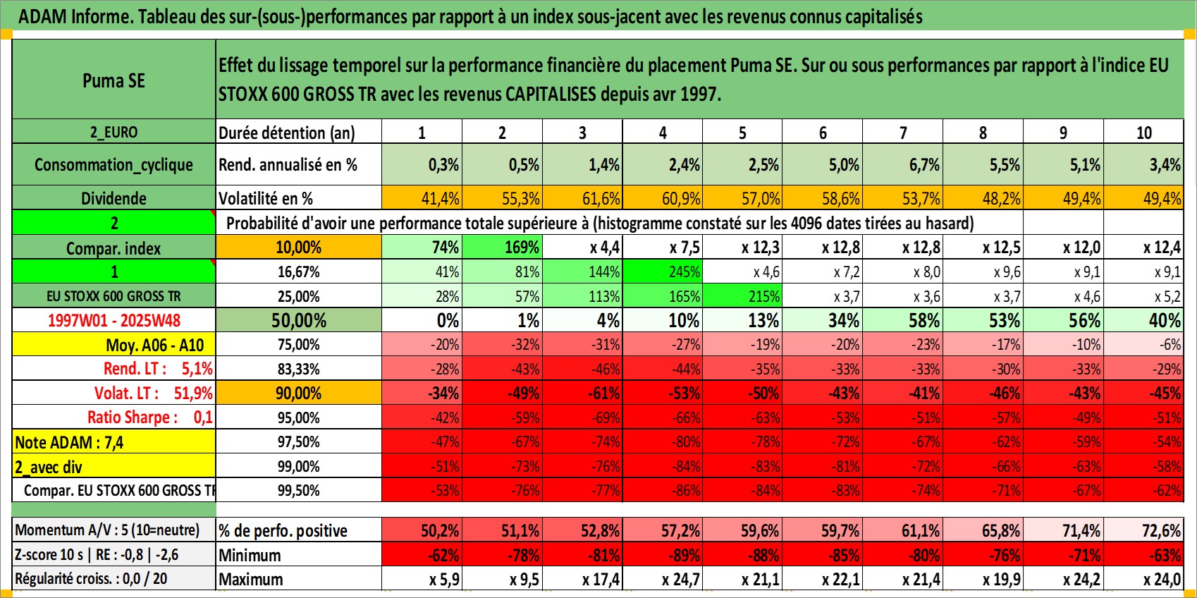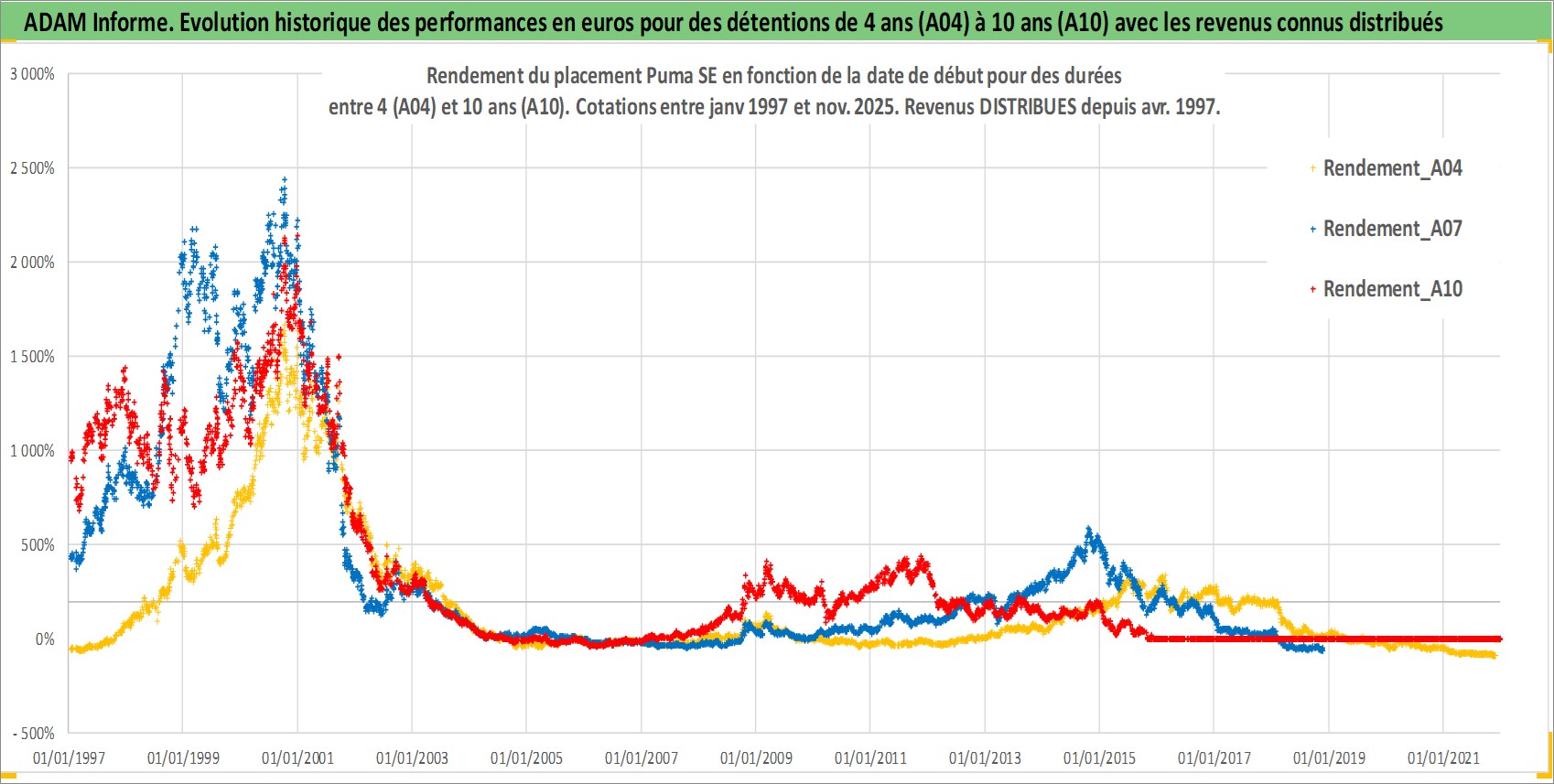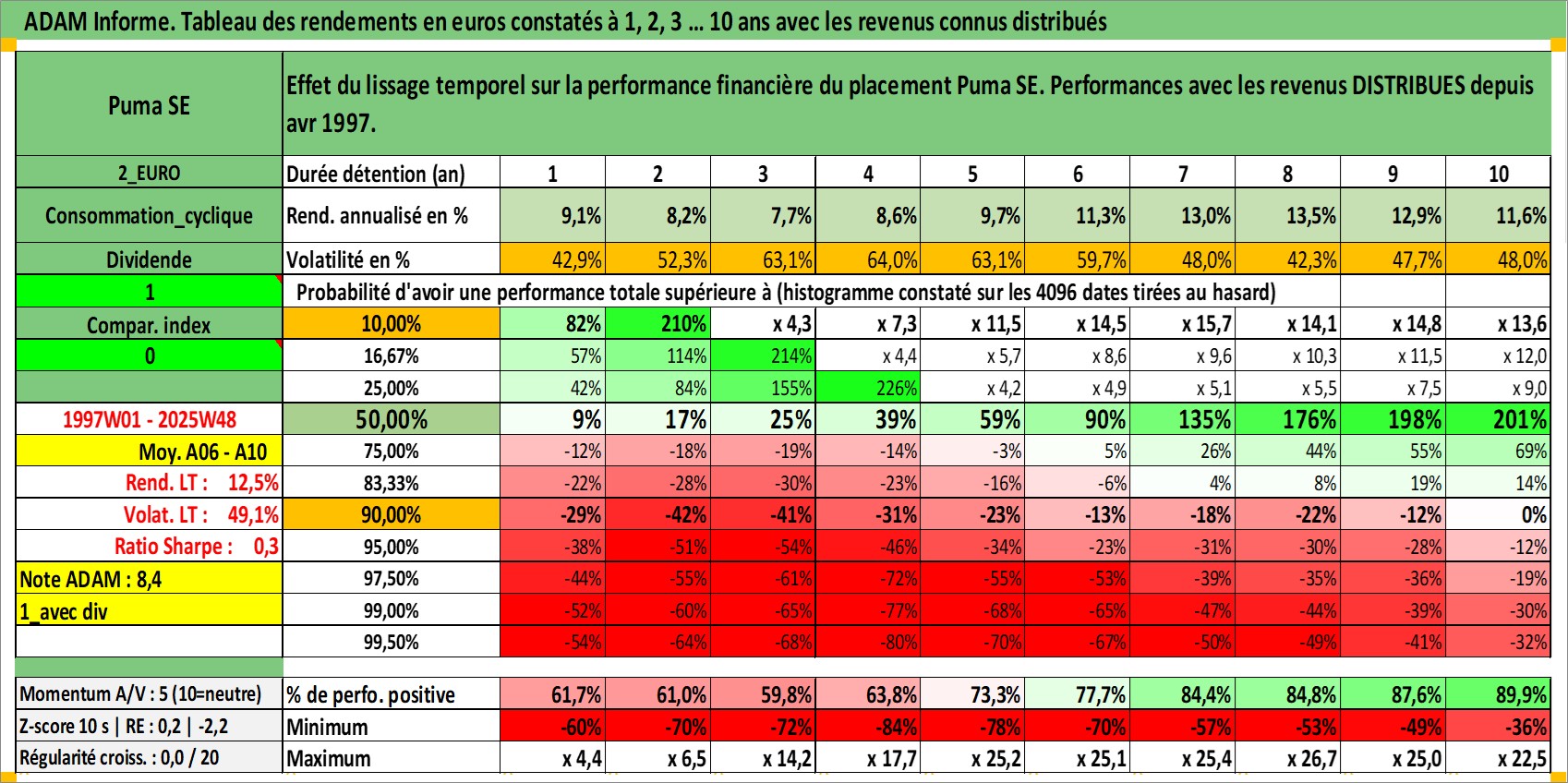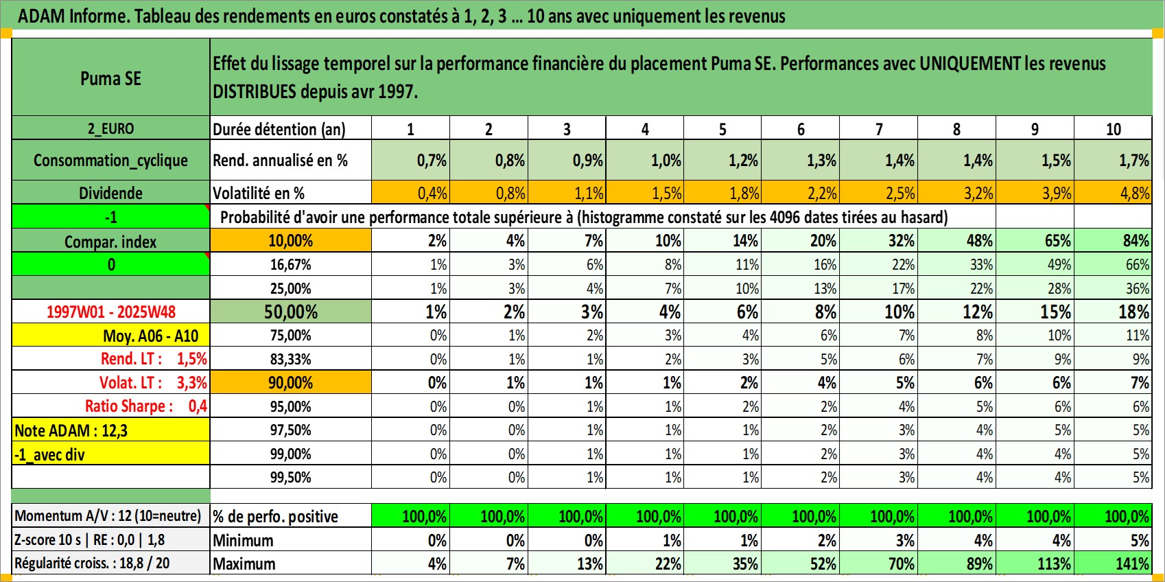 Site dédié aux investisseursPage dédiée sur site financeAnalyse des valorisations hebdomadaires de l'action Puma SE. Cet actif est cote en EUR. Les valorisations couvrent les semaines 1997W01 a 2025W48. Les revenus de cet actif financier sont pris en compte depuis la semaine 1997W17. La note ESG de cet actif n'est pas connue.
