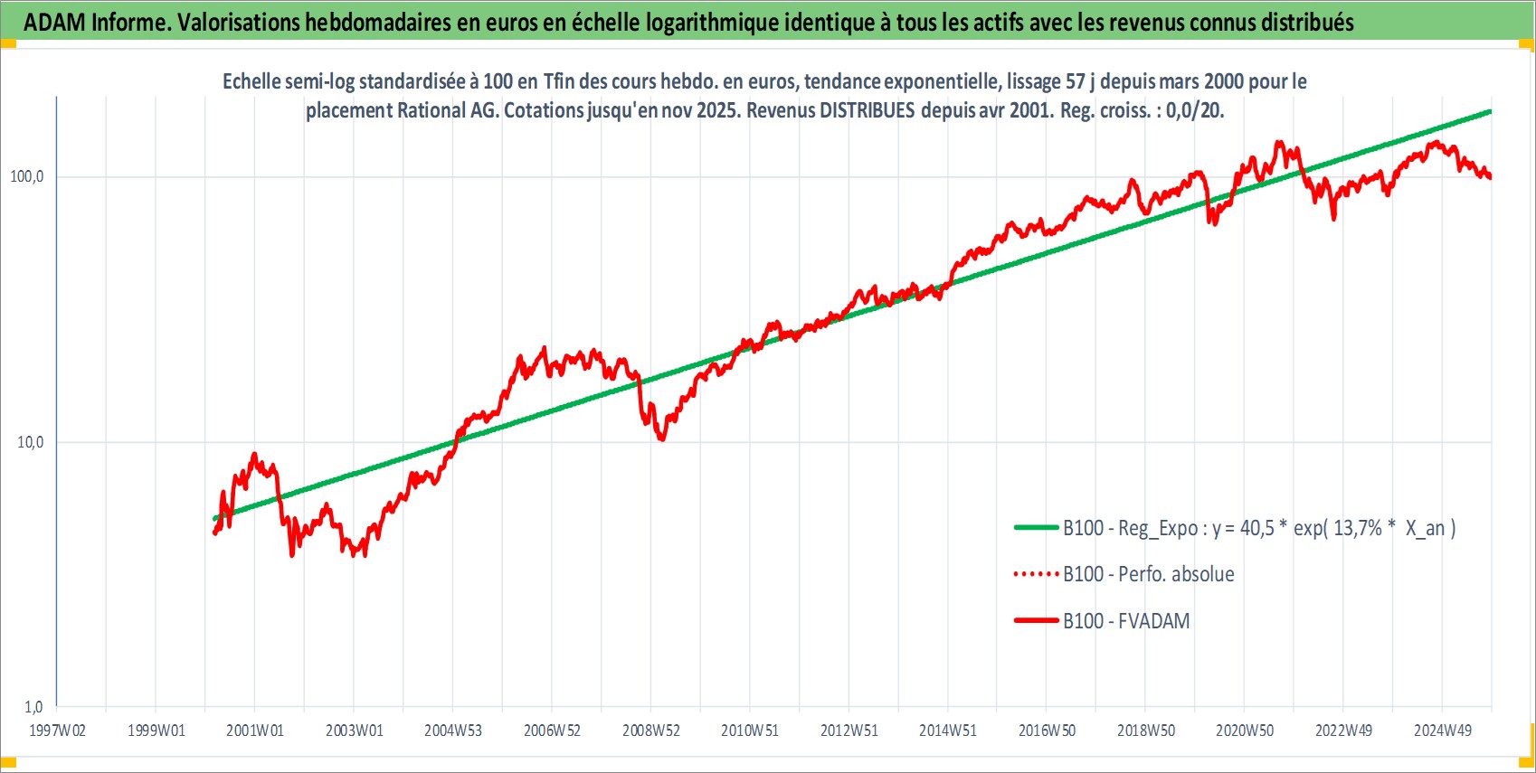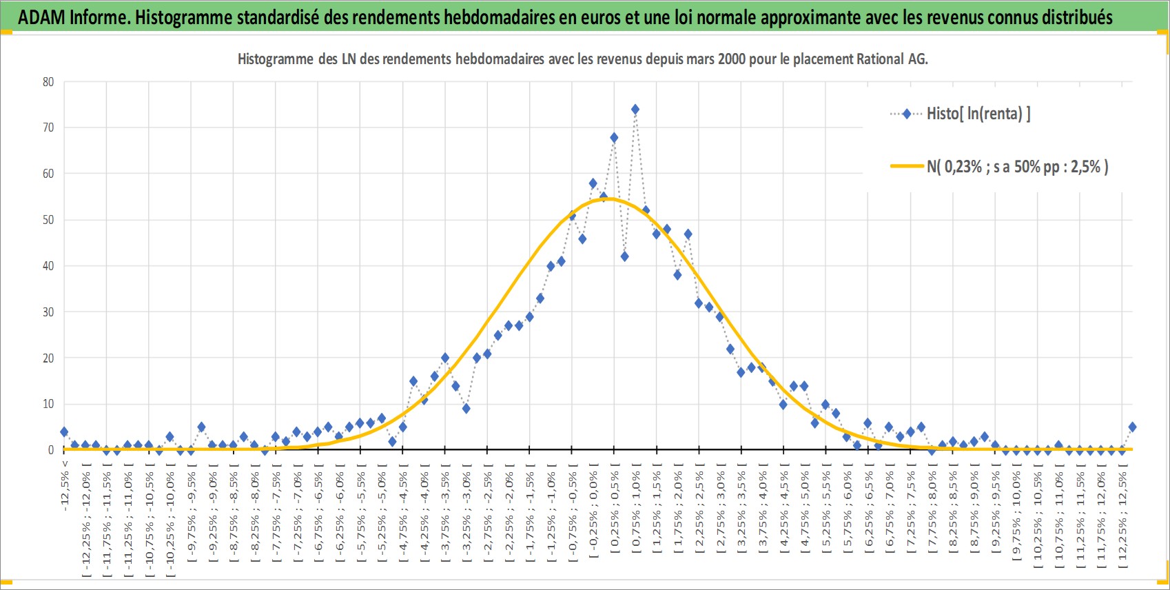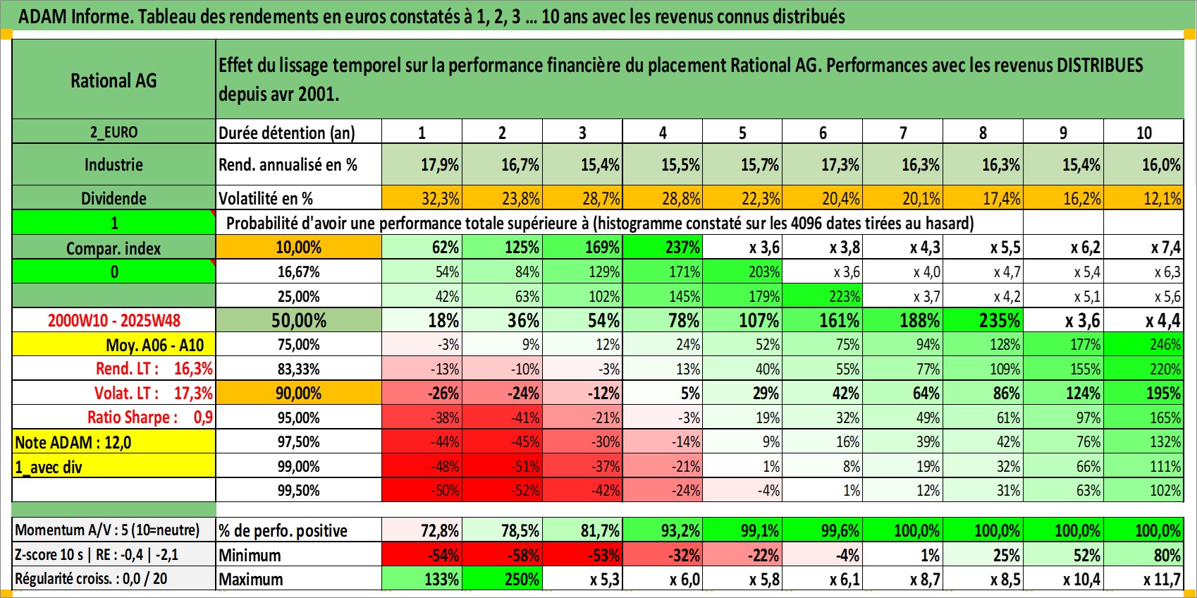Site dédié aux investisseursPage dédiée sur site financeAnalyse des valorisations hebdomadaires de l'action Rational AG. Cet actif est cote en EUR. Les valorisations couvrent les semaines 2000W10 a 2025W48. Les revenus de cet actif financier sont pris en compte depuis la semaine 2001W18. La note globale ESG de cet actif est estimee a 5.0 (apres rebasage entre 0 et 20).