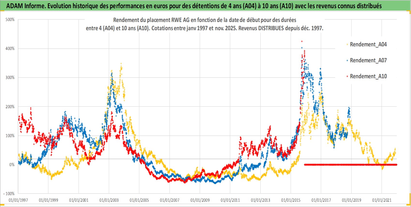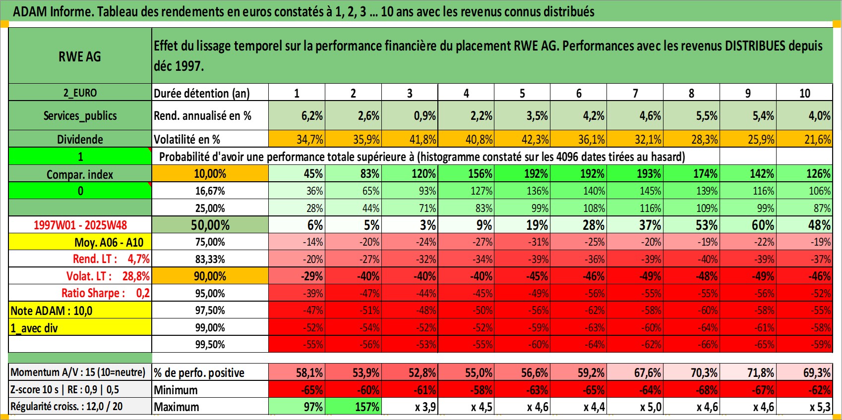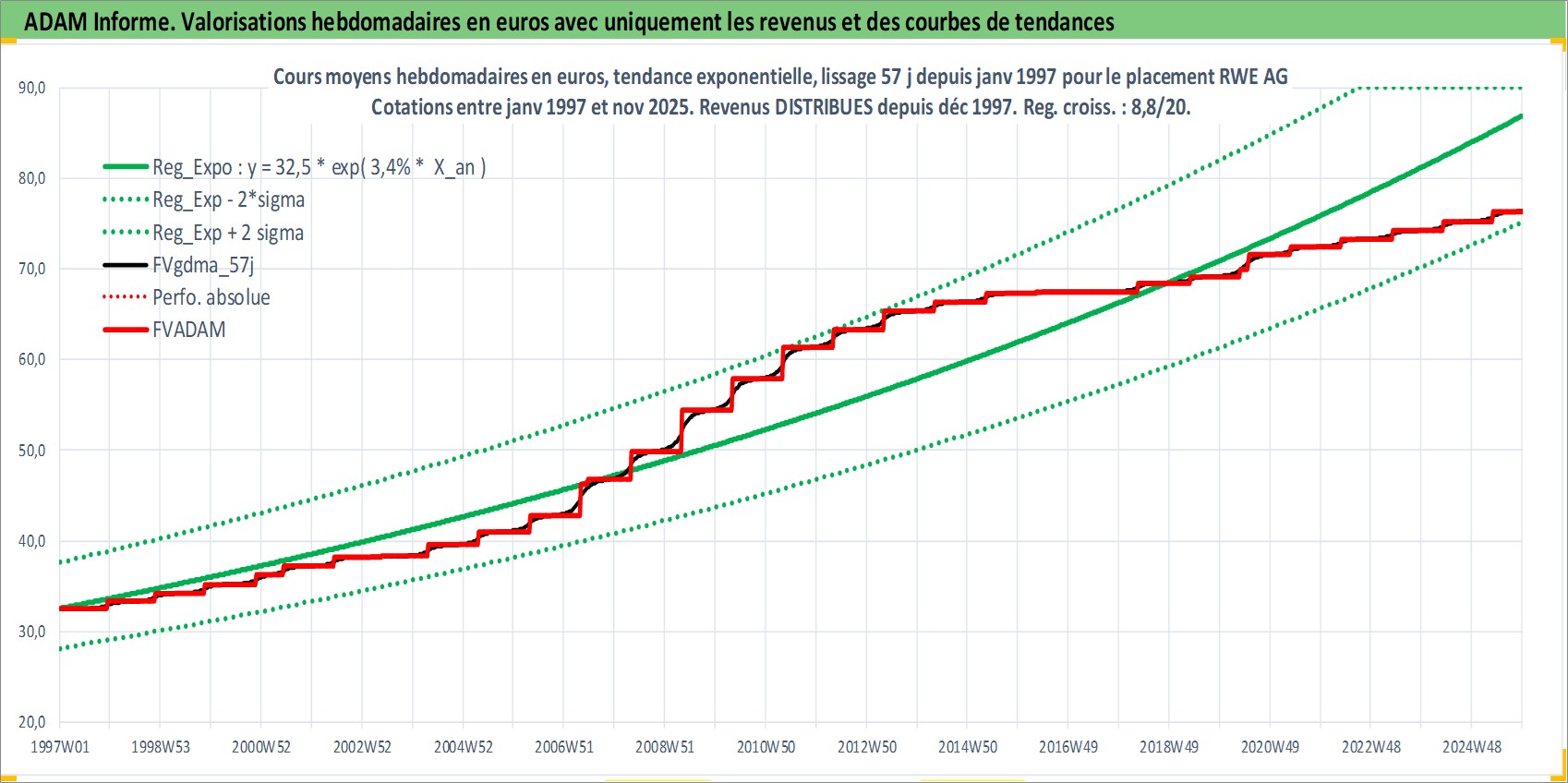 Site dédié aux investisseursPage dédiée sur site financeAnalyse des valorisations hebdomadaires de l'action RWE AG. Cet actif est cote en EUR. Les valorisations couvrent les semaines 1997W01 a 2025W48. Les revenus de cet actif financier sont pris en compte depuis la semaine 1997W50. La note globale ESG de cet actif est estimee a 9.0 (apres rebasage entre 0 et 20).