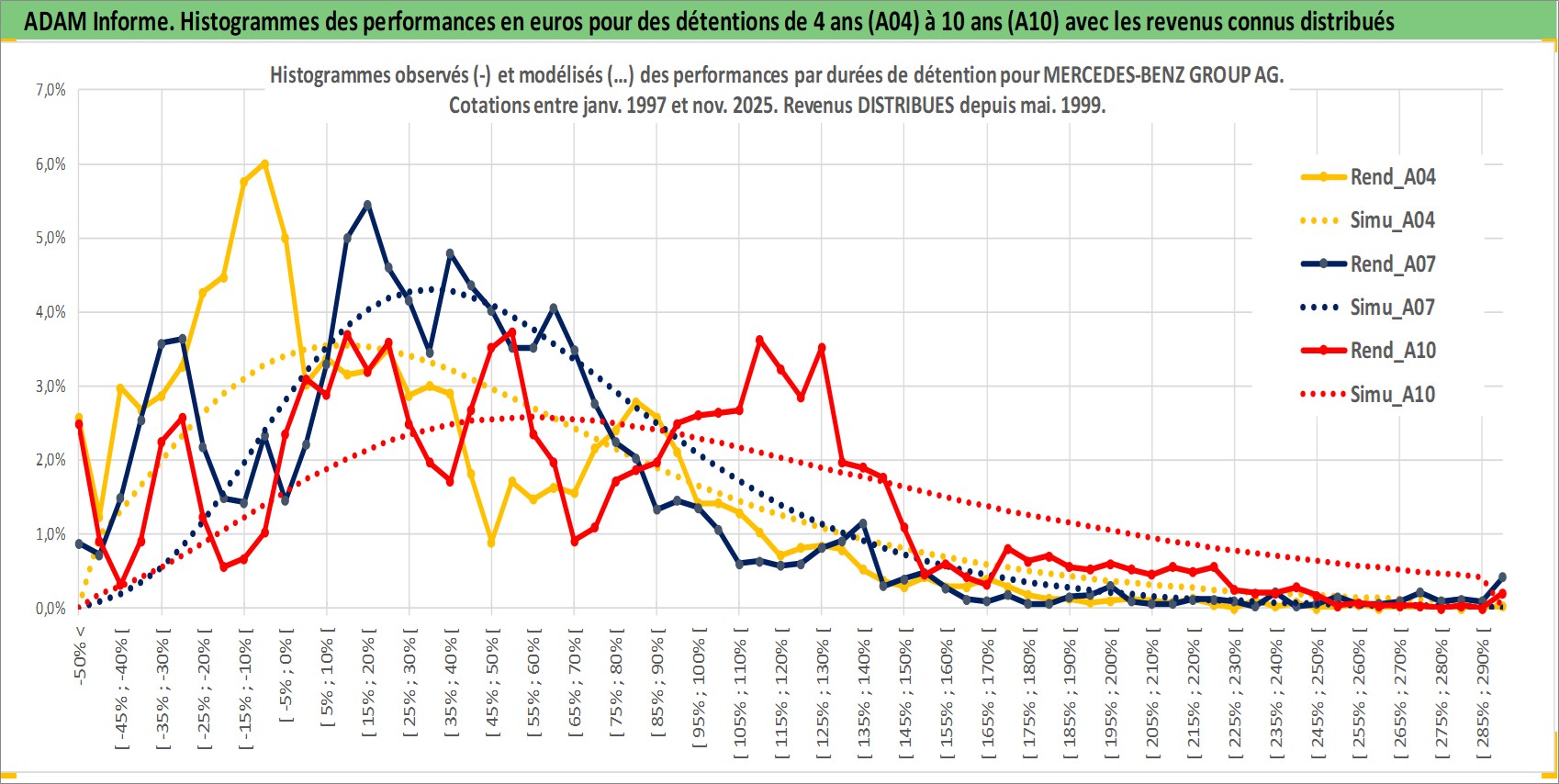 Site dédié aux investisseursPage dédiée sur site financeAnalyse des valorisations hebdomadaires de l'action MERCEDES-BENZ GROUP AG. Cet actif est cote en EUR. Les valorisations couvrent les semaines 1997W01 a 2025W48. Les revenus de cet actif financier sont pris en compte depuis la semaine 1999W20. La note globale ESG de cet actif est estimee a 9.0 (apres rebasage entre 0 et 20).