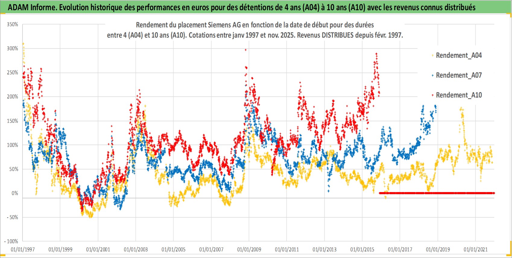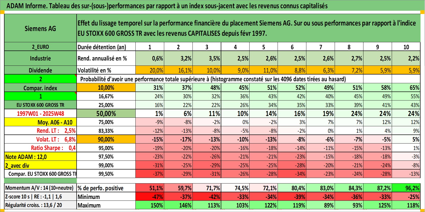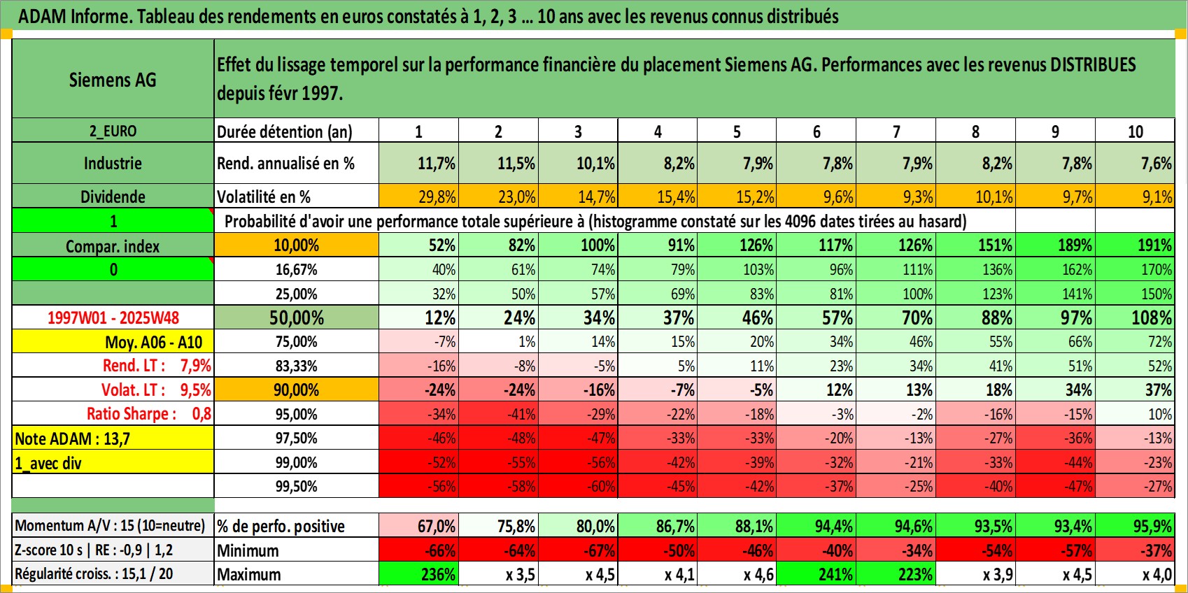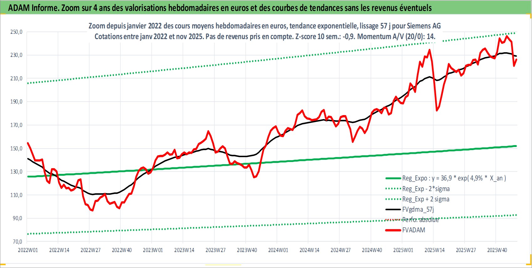 Site dédié aux investisseursPage dédiée sur site financeAnalyse des valorisations hebdomadaires de l'action Siemens AG. Cet actif est cote en EUR. Les valorisations couvrent les semaines 1997W01 a 2025W48. Les revenus de cet actif financier sont pris en compte depuis la semaine 1997W07. La note globale ESG de cet actif est estimee a 5.0 (apres rebasage entre 0 et 20).