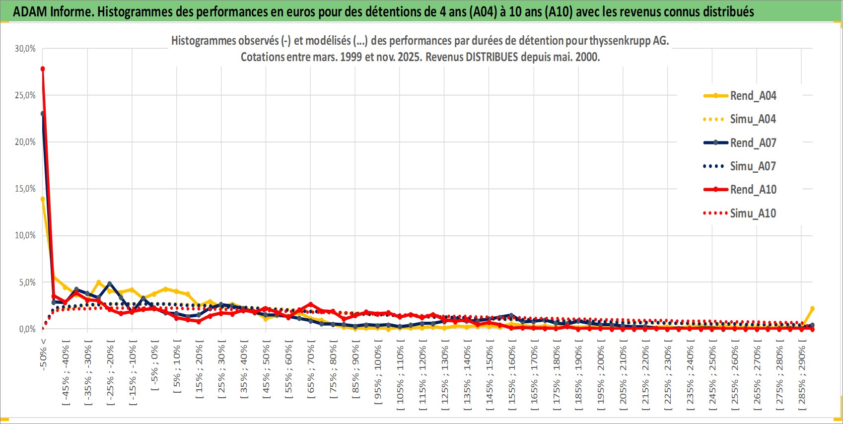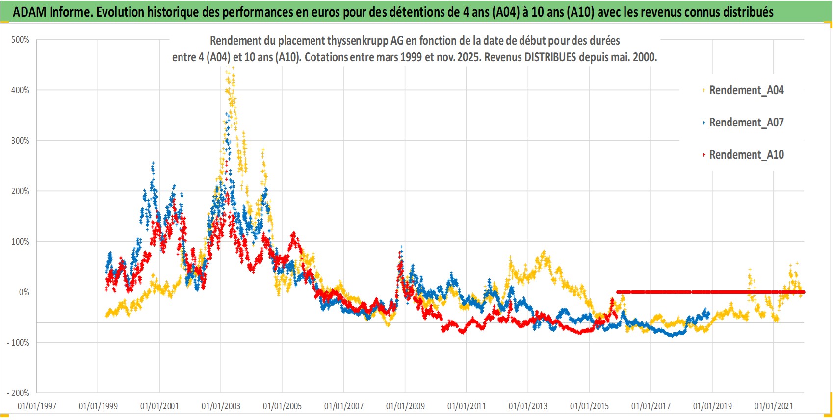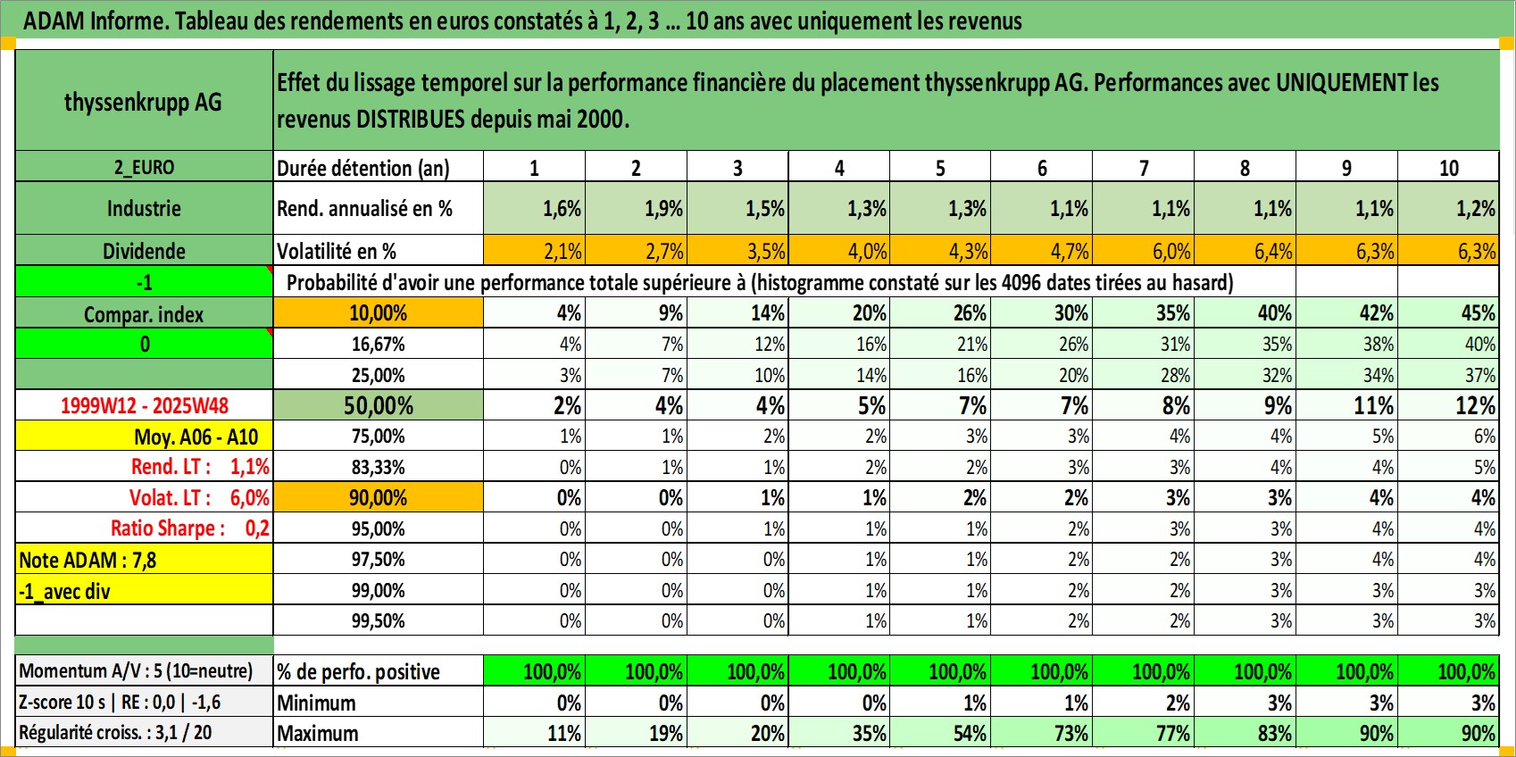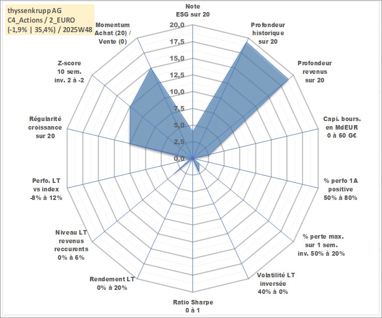 Site dédié aux investisseursPage dédiée sur site financeAnalyse des valorisations hebdomadaires de l'action thyssenkrupp AG. Cet actif est cote en EUR. Les valorisations couvrent les semaines 1999W12 a 2025W48. Les revenus de cet actif financier sont pris en compte depuis la semaine 2000W21. La note globale ESG de cet actif est estimee a 4.0 (apres rebasage entre 0 et 20).
