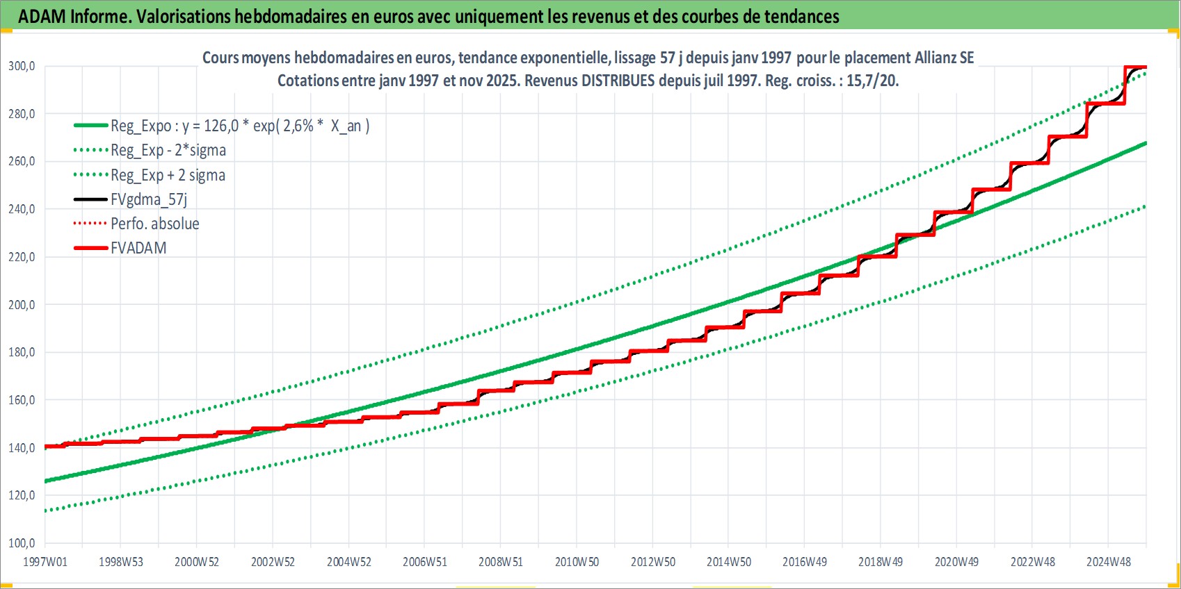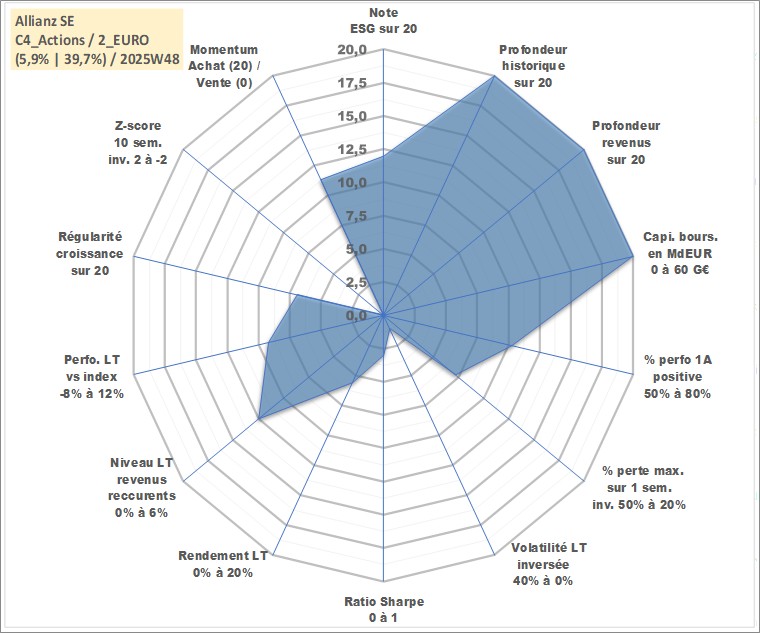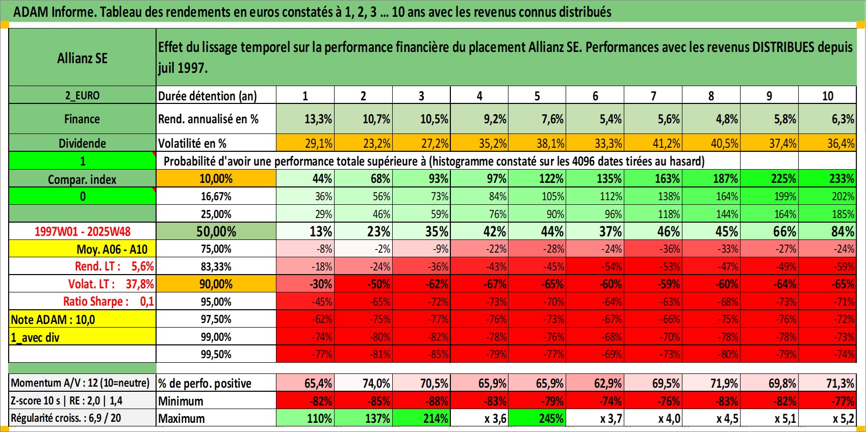 Site dédié aux investisseursPage dédiée sur site financeAnalyse des valorisations hebdomadaires de l'action Allianz SE. Cet actif est cote en EUR. Les valorisations couvrent les semaines 1997W01 a 2025W48. Les revenus de cet actif financier sont pris en compte depuis la semaine 1997W28. La note globale ESG de cet actif est estimee a 12.0 (apres rebasage entre 0 et 20).