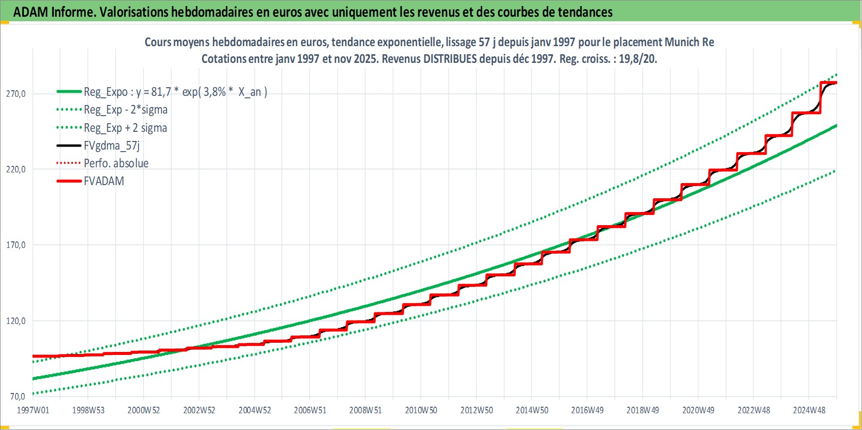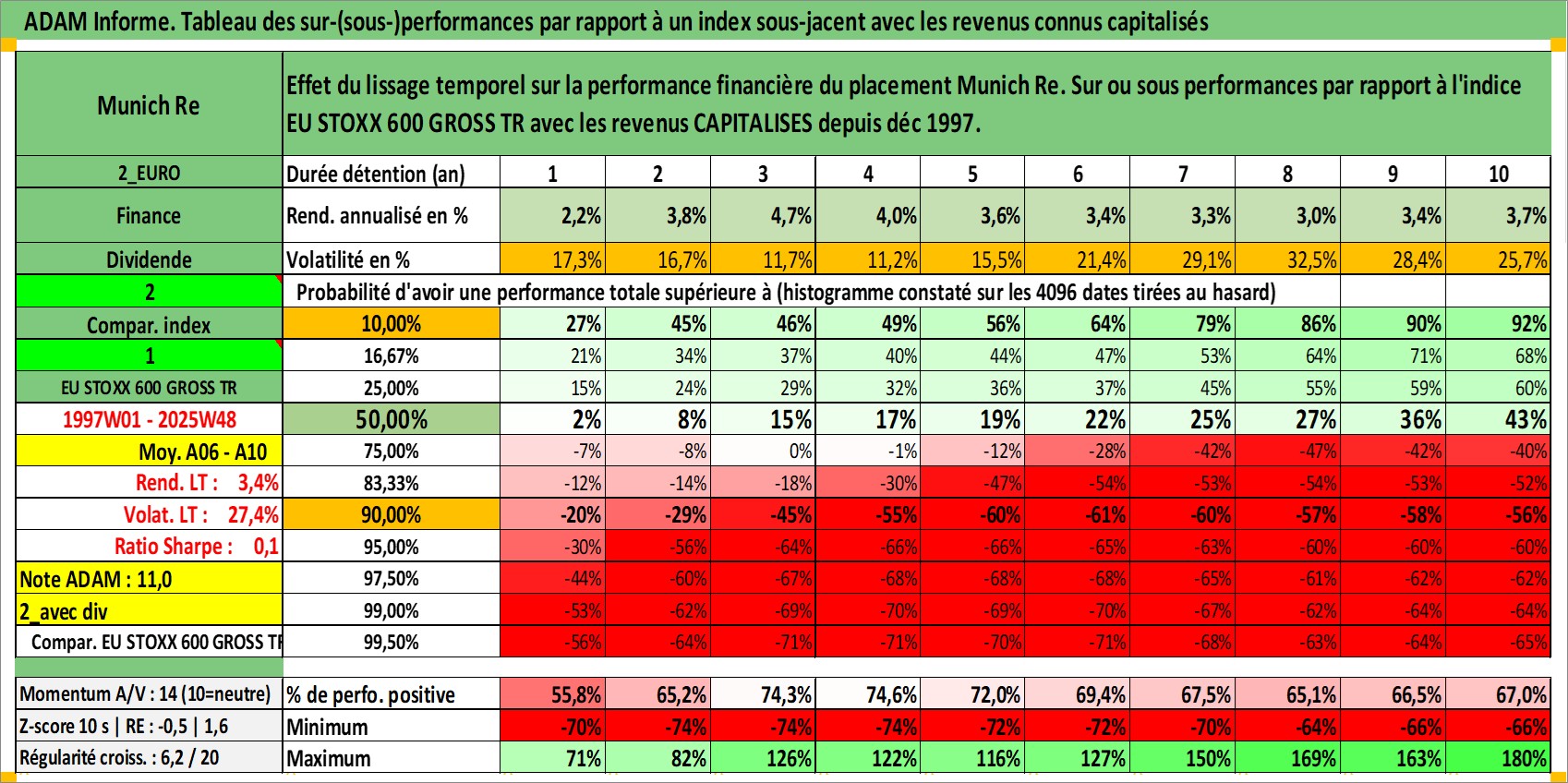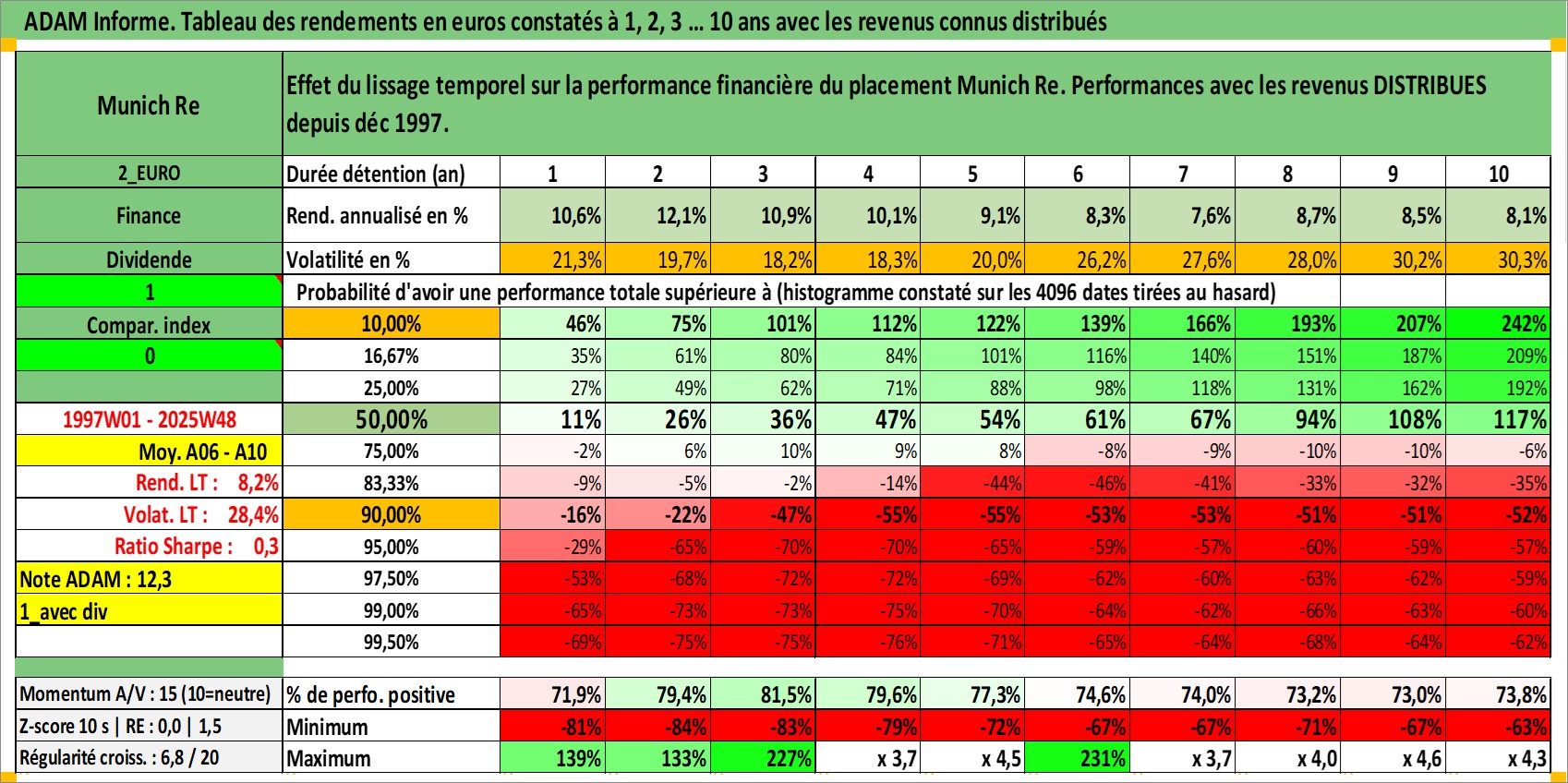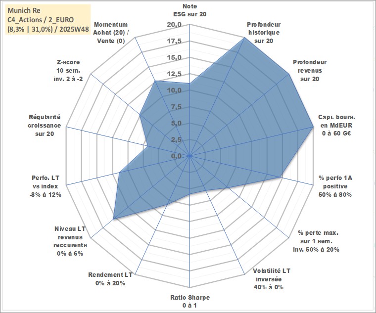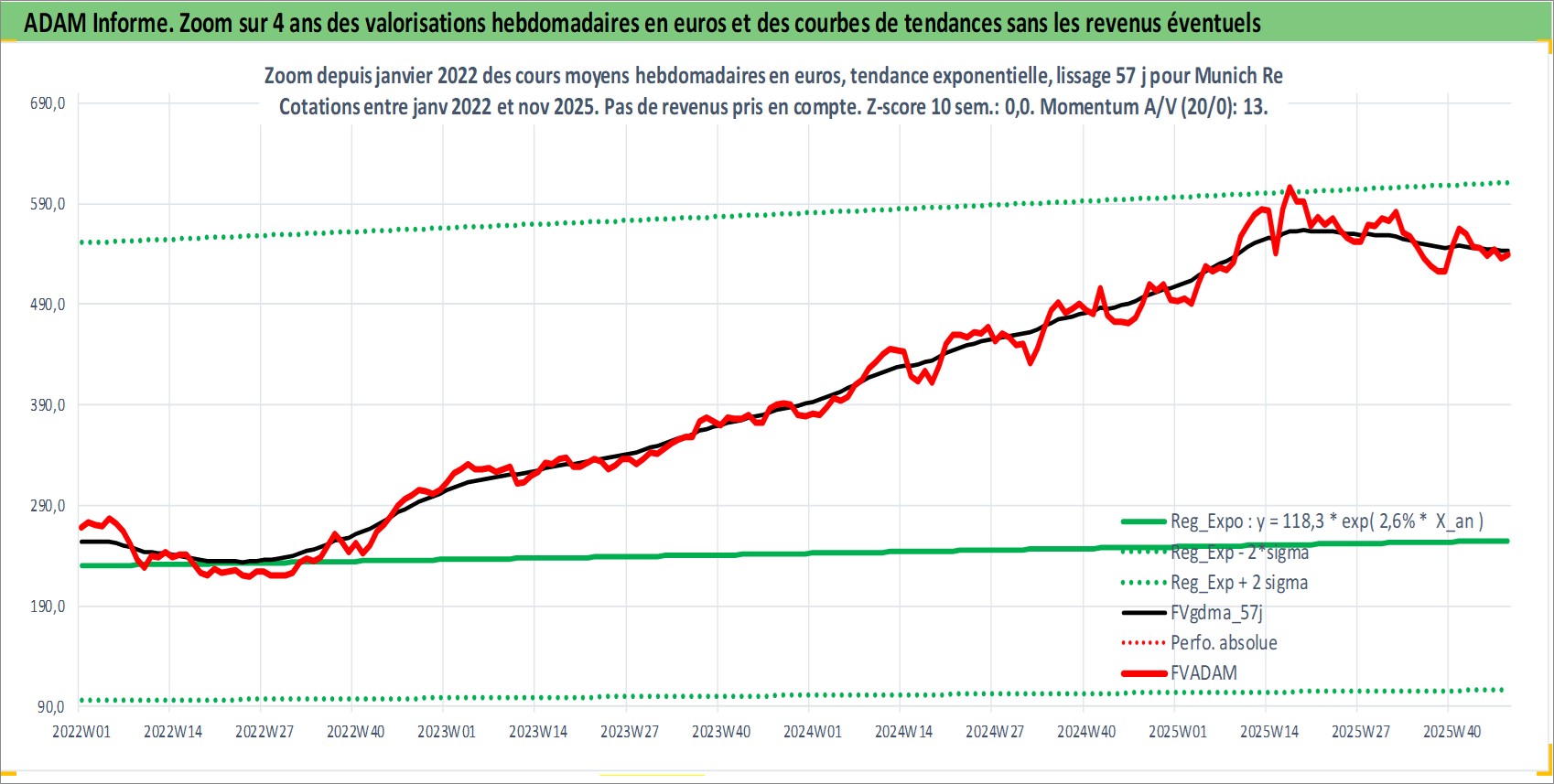 Site dédié aux investisseursPage dédiée sur site financeAnalyse des valorisations hebdomadaires de l'action Munich Re. Cet actif est cote en EUR. Les valorisations couvrent les semaines 1997W01 a 2025W48. Les revenus de cet actif financier sont pris en compte depuis la semaine 1997W50. La note globale ESG de cet actif est estimee a 11.0 (apres rebasage entre 0 et 20).