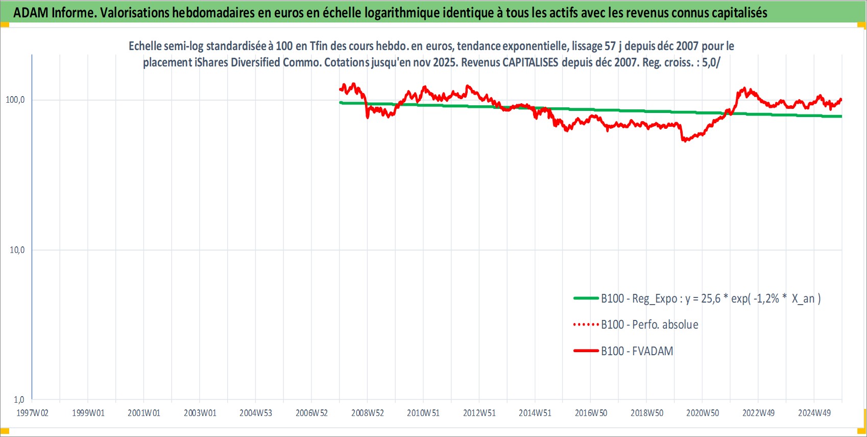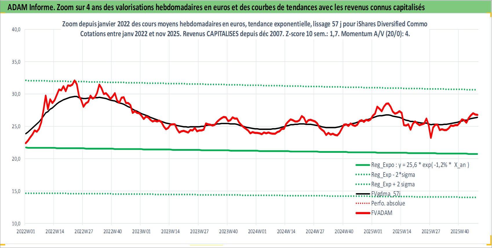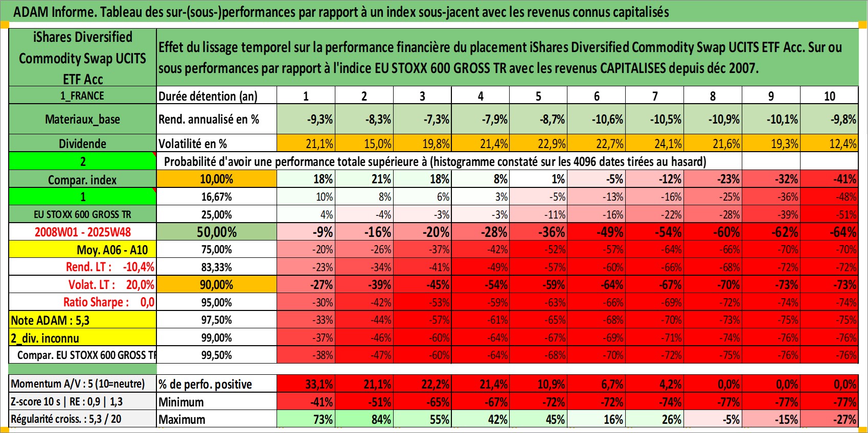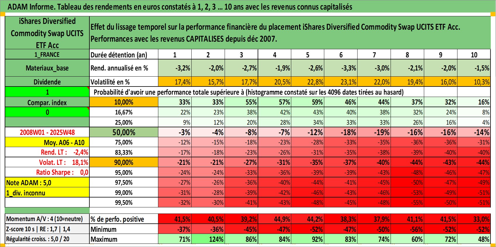 Site dédié aux investisseursPage dédiée sur site financeAnalyse des valorisations hebdomadaires du fonds iShares Diversified Commodity Swap UCITS ETF Acc. Cet actif est cote en USD. Les valorisations sont en contrevaleur EURO et couvrent les semaines 2008W01 a 2025W48. Les revenus de cet actif financier sont pris en compte depuis la semaine 2008W01. La note ESG de cet actif n'est pas connue.