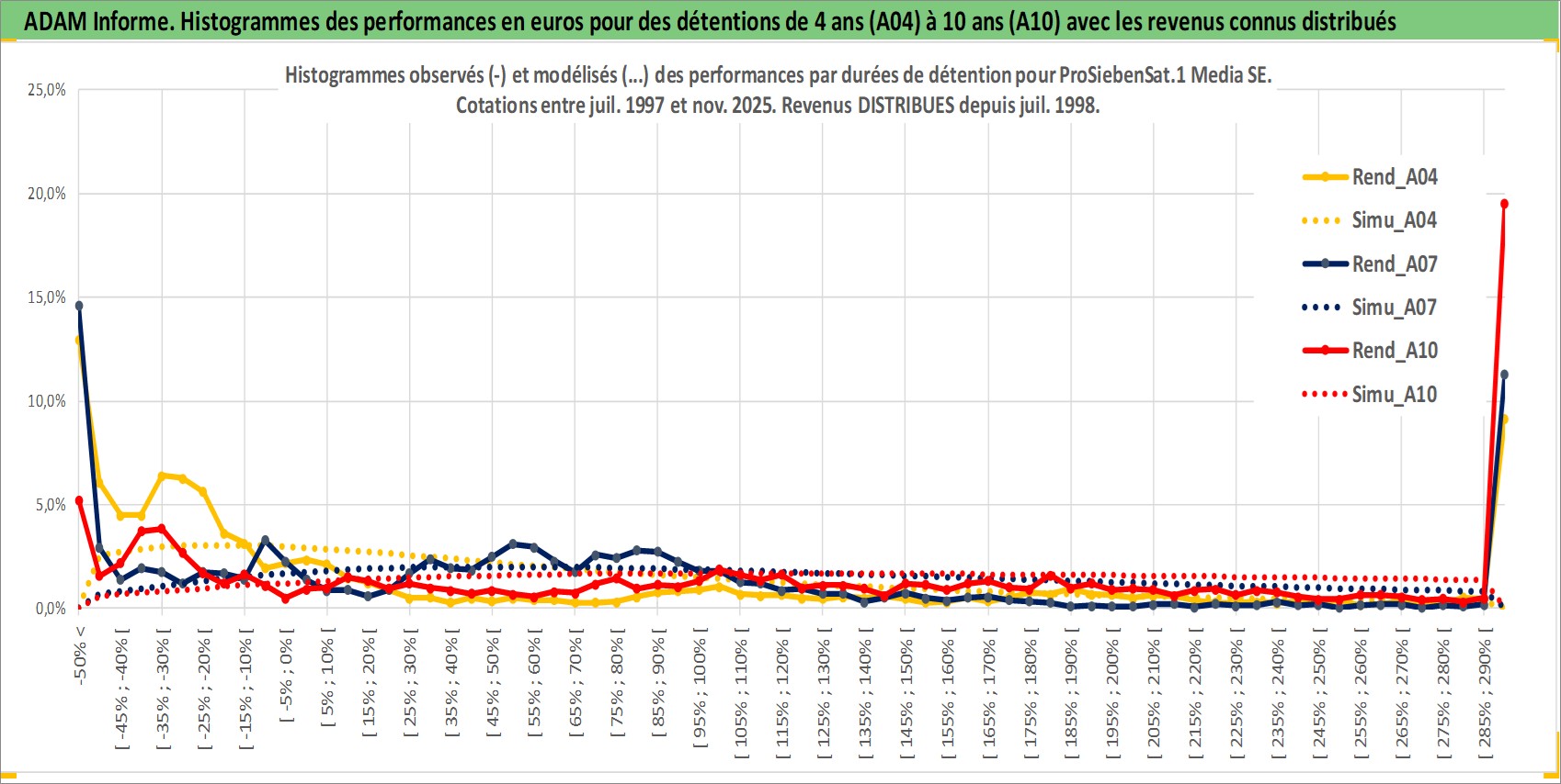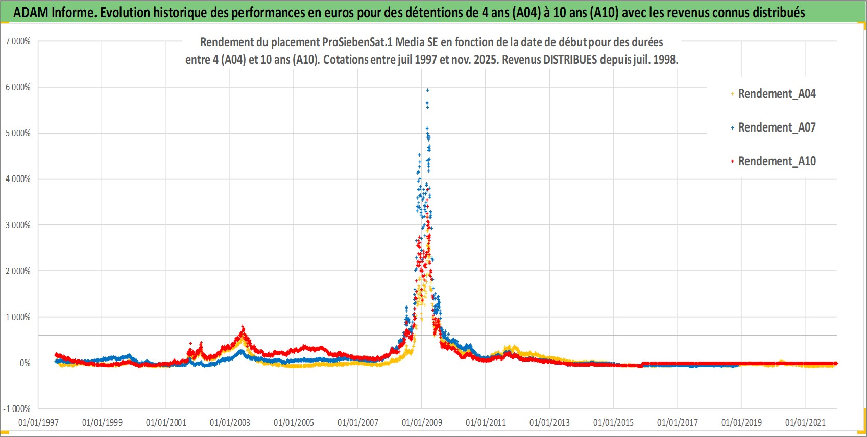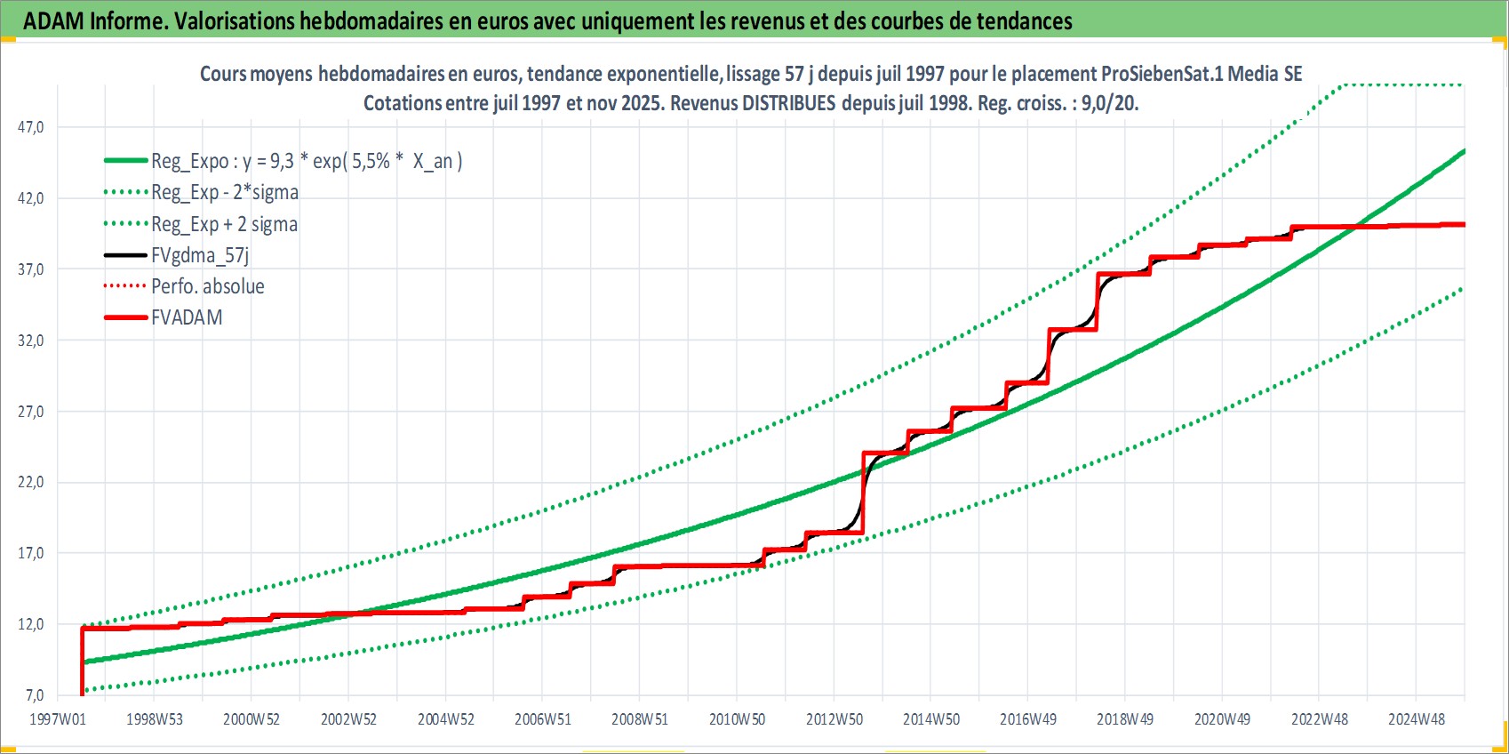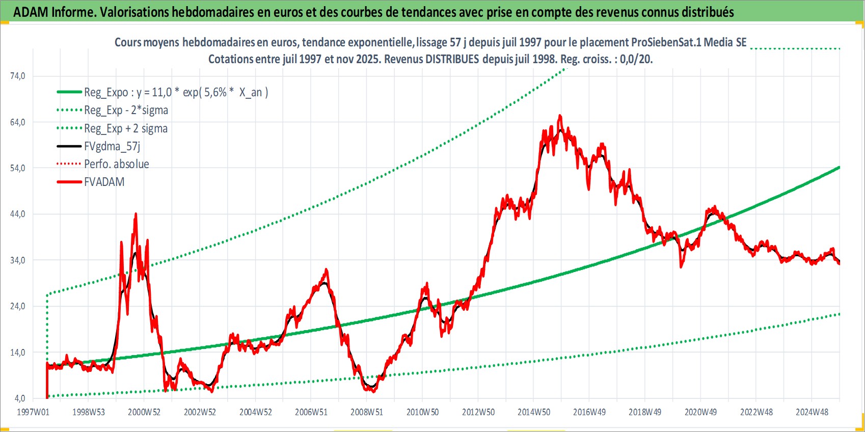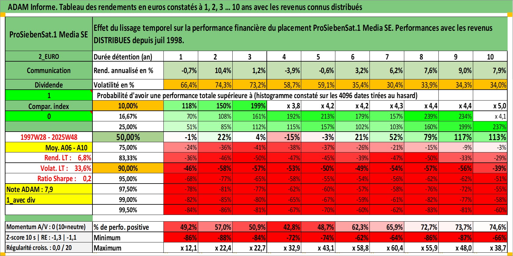 Site dédié aux investisseursPage dédiée sur site financeAnalyse des valorisations hebdomadaires de l'action ProSiebenSat.1 Media SE. Cet actif est cote en EUR. Les valorisations couvrent les semaines 1997W28 a 2025W48. Les revenus de cet actif financier sont pris en compte depuis la semaine 1998W28. La note globale ESG de cet actif est estimee a 16.0 (apres rebasage entre 0 et 20).