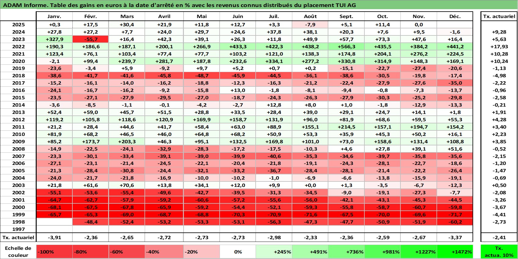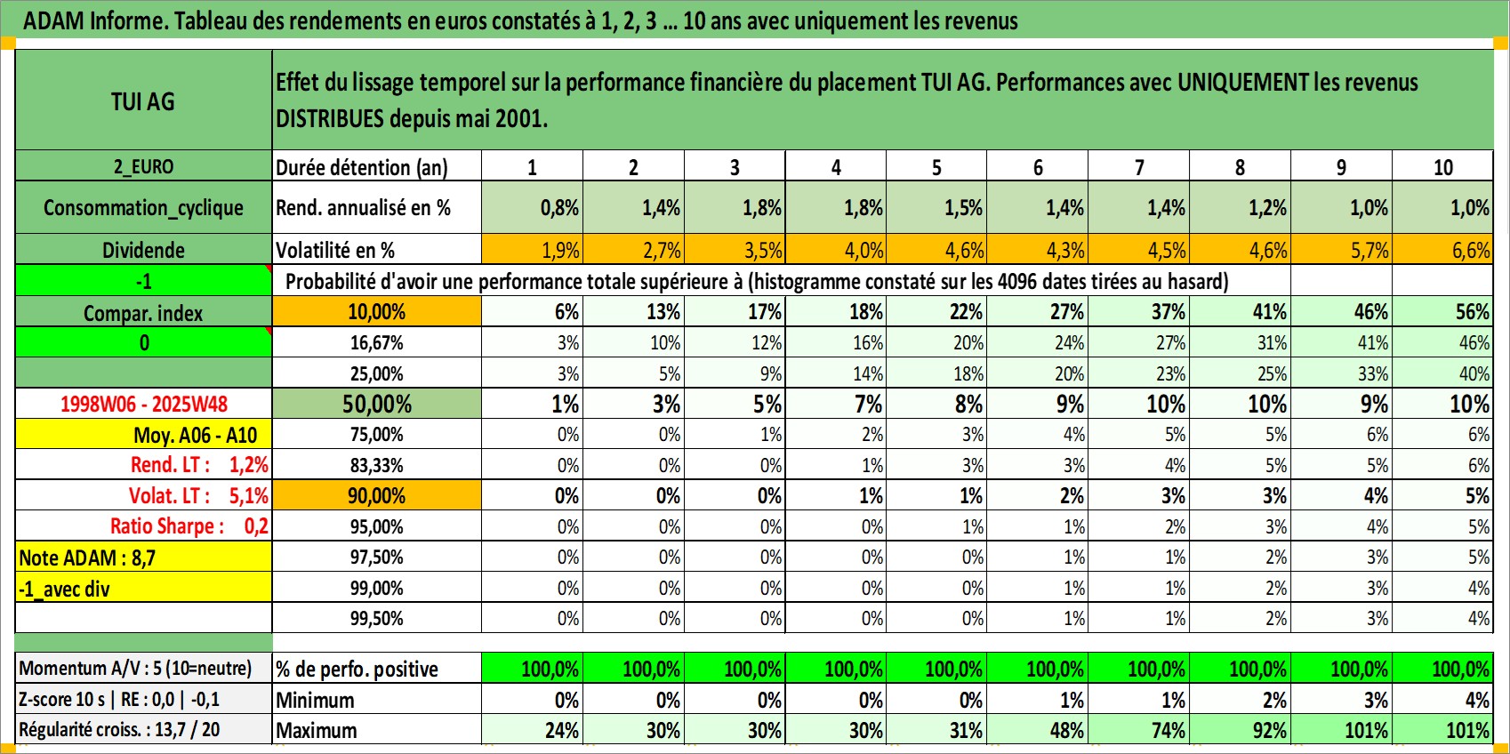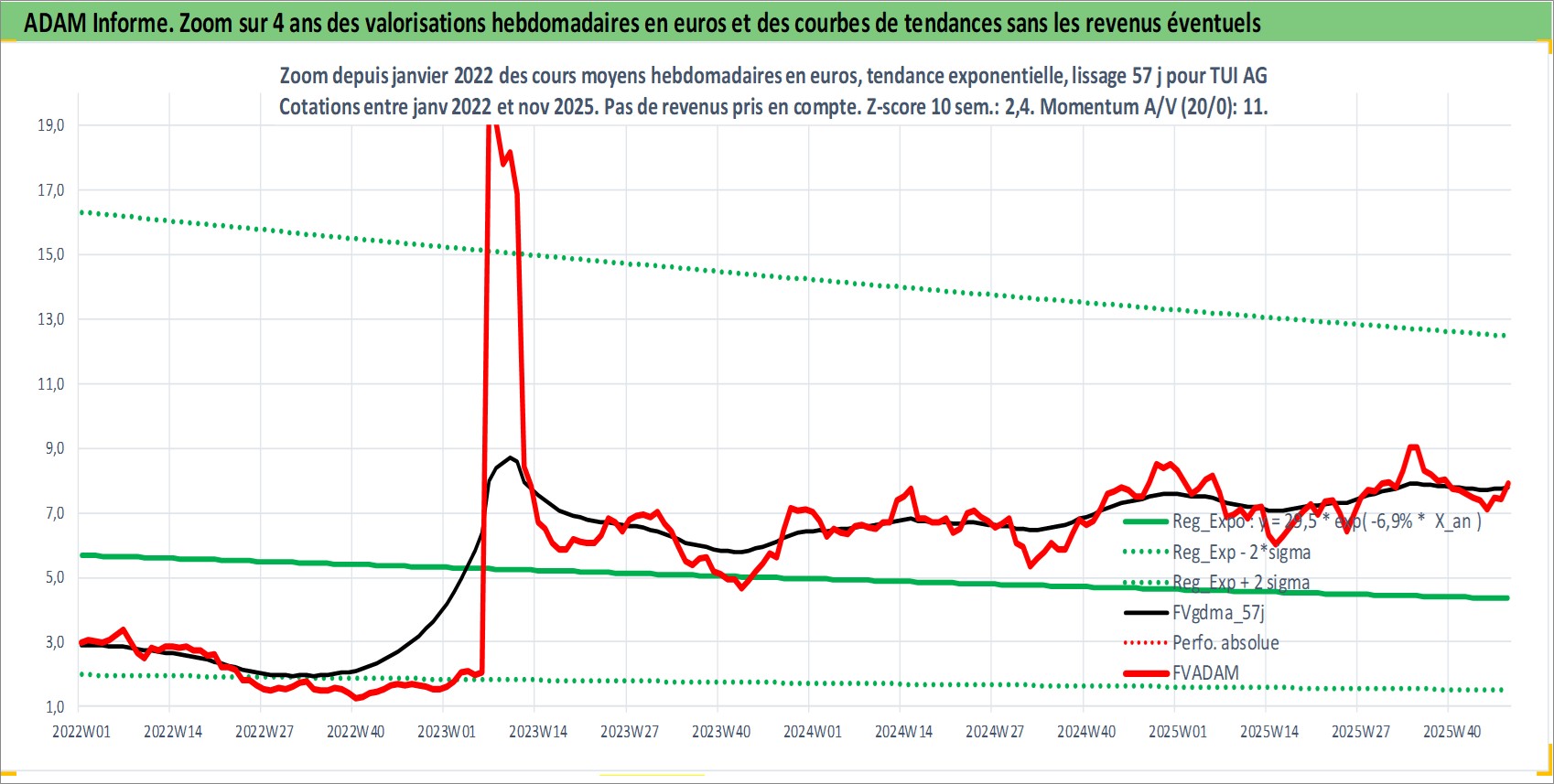 Site dédié aux investisseursPage dédiée sur site financeAnalyse des valorisations hebdomadaires de l'action TUI AG. Cet actif est cote en EUR. Les valorisations couvrent les semaines 1998W06 a 2025W48. Les revenus de cet actif financier sont pris en compte depuis la semaine 2001W21. La note globale ESG de cet actif est estimee a 6.0 (apres rebasage entre 0 et 20).