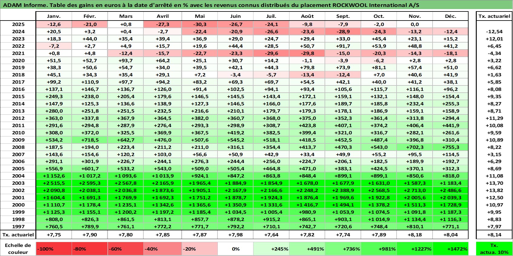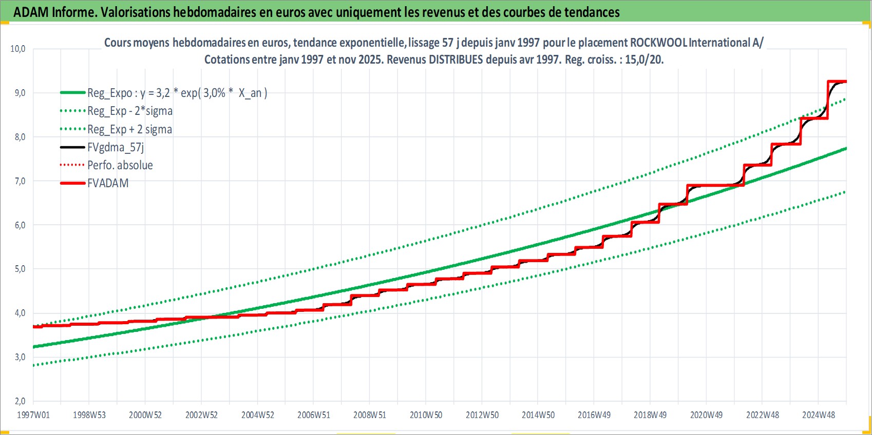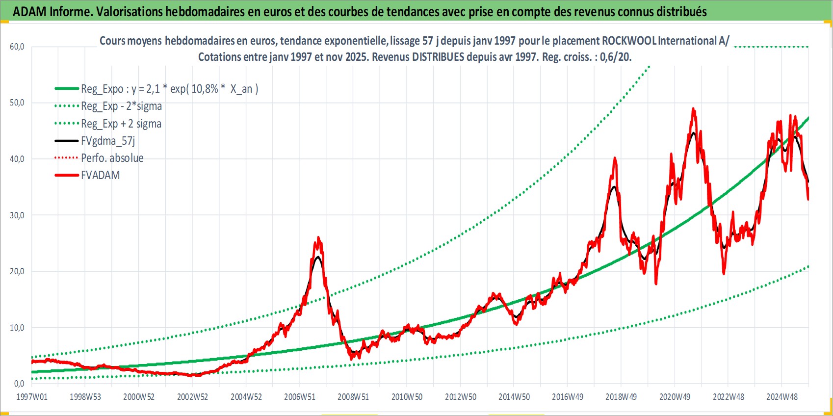 Site dédié aux investisseursPage dédiée sur site financeAnalyse des valorisations hebdomadaires de l'action ROCKWOOL International A/S. Cet actif est cote en DKK. Les valorisations sont en contrevaleur EURO et couvrent les semaines 1997W01 a 2025W48. Les revenus de cet actif financier sont pris en compte depuis la semaine 1997W18. La note ESG de cet actif n'est pas connue.