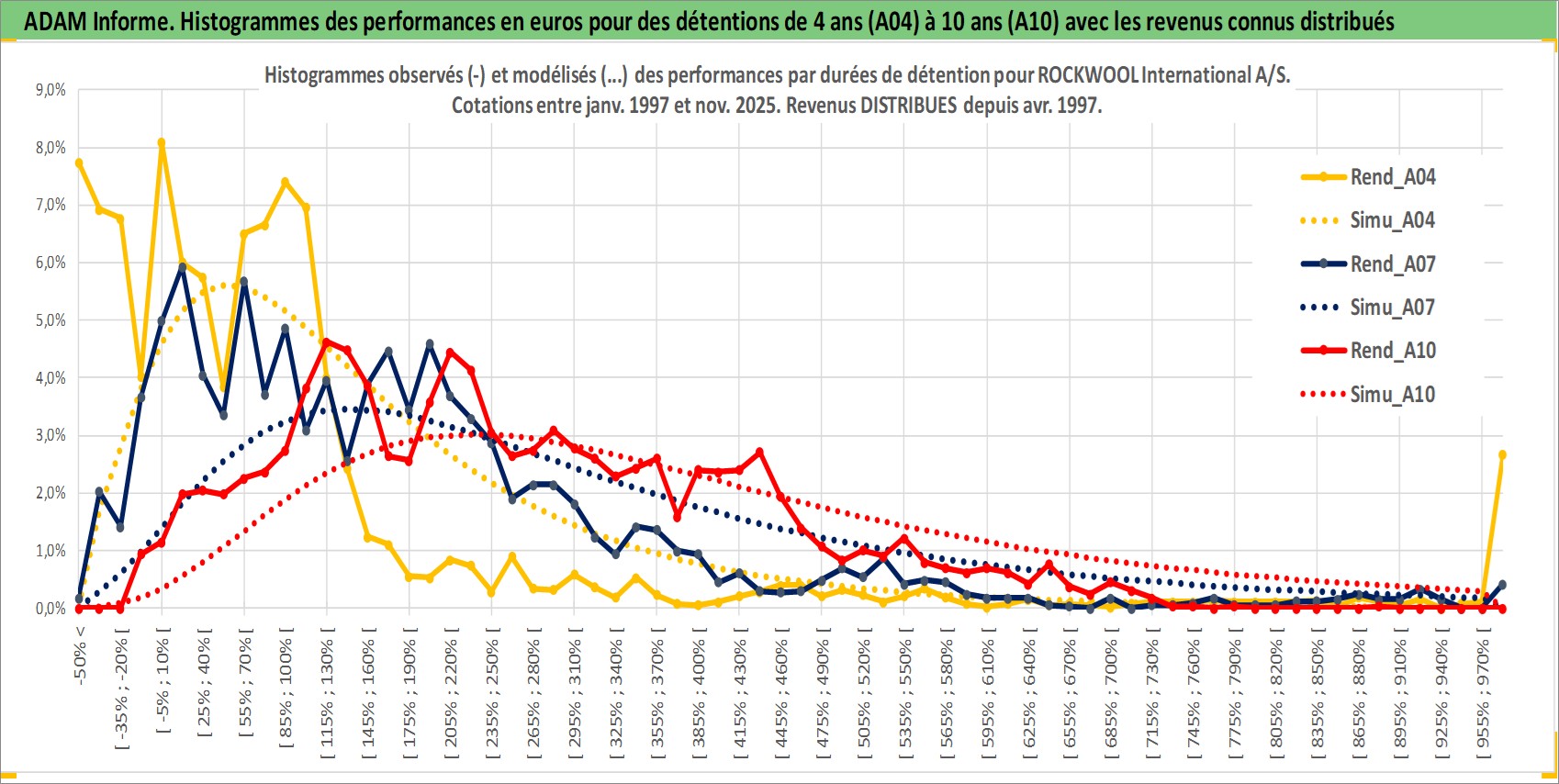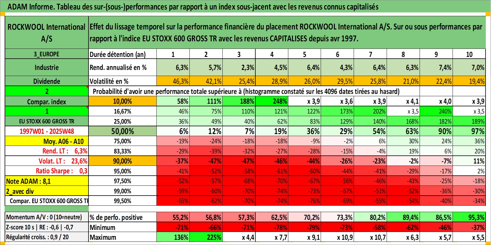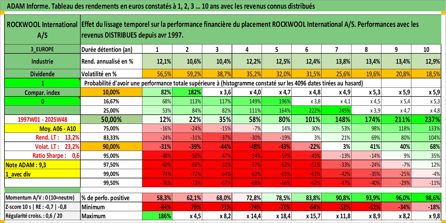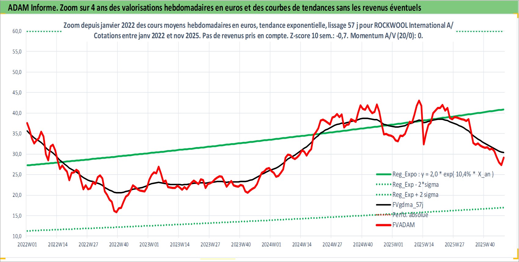 Site dédié aux investisseursPage dédiée sur site financeAnalyse des valorisations hebdomadaires de l'action ROCKWOOL International A/S. Cet actif est cote en DKK. Les valorisations sont en contrevaleur EURO et couvrent les semaines 1997W01 a 2025W48. Les revenus de cet actif financier sont pris en compte depuis la semaine 1997W18. La note ESG de cet actif n'est pas connue.