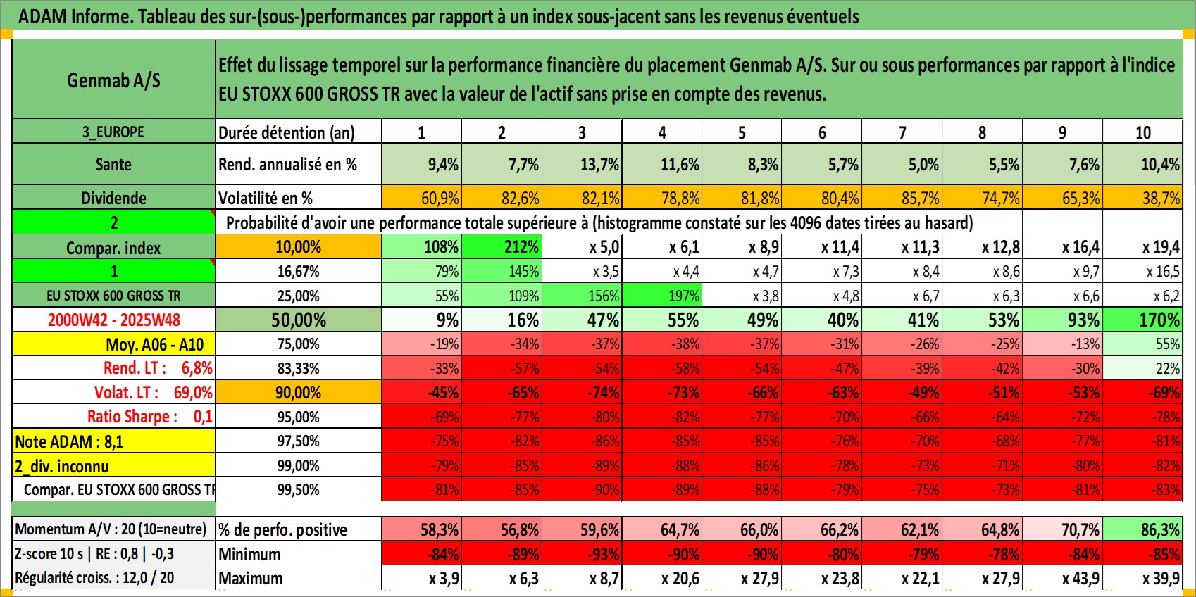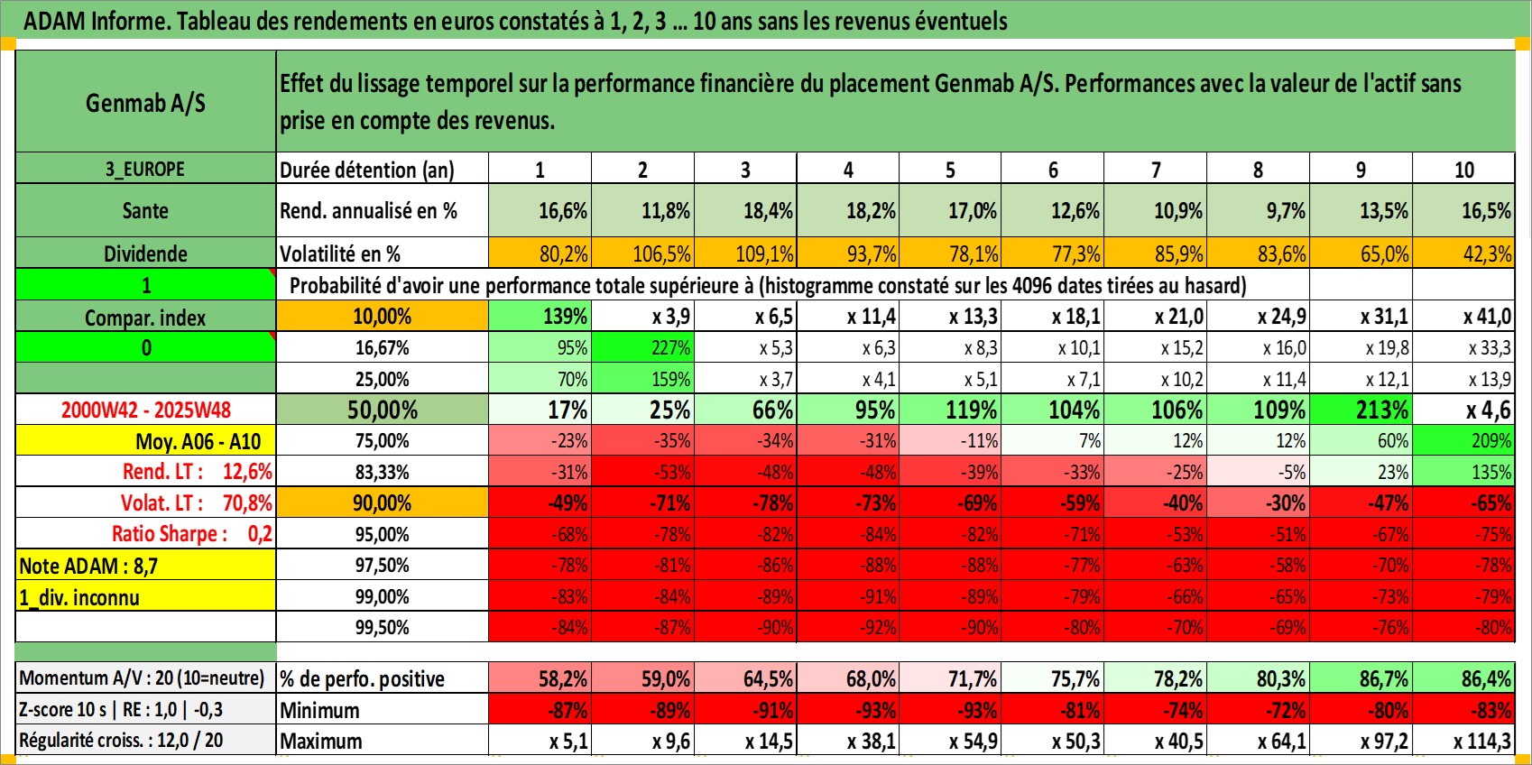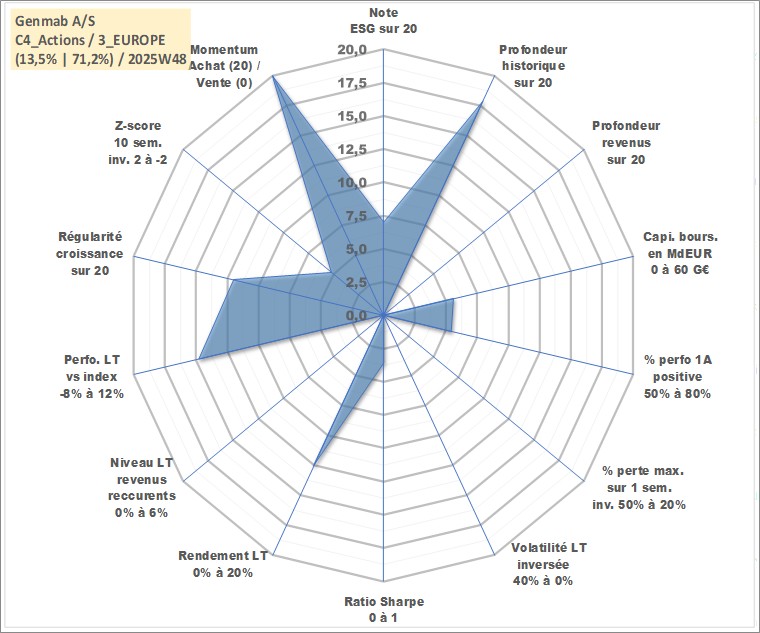 Site dédié aux investisseursPage dédiée sur site financeAnalyse des valorisations hebdomadaires de l'action Genmab A/S. Cet actif est cote en DKK. Les valorisations sont en contrevaleur EURO et couvrent les semaines 2000W42 a 2025W48. Les revenus de cet actif financier ne sont pas connus car non existants ou non disponibles sur le site Yahoo Finance. La note globale ESG de cet actif est estimee a 7.0 (apres rebasage entre 0 et 20).