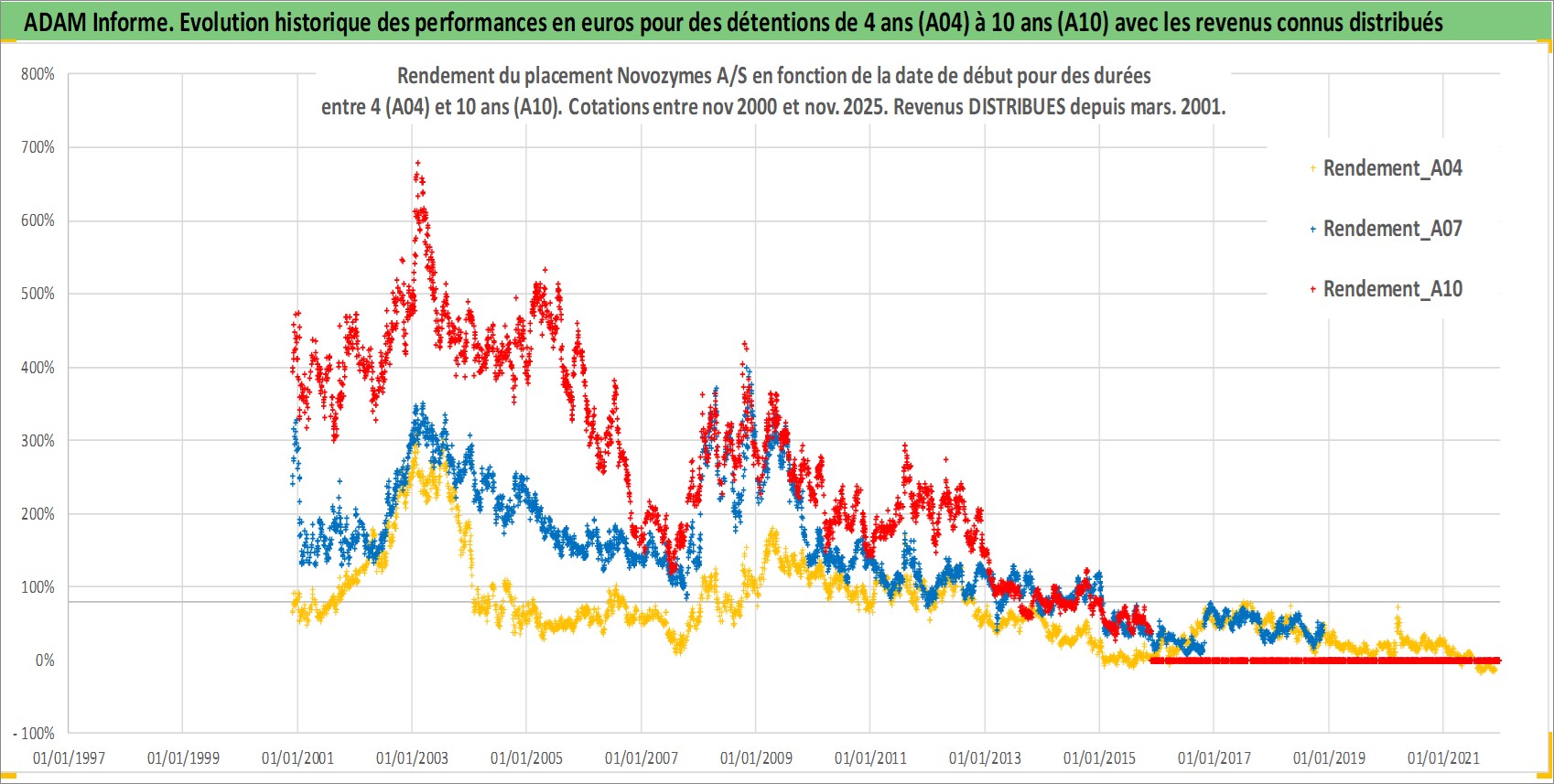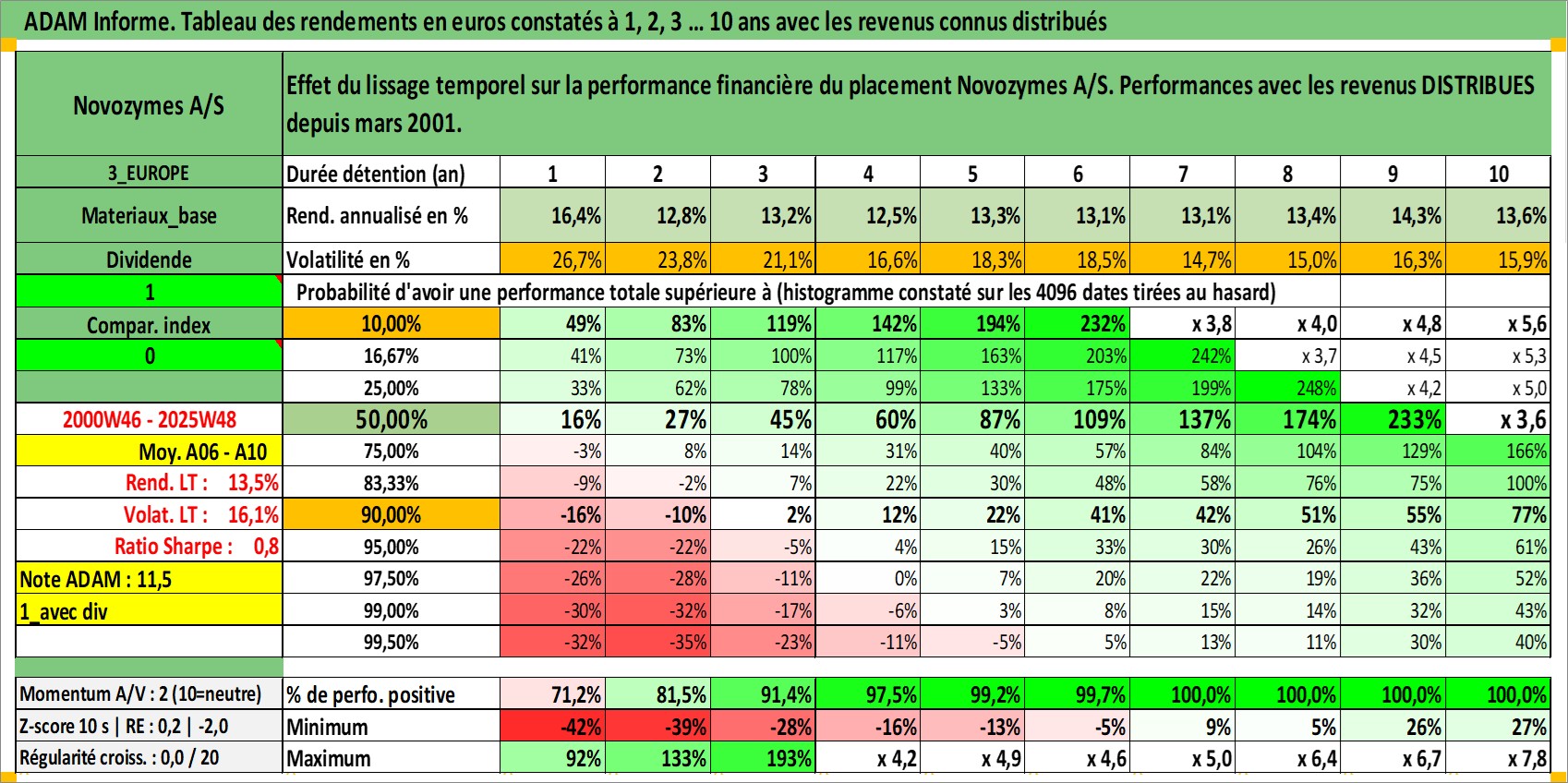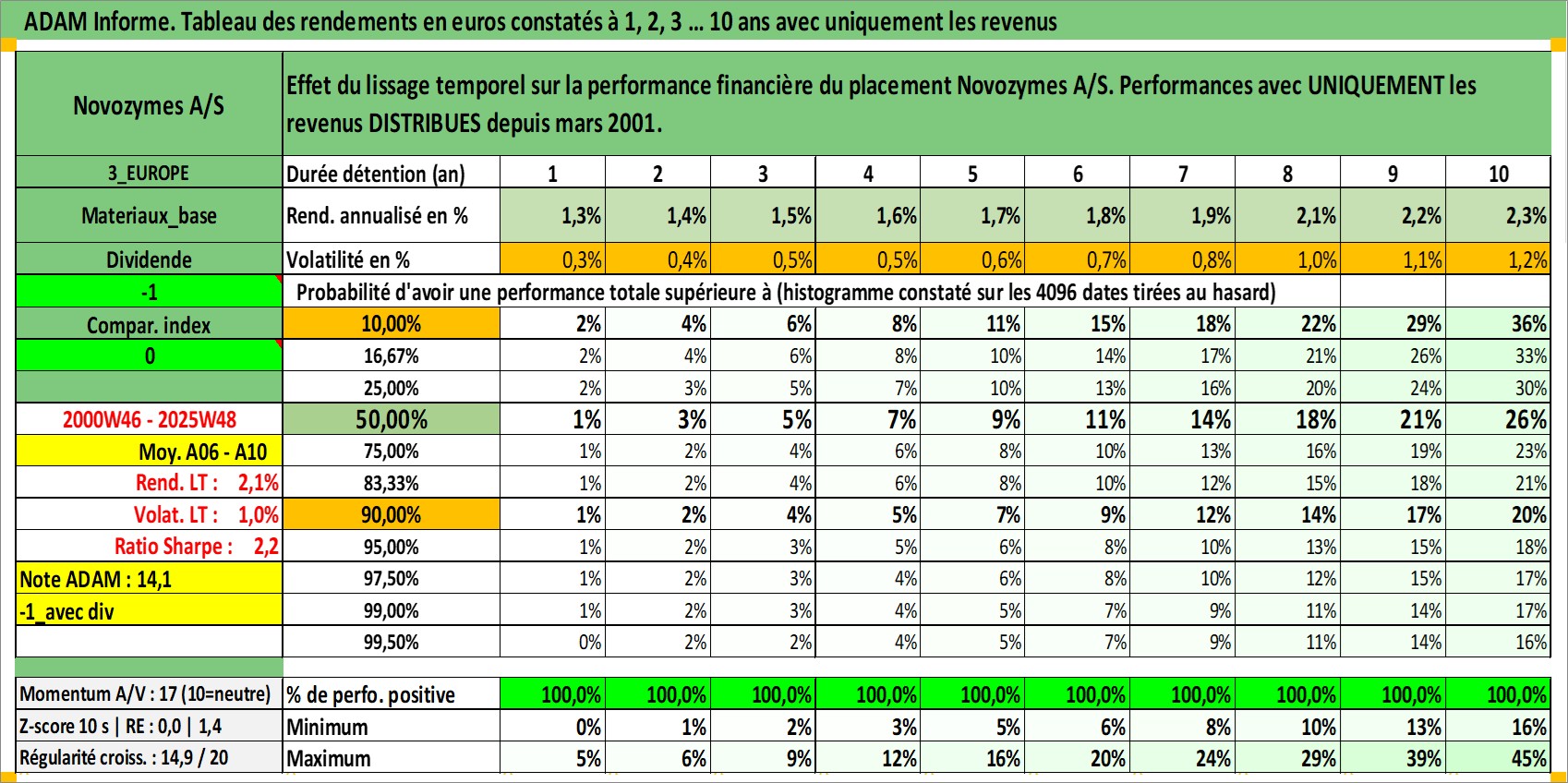 Site dédié aux investisseursPage dédiée sur site financeAnalyse des valorisations hebdomadaires de l'action Novozymes A/S. Cet actif est cote en DKK. Les valorisations sont en contrevaleur EURO et couvrent les semaines 2000W46 a 2025W48. Les revenus de cet actif financier sont pris en compte depuis la semaine 2001W12. La note globale ESG de cet actif est estimee a 13.0 (apres rebasage entre 0 et 20).