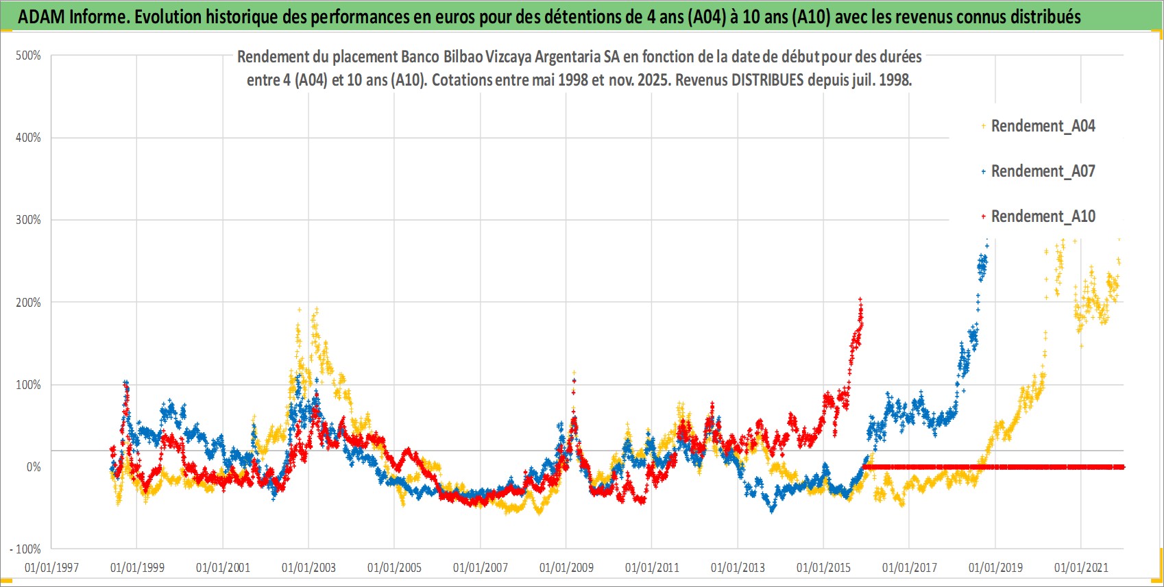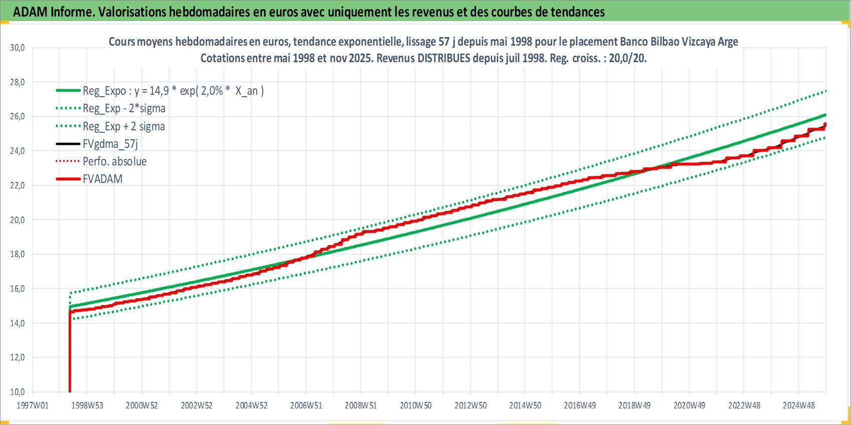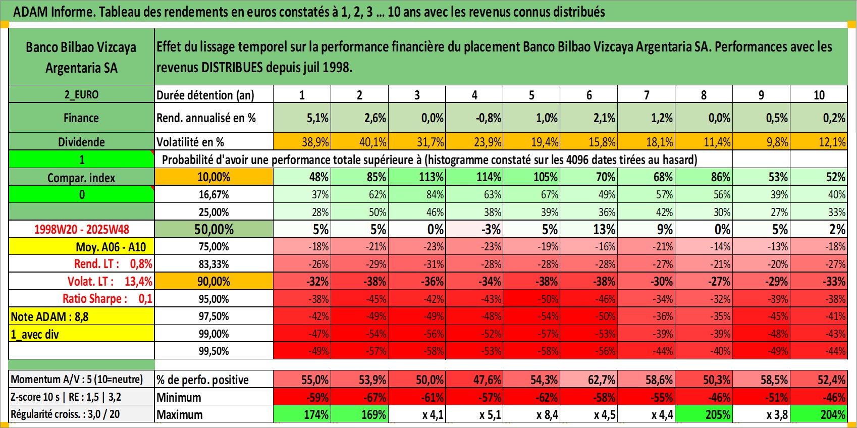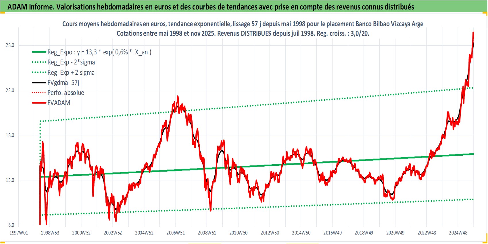 Site dédié aux investisseursPage dédiée sur site financeAnalyse des valorisations hebdomadaires de l'action Banco Bilbao Vizcaya Argentaria SA. Cet actif est cote en EUR. Les valorisations couvrent les semaines 1998W20 a 2025W48. Les revenus de cet actif financier sont pris en compte depuis la semaine 1998W29. La note globale ESG de cet actif est estimee a 9.0 (apres rebasage entre 0 et 20).