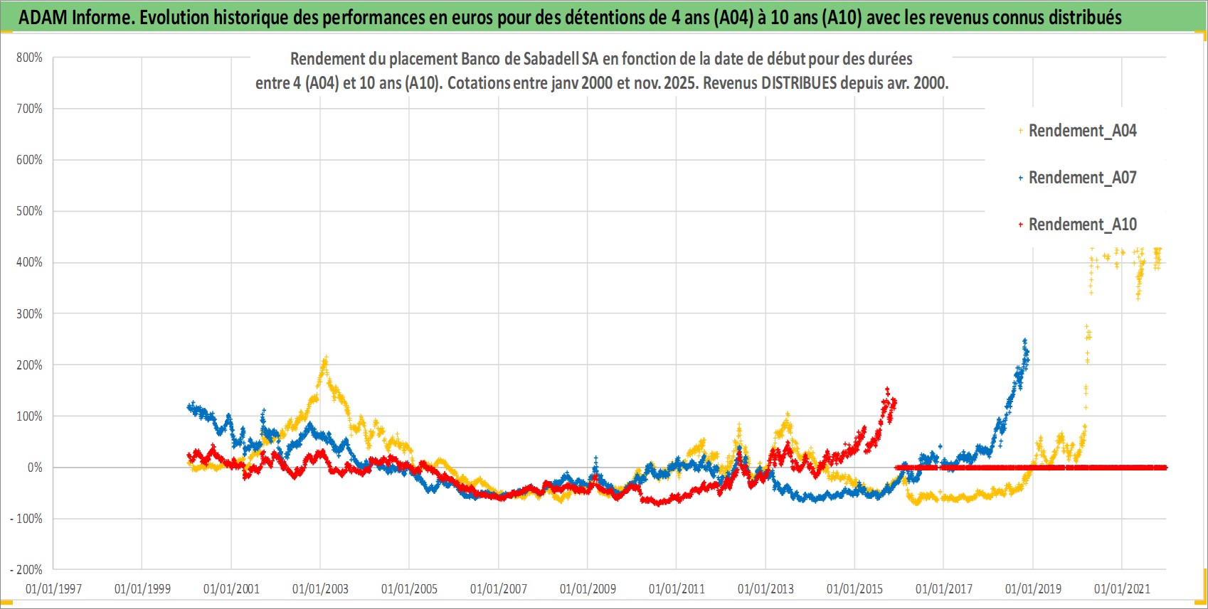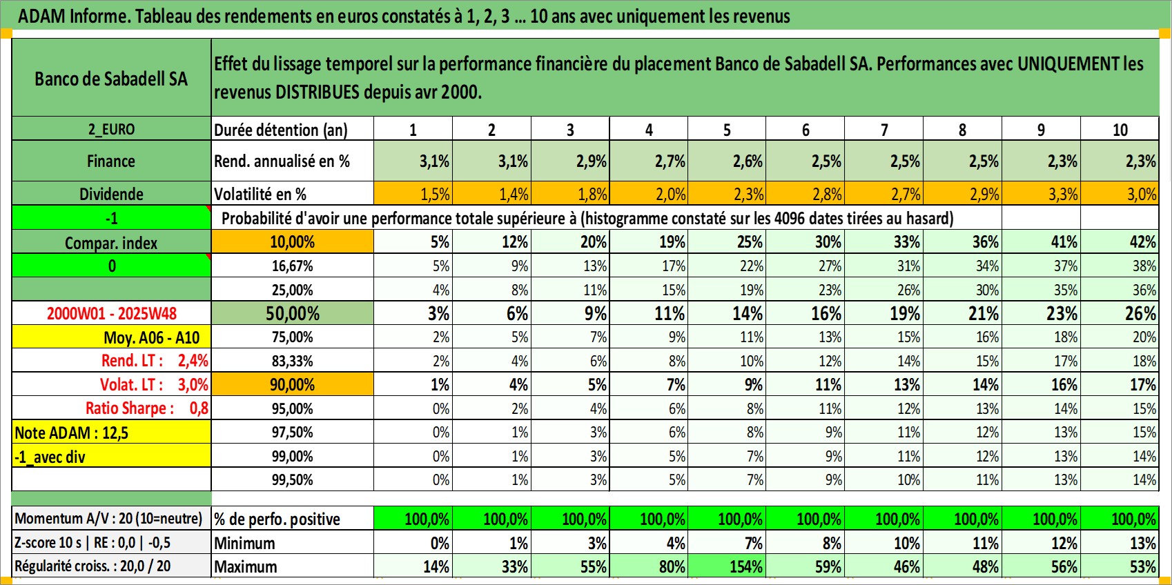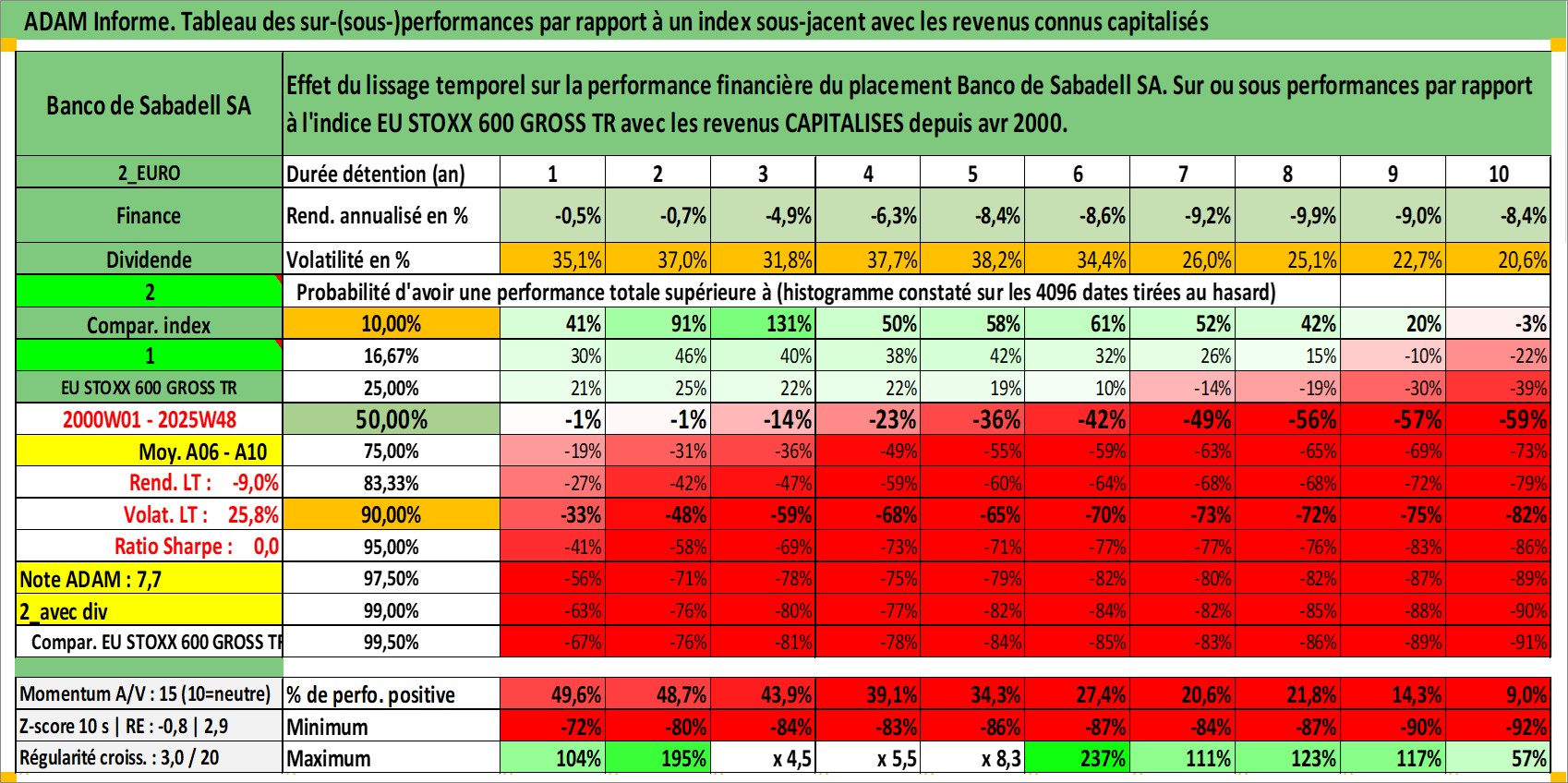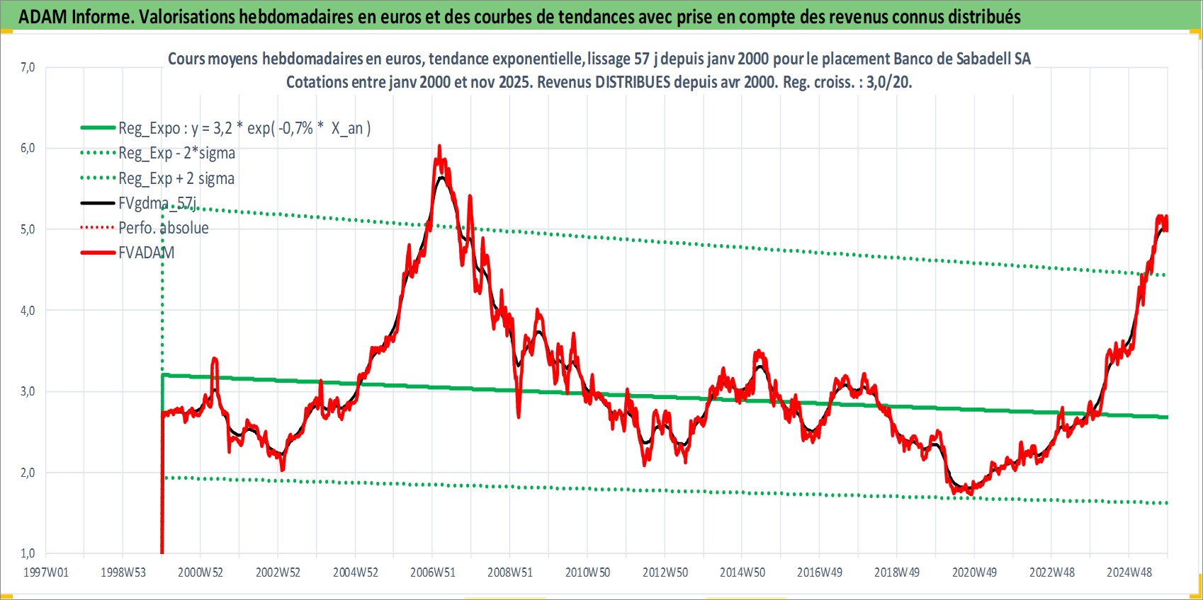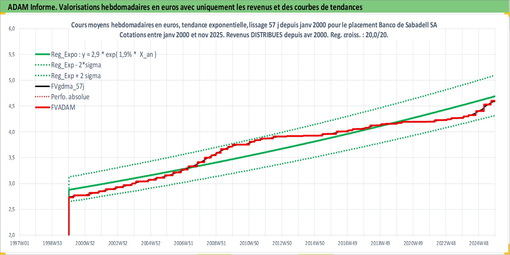 Site dédié aux investisseursPage dédiée sur site financeAnalyse des valorisations hebdomadaires de l'action Banco de Sabadell SA. Cet actif est cote en EUR. Les valorisations couvrent les semaines 2000W01 a 2025W48. Les revenus de cet actif financier sont pris en compte depuis la semaine 2000W16. La note globale ESG de cet actif est estimee a 11.0 (apres rebasage entre 0 et 20).
