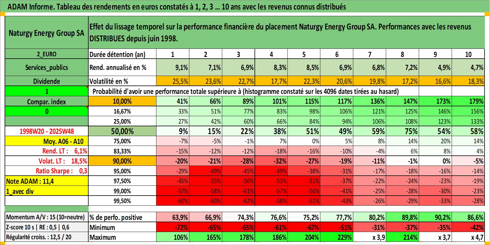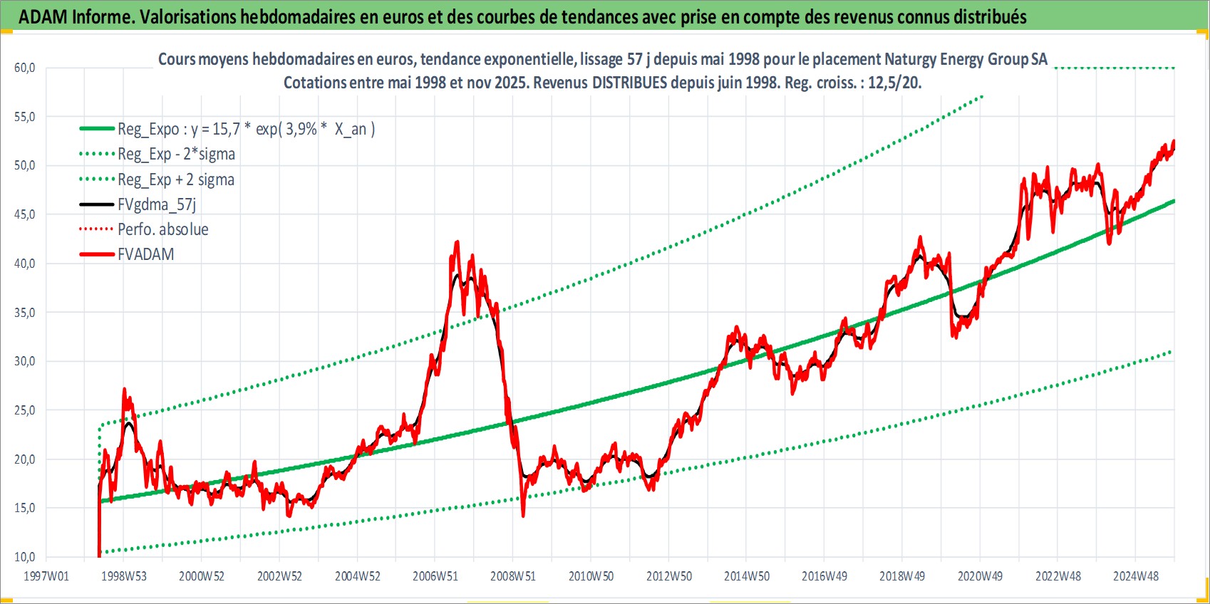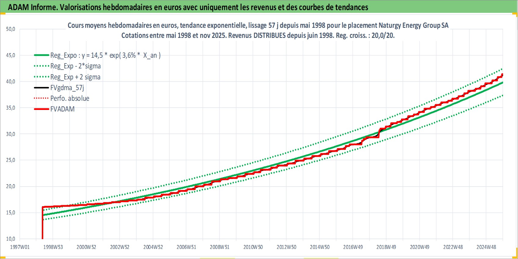 Site dédié aux investisseursPage dédiée sur site financeAnalyse des valorisations hebdomadaires de l'action Naturgy Energy Group SA. Cet actif est cote en EUR. Les valorisations couvrent les semaines 1998W20 a 2025W48. Les revenus de cet actif financier sont pris en compte depuis la semaine 1998W27. La note globale ESG de cet actif est estimee a 11.0 (apres rebasage entre 0 et 20).