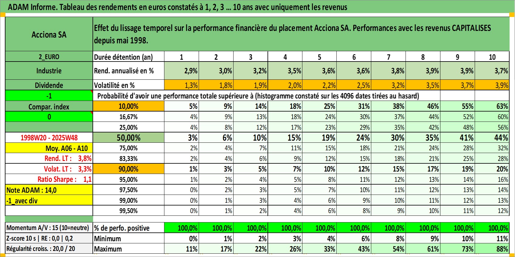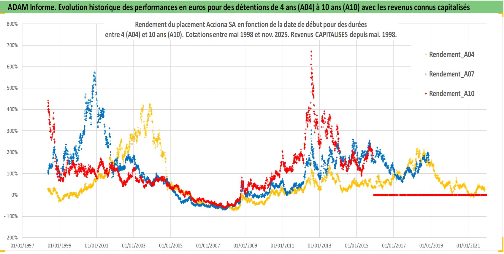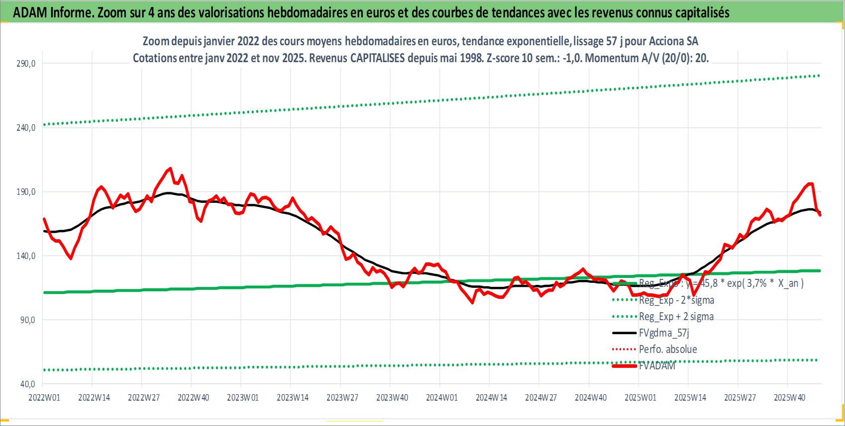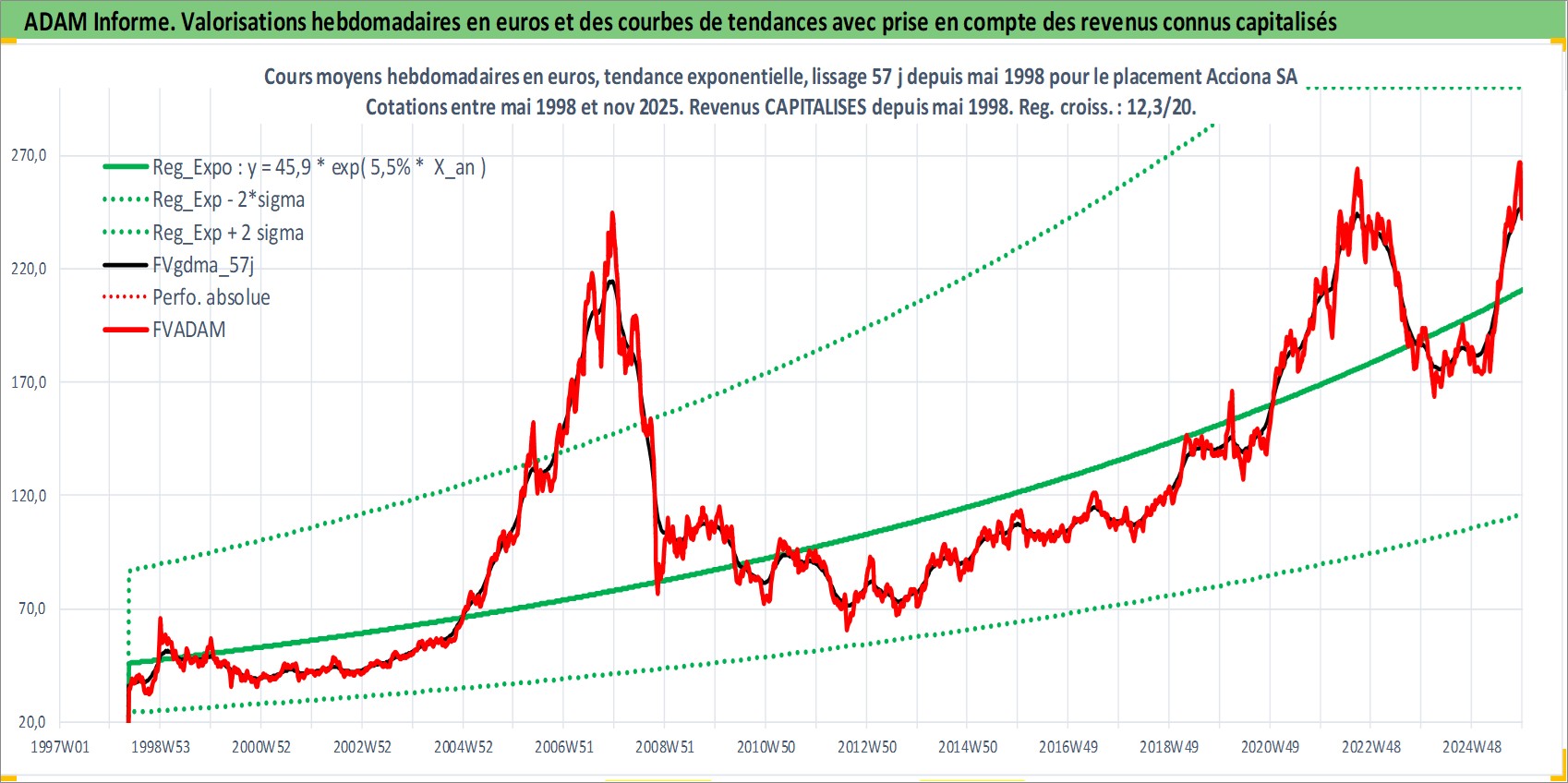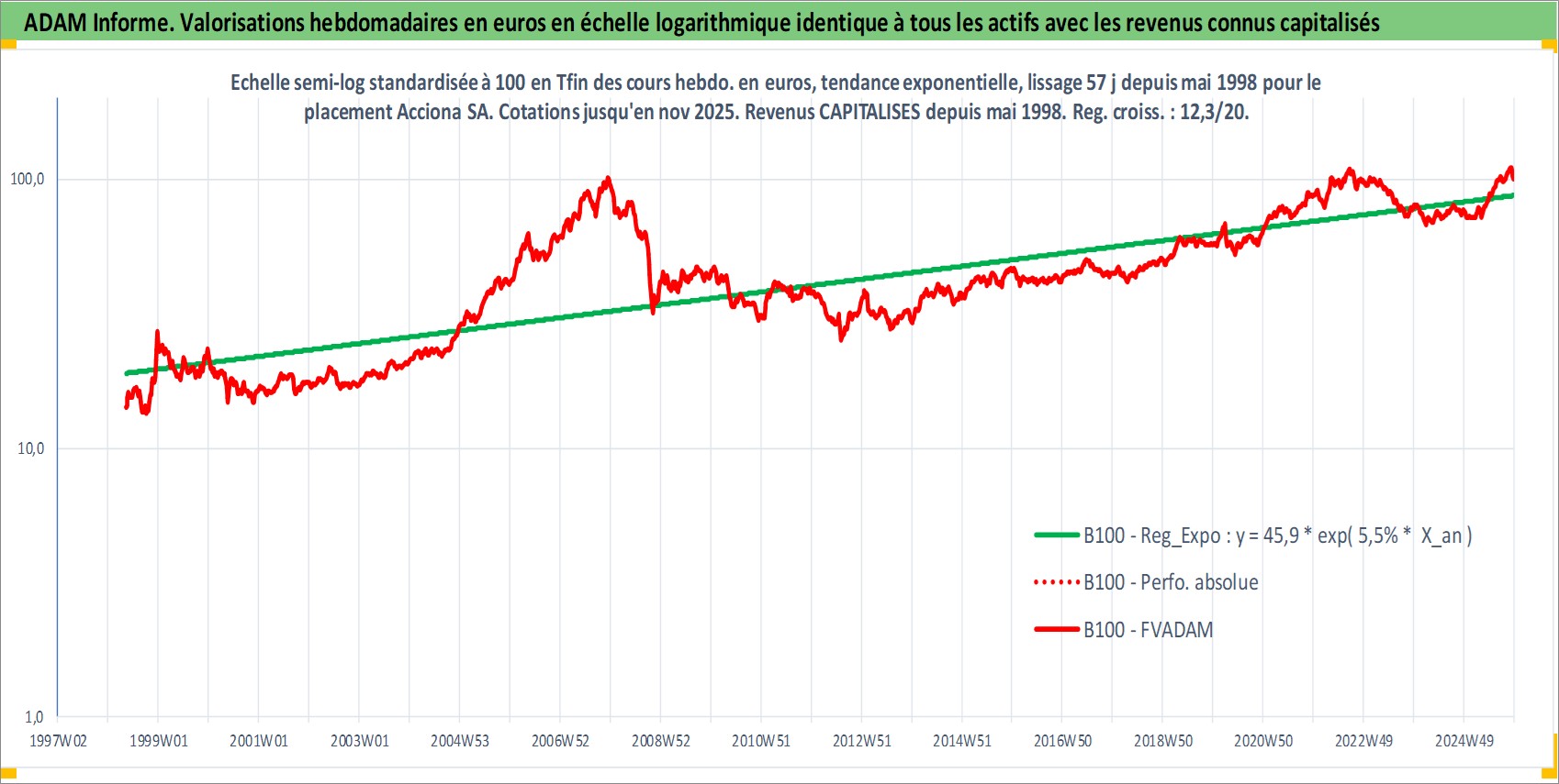 Site dédié aux investisseursPage dédiée sur site financeAnalyse des valorisations hebdomadaires de l'action Acciona SA. Cet actif est cote en EUR. Les valorisations couvrent les semaines 1998W20 a 2025W48. Les revenus de cet actif financier sont pris en compte depuis la semaine 1998W20. La note ESG de cet actif n'est pas connue.