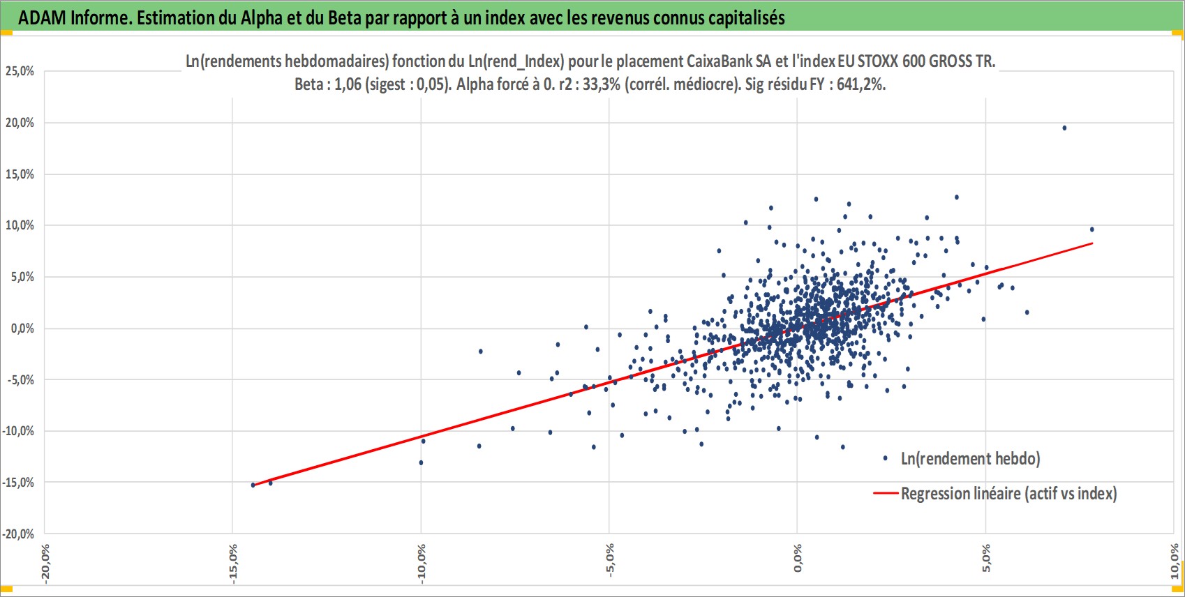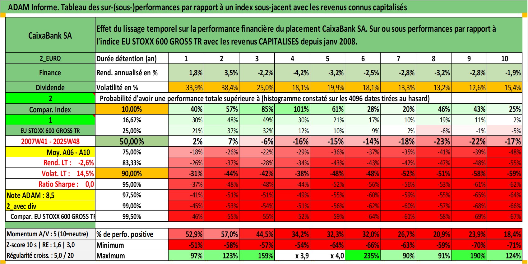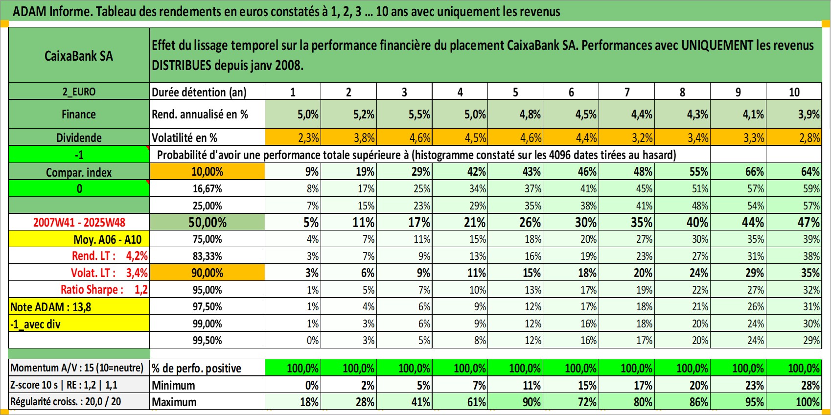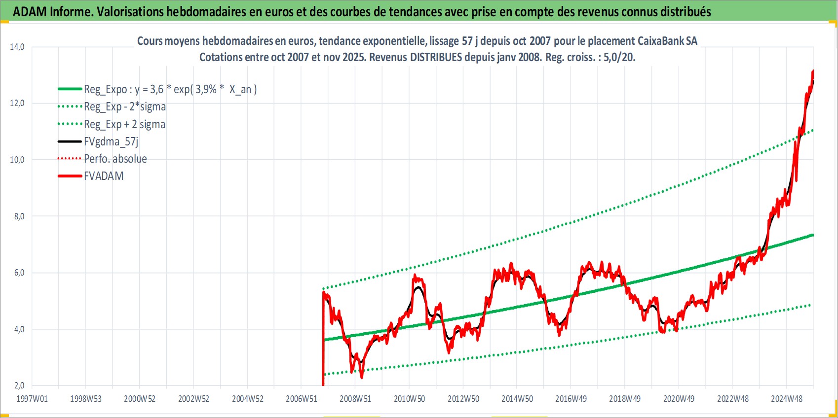 Site dédié aux investisseursPage dédiée sur site financeAnalyse des valorisations hebdomadaires de l'action CaixaBank SA. Cet actif est cote en EUR. Les valorisations couvrent les semaines 2007W41 a 2025W48. Les revenus de cet actif financier sont pris en compte depuis la semaine 2008W03. La note globale ESG de cet actif est estimee a 11.0 (apres rebasage entre 0 et 20).