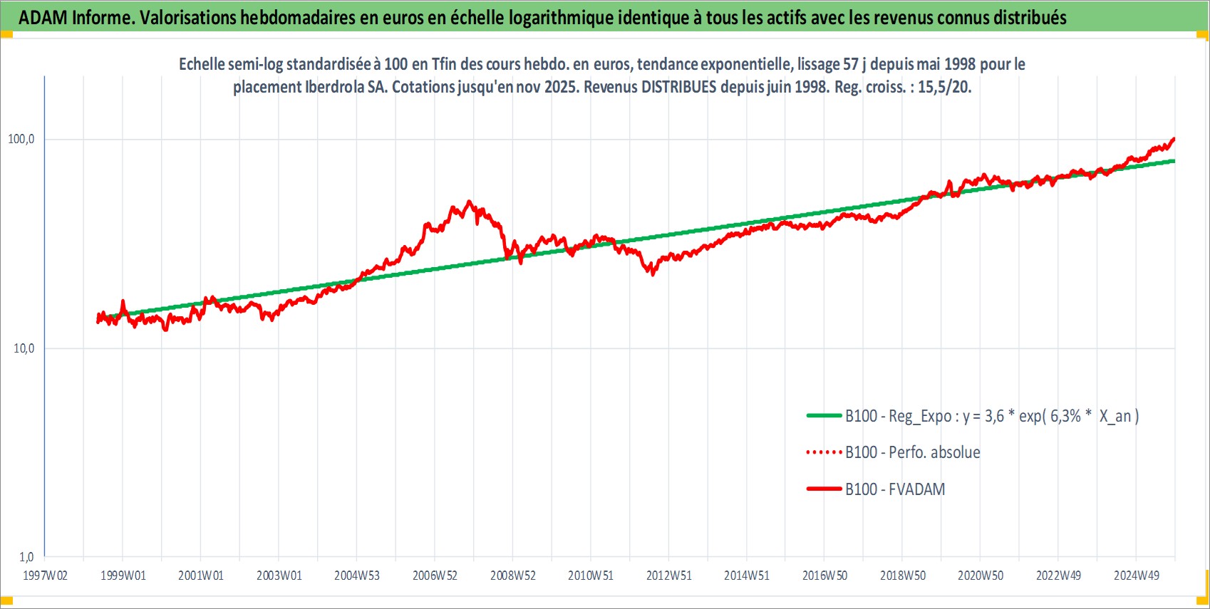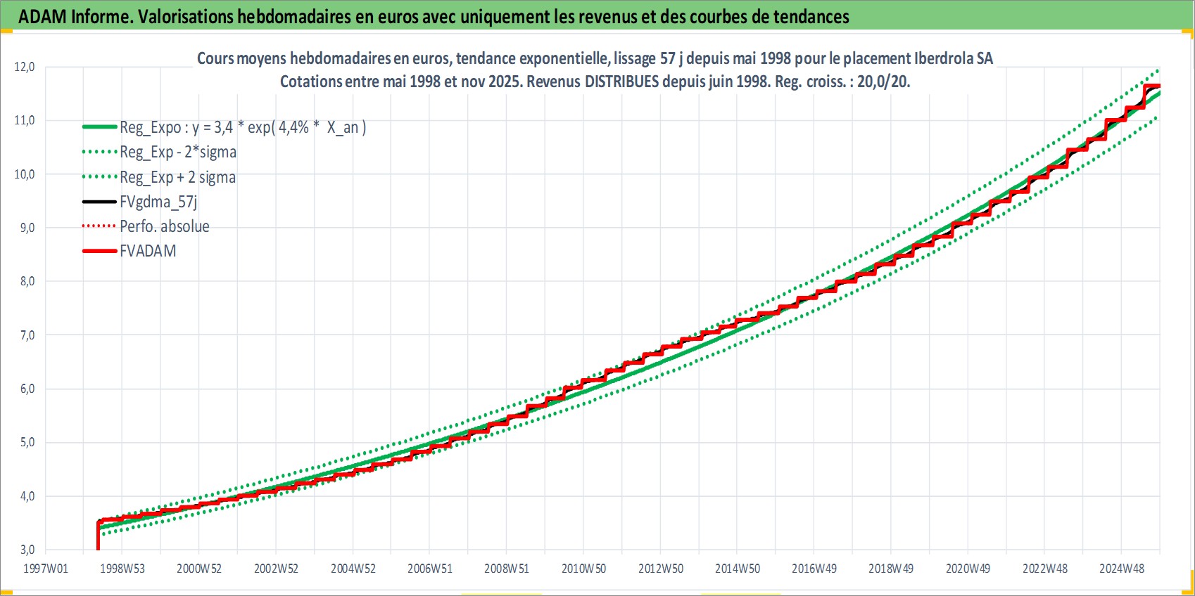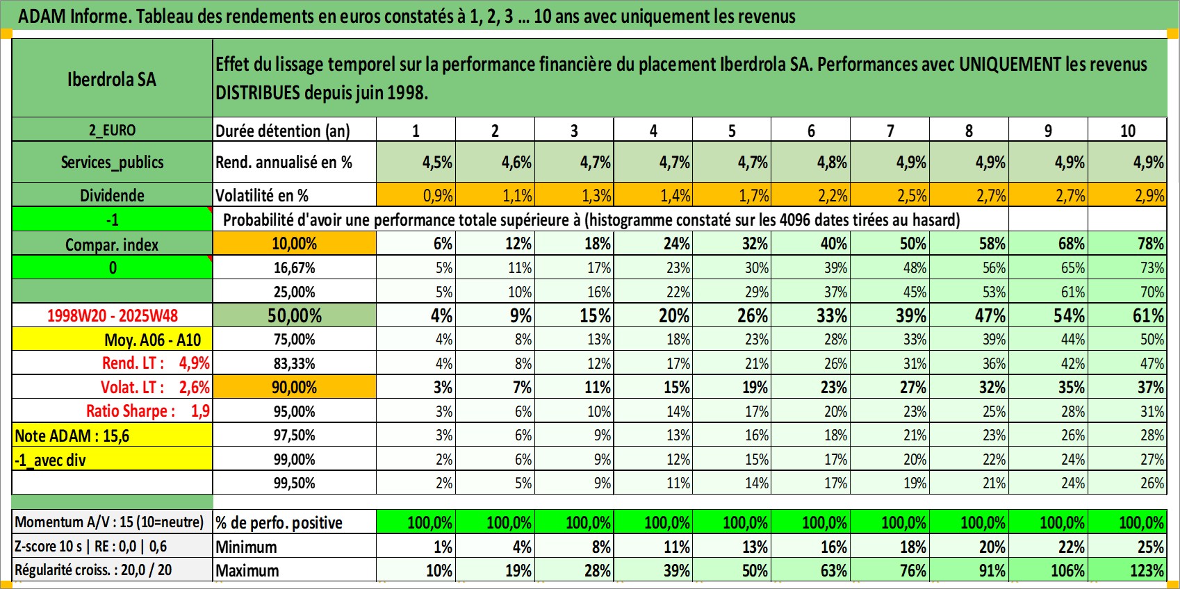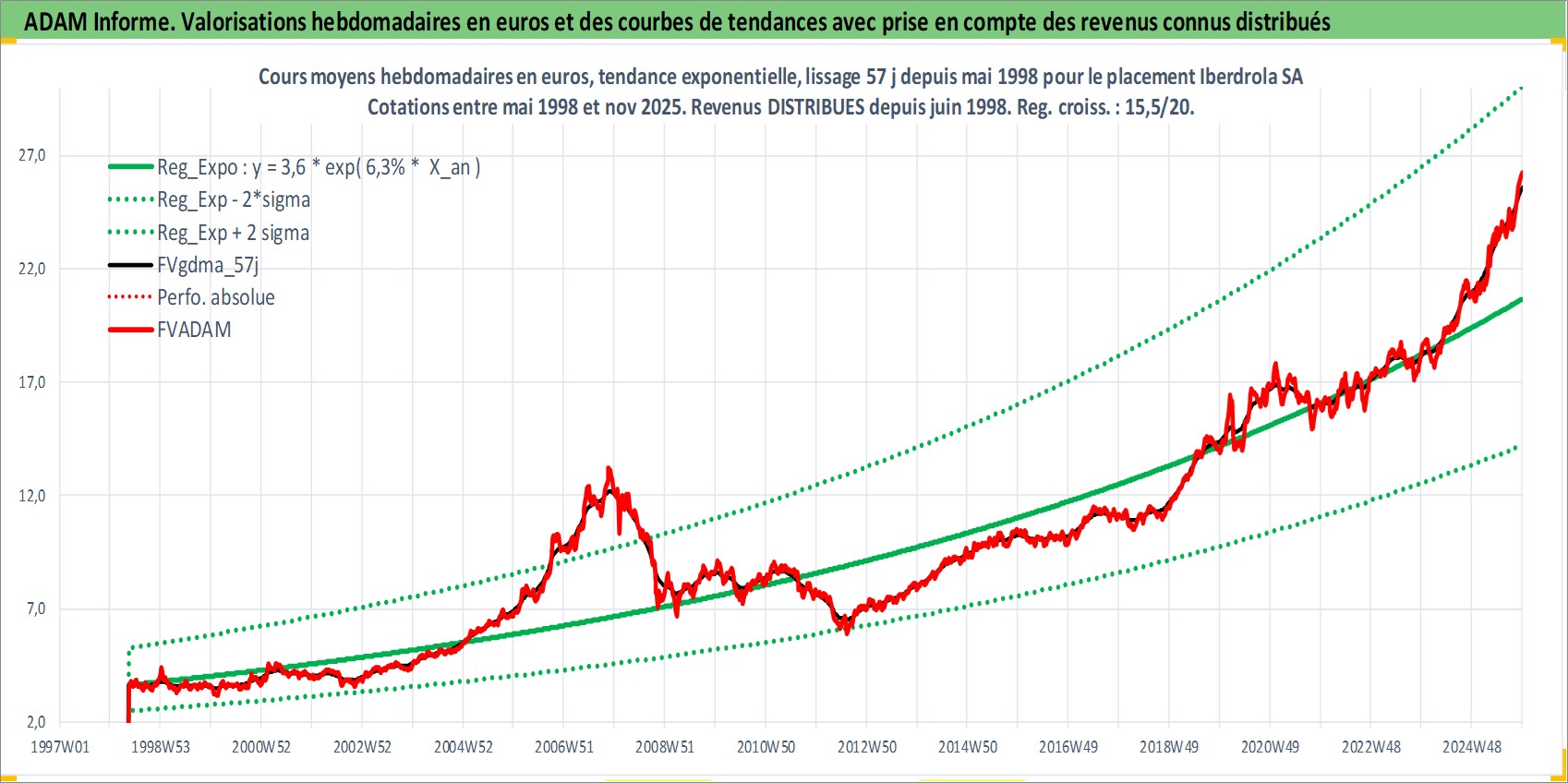 Site dédié aux investisseursPage dédiée sur site financeAnalyse des valorisations hebdomadaires de l'action Iberdrola SA. Cet actif est cote en EUR. Les valorisations couvrent les semaines 1998W20 a 2025W48. Les revenus de cet actif financier sont pris en compte depuis la semaine 1998W27. La note globale ESG de cet actif est estimee a 10.0 (apres rebasage entre 0 et 20).