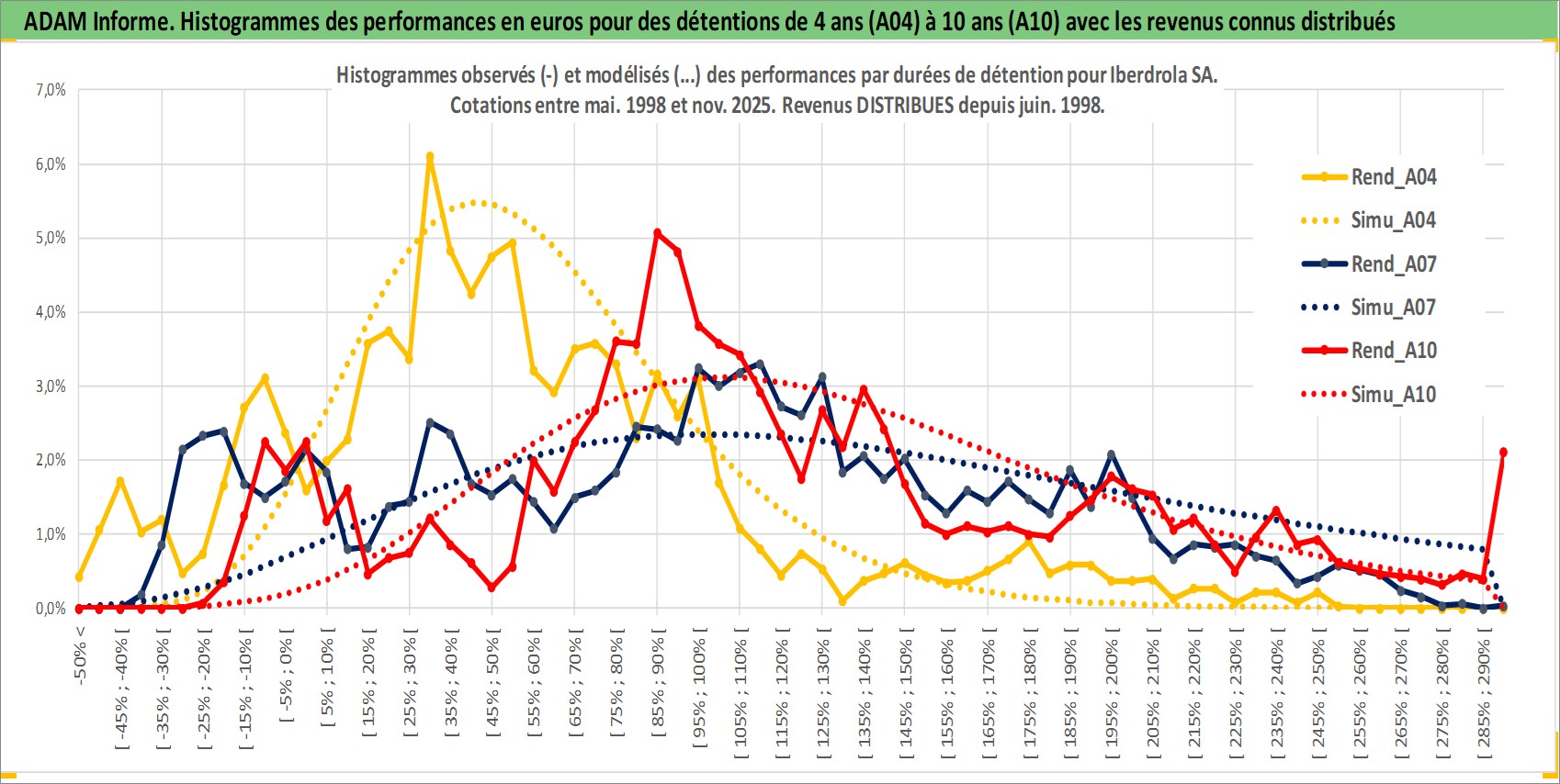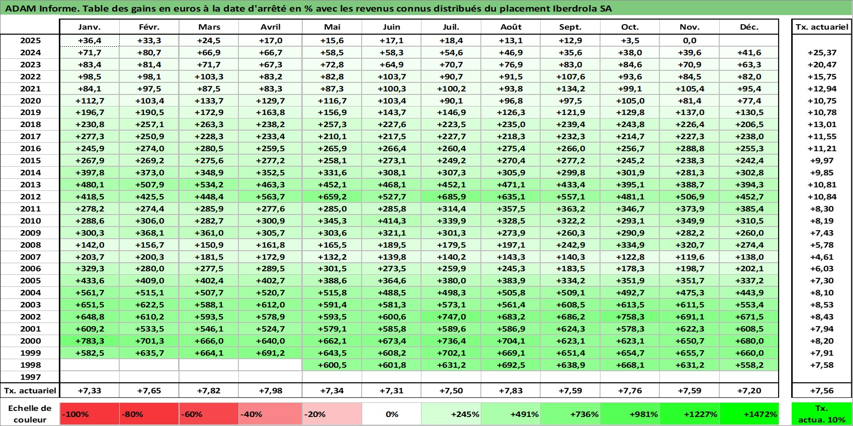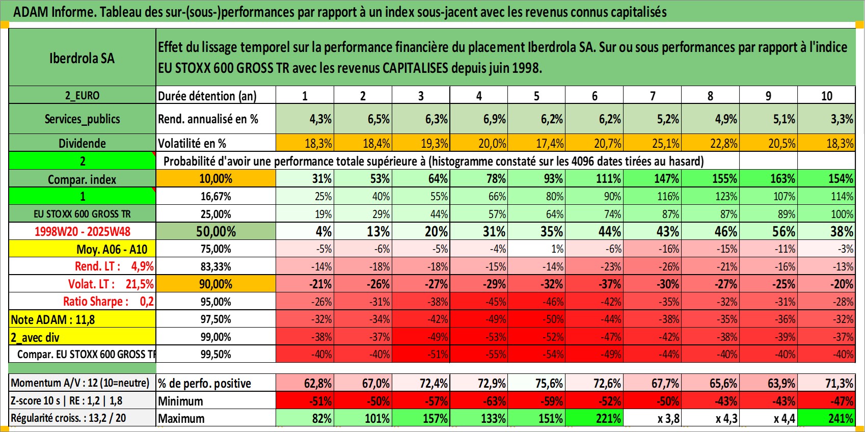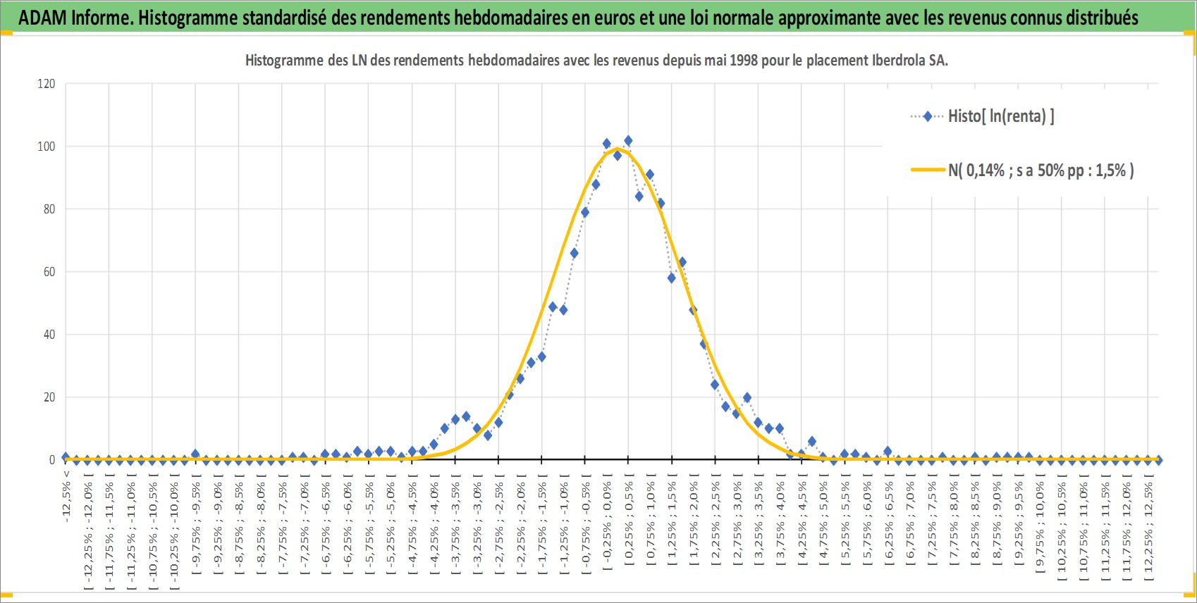 Site dédié aux investisseursPage dédiée sur site financeAnalyse des valorisations hebdomadaires de l'action Iberdrola SA. Cet actif est cote en EUR. Les valorisations couvrent les semaines 1998W20 a 2025W48. Les revenus de cet actif financier sont pris en compte depuis la semaine 1998W27. La note globale ESG de cet actif est estimee a 10.0 (apres rebasage entre 0 et 20).