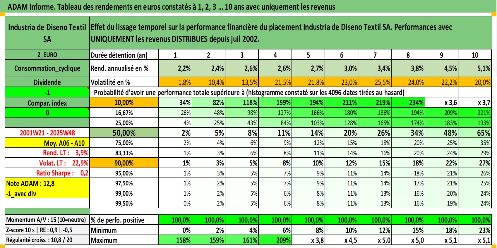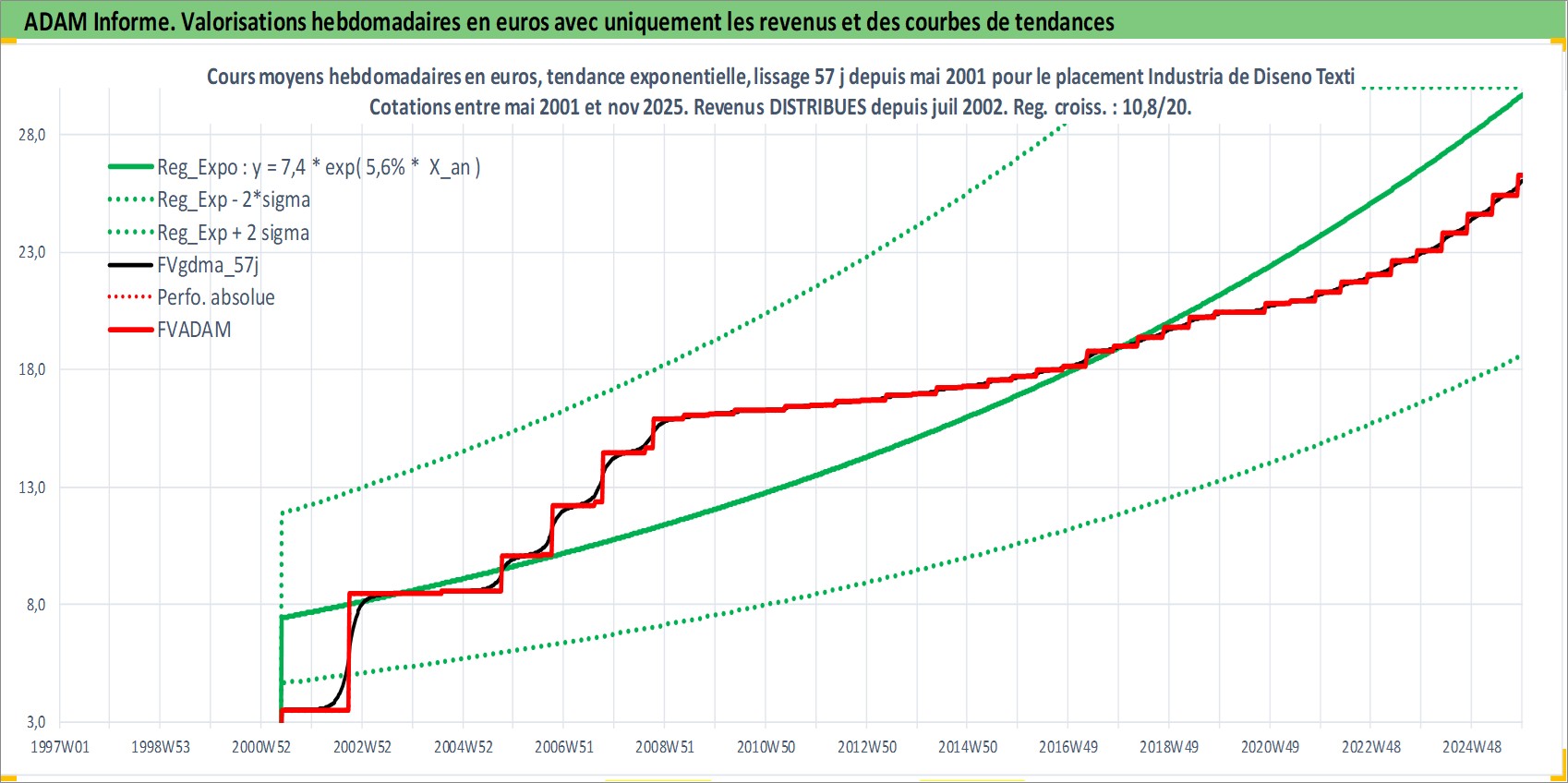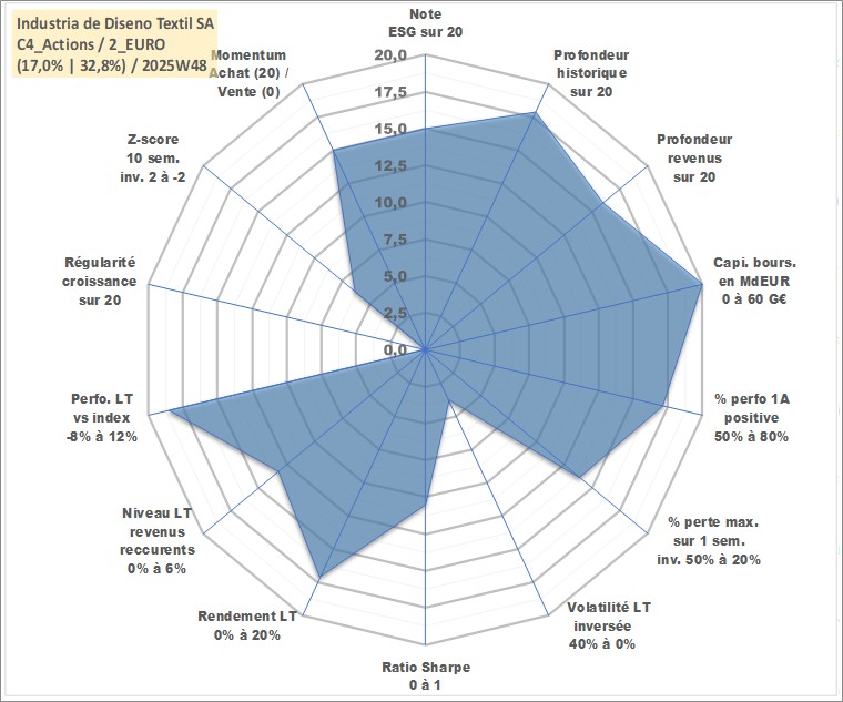 Site dédié aux investisseursPage dédiée sur site financeAnalyse des valorisations hebdomadaires de l'action Industria de Diseno Textil SA. Cet actif est cote en EUR. Les valorisations couvrent les semaines 2001W21 a 2025W48. Les revenus de cet actif financier sont pris en compte depuis la semaine 2002W30. La note globale ESG de cet actif est estimee a 15.0 (apres rebasage entre 0 et 20).