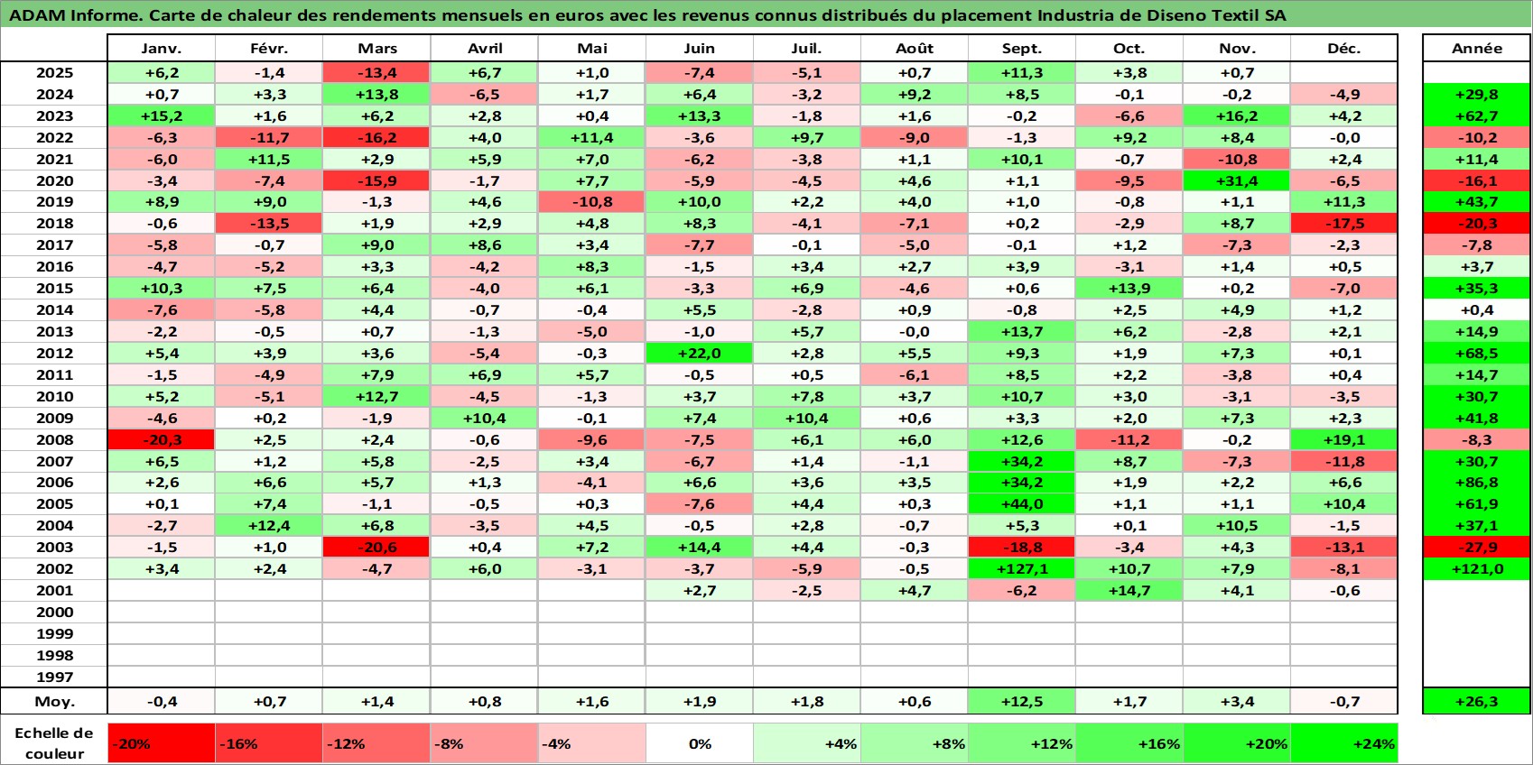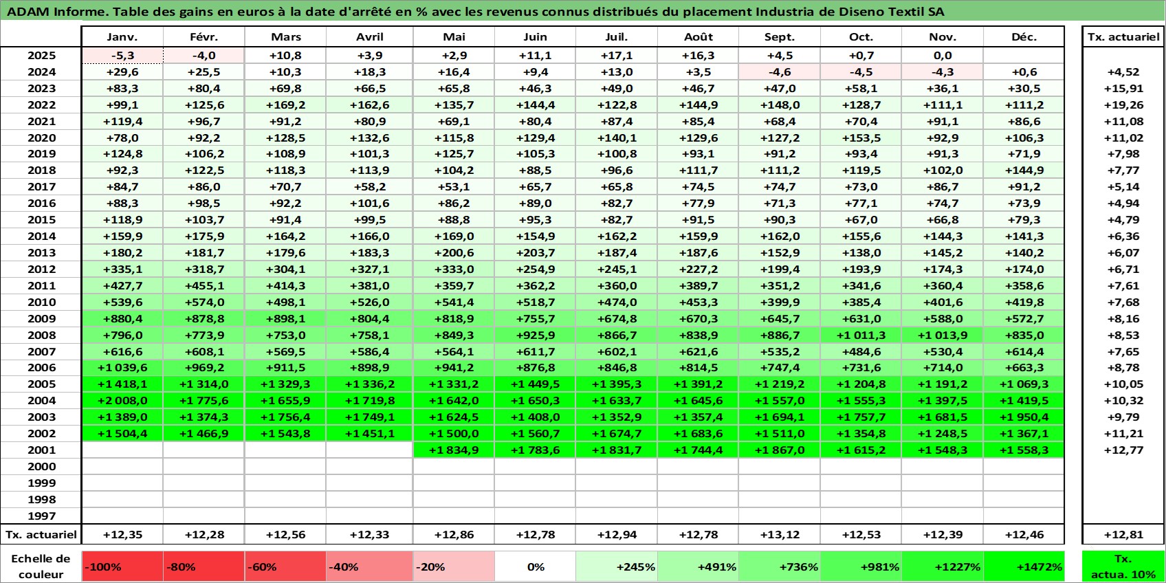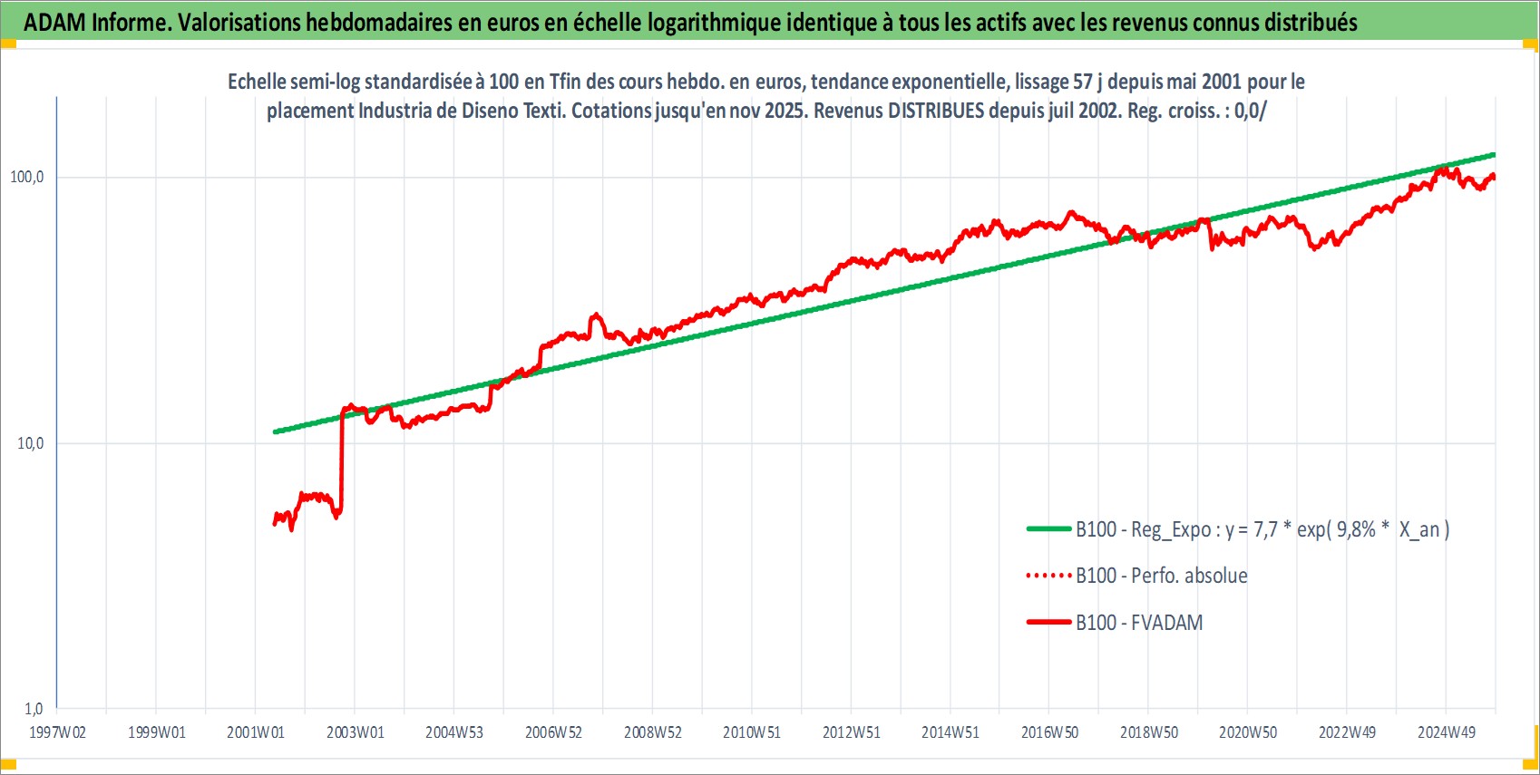 Site dédié aux investisseursPage dédiée sur site financeAnalyse des valorisations hebdomadaires de l'action Industria de Diseno Textil SA. Cet actif est cote en EUR. Les valorisations couvrent les semaines 2001W21 a 2025W48. Les revenus de cet actif financier sont pris en compte depuis la semaine 2002W30. La note globale ESG de cet actif est estimee a 15.0 (apres rebasage entre 0 et 20).