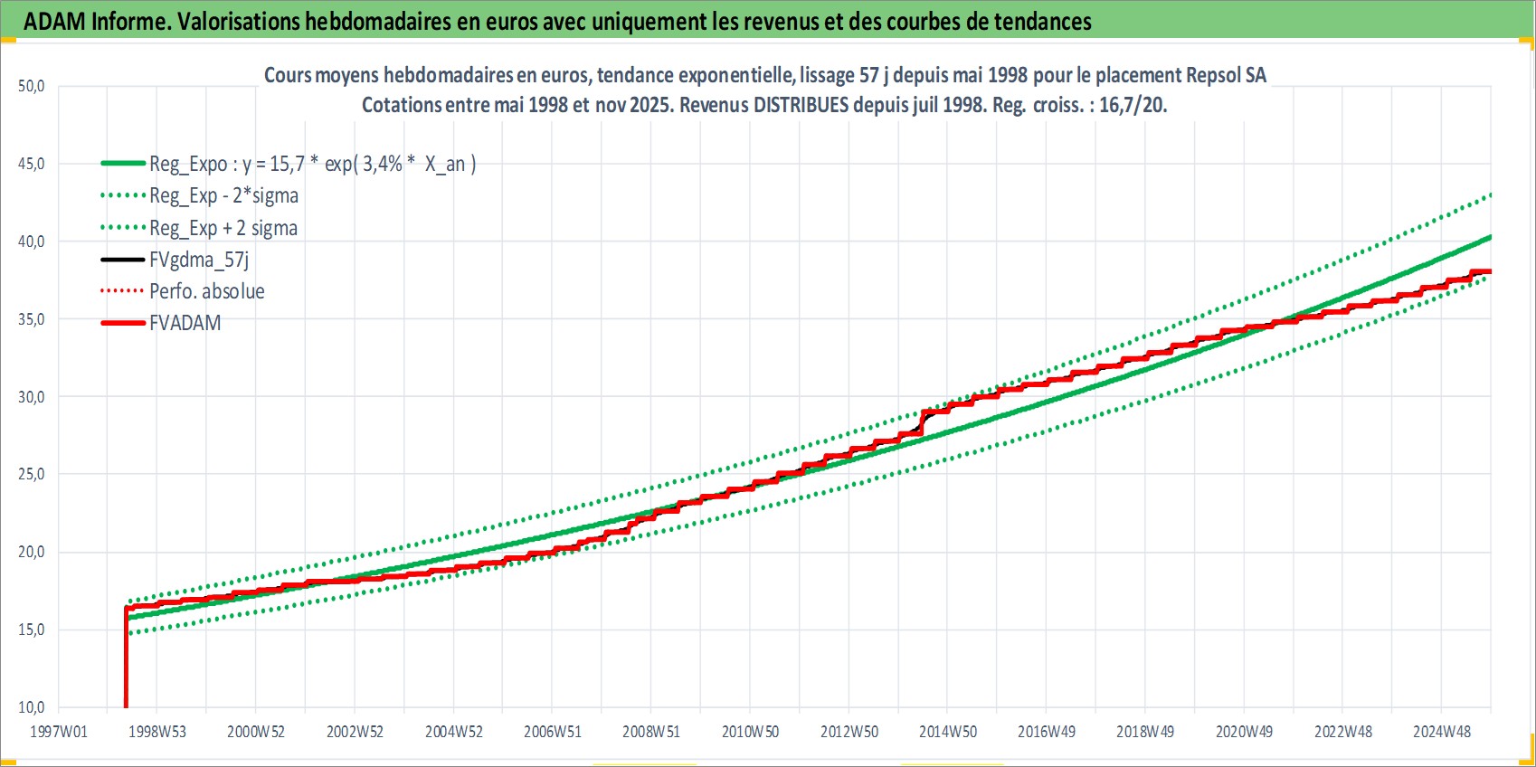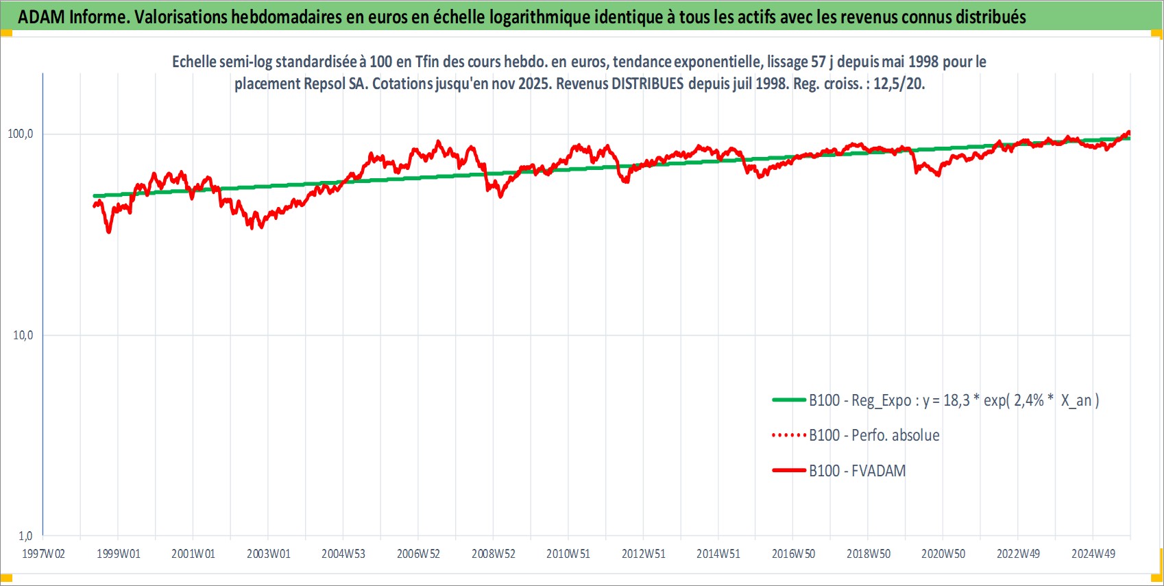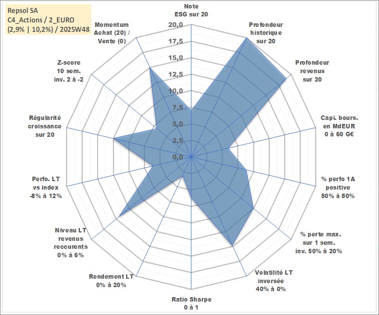 Site dédié aux investisseursPage dédiée sur site financeAnalyse des valorisations hebdomadaires de l'action Repsol SA. Cet actif est cote en EUR. Les valorisations couvrent les semaines 1998W20 a 2025W48. Les revenus de cet actif financier sont pris en compte depuis la semaine 1998W29. La note globale ESG de cet actif est estimee a 7.0 (apres rebasage entre 0 et 20).