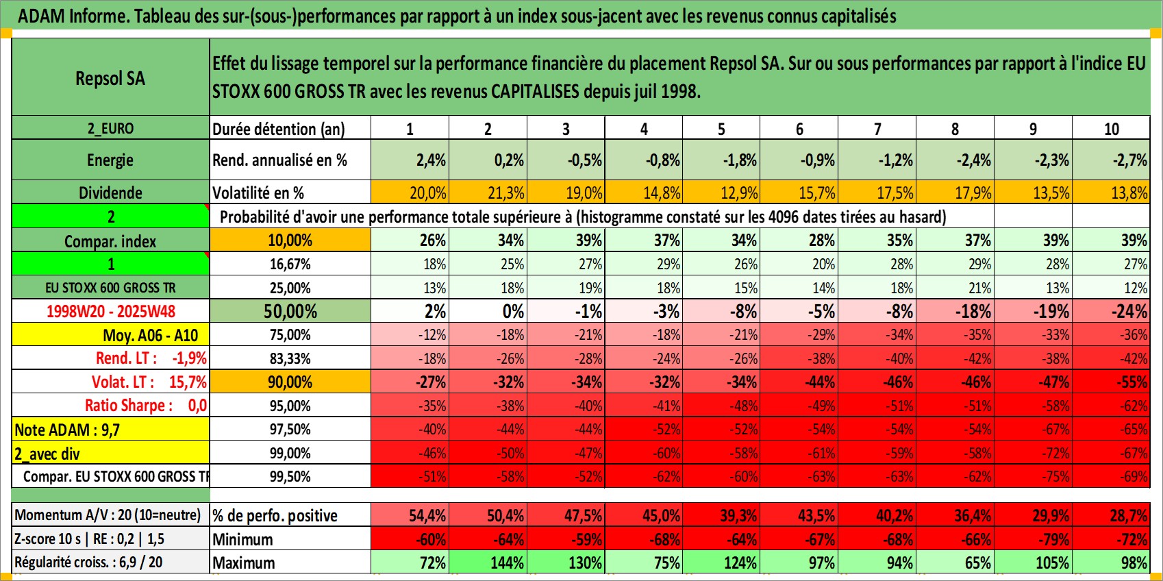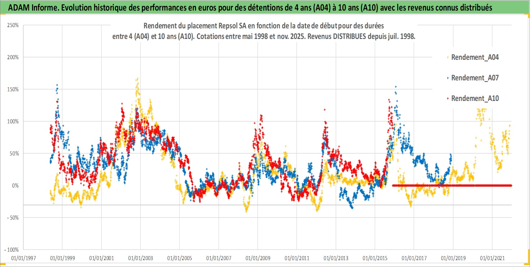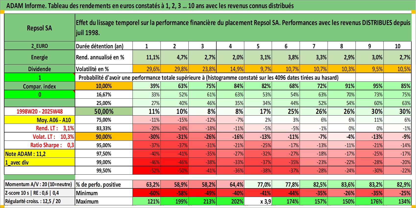 Site dédié aux investisseursPage dédiée sur site financeAnalyse des valorisations hebdomadaires de l'action Repsol SA. Cet actif est cote en EUR. Les valorisations couvrent les semaines 1998W20 a 2025W48. Les revenus de cet actif financier sont pris en compte depuis la semaine 1998W29. La note globale ESG de cet actif est estimee a 7.0 (apres rebasage entre 0 et 20).