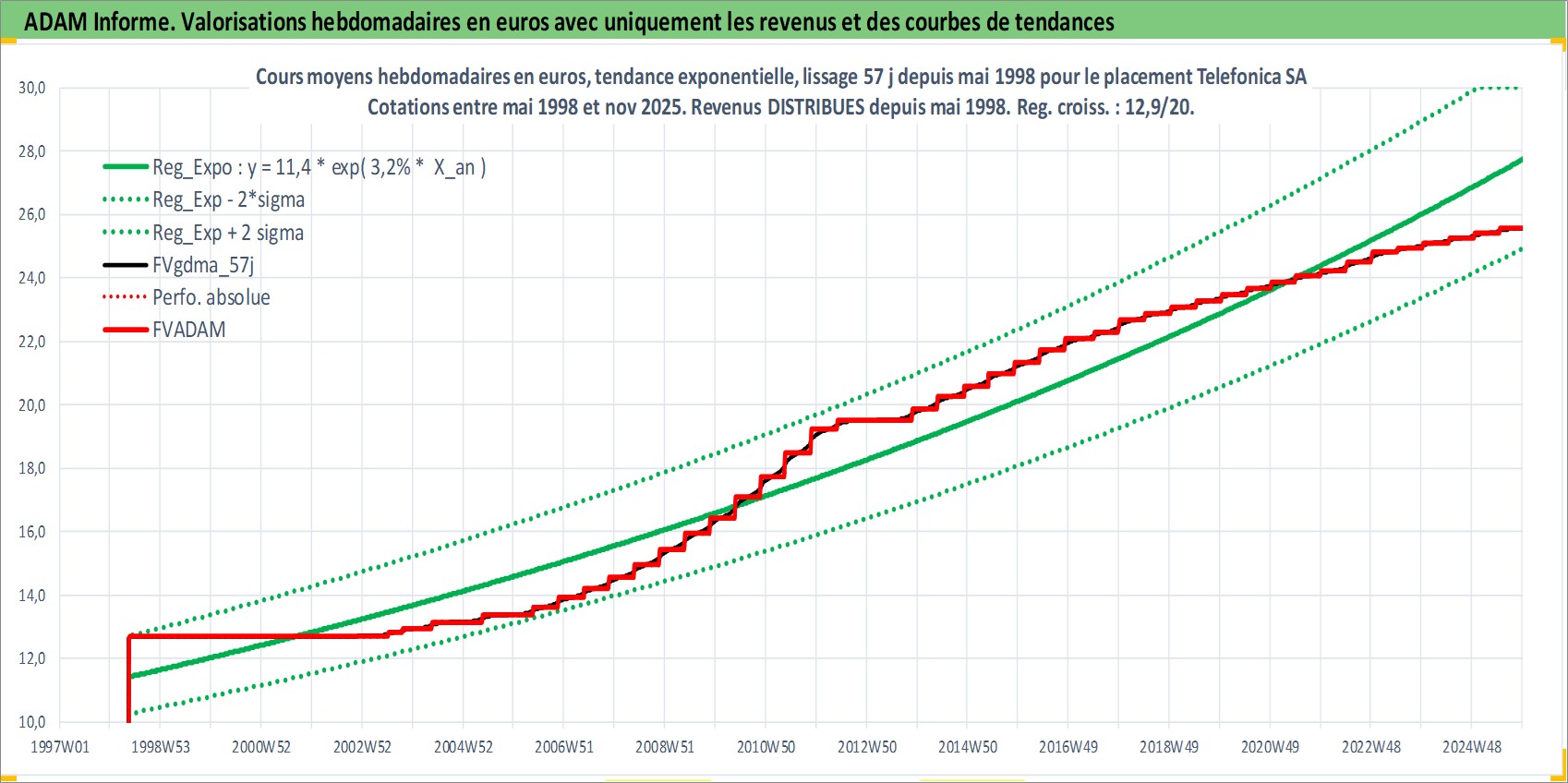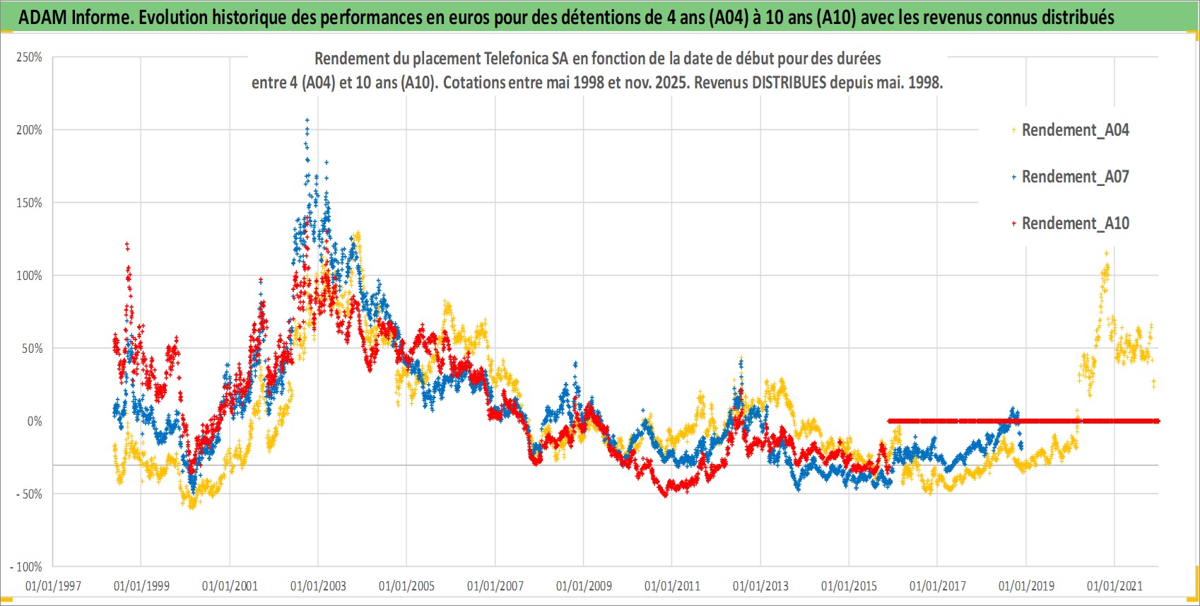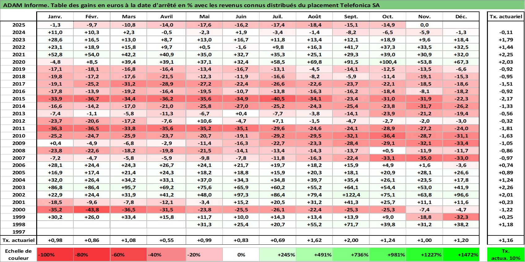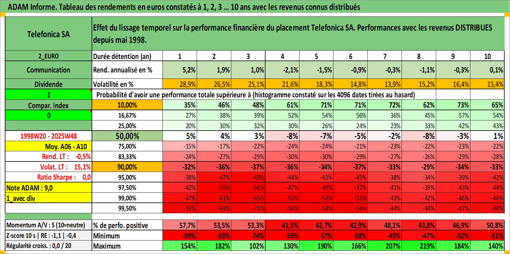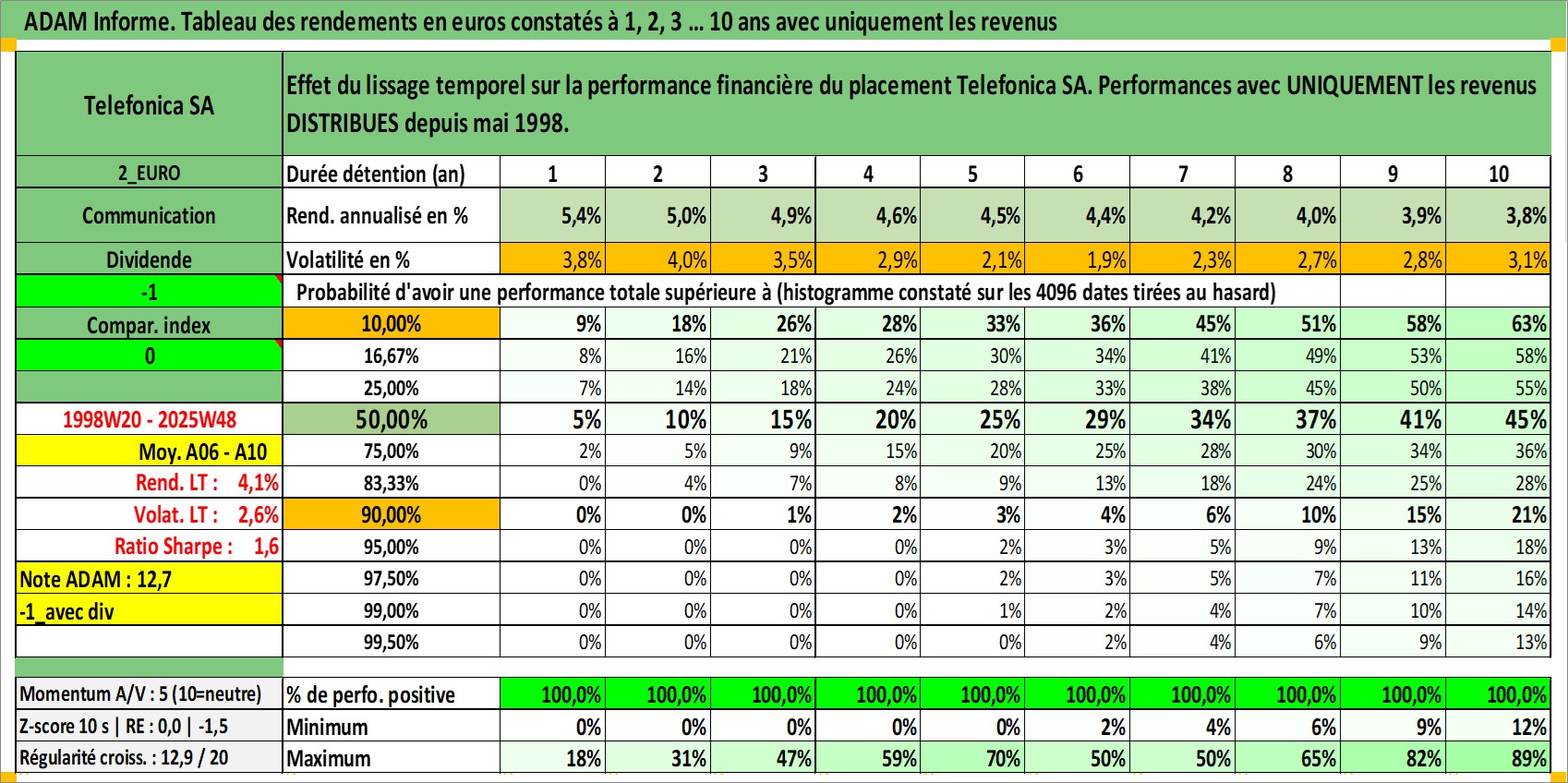 Site dédié aux investisseursPage dédiée sur site financeAnalyse des valorisations hebdomadaires de l'action Telefonica SA. Cet actif est cote en EUR. Les valorisations couvrent les semaines 1998W20 a 2025W48. Les revenus de cet actif financier sont pris en compte depuis la semaine 1998W21. La note globale ESG de cet actif est estimee a 12.0 (apres rebasage entre 0 et 20).