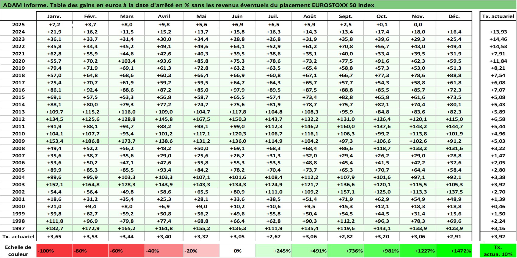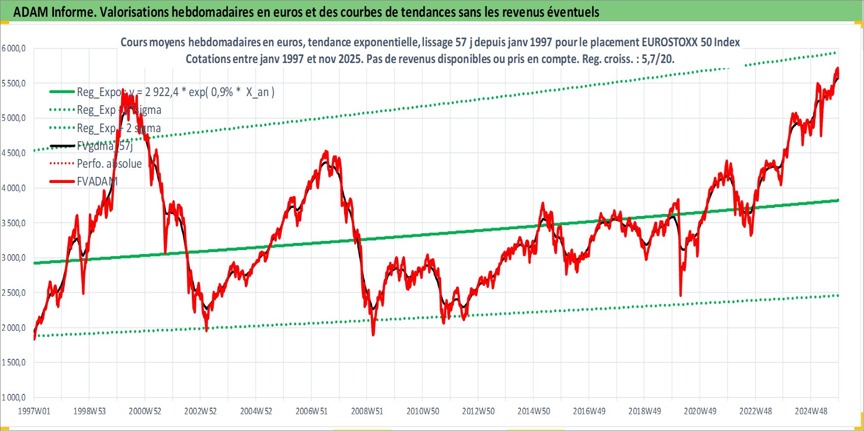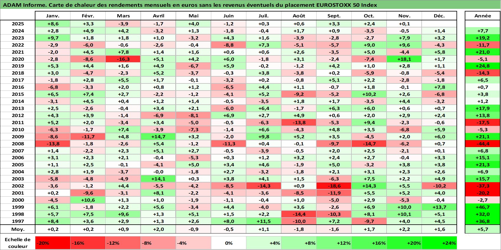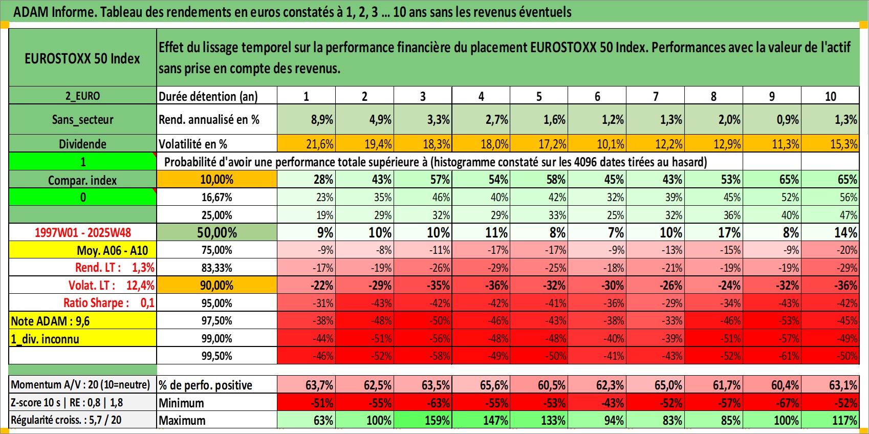 Site dédié aux investisseursPage dédiée sur site financeAnalyse des valorisations hebdomadaires de l'actif EUROSTOXX 50 Index. Cet actif est cote en EUR. Les valorisations couvrent les semaines 1997W01 a 2025W48. Les revenus de cet actif financier ne sont pas connus car non existants ou non disponibles sur le site Yahoo Finance. La note ESG de cet actif n'est pas connue.