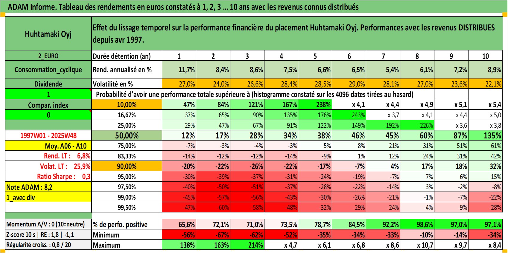Site dédié aux investisseursPage dédiée sur site financeAnalyse des valorisations hebdomadaires de l'action Huhtamaki Oyj. Cet actif est cote en EUR. Les valorisations couvrent les semaines 1997W01 a 2025W48. Les revenus de cet actif financier sont pris en compte depuis la semaine 1997W15. La note ESG de cet actif n'est pas connue.