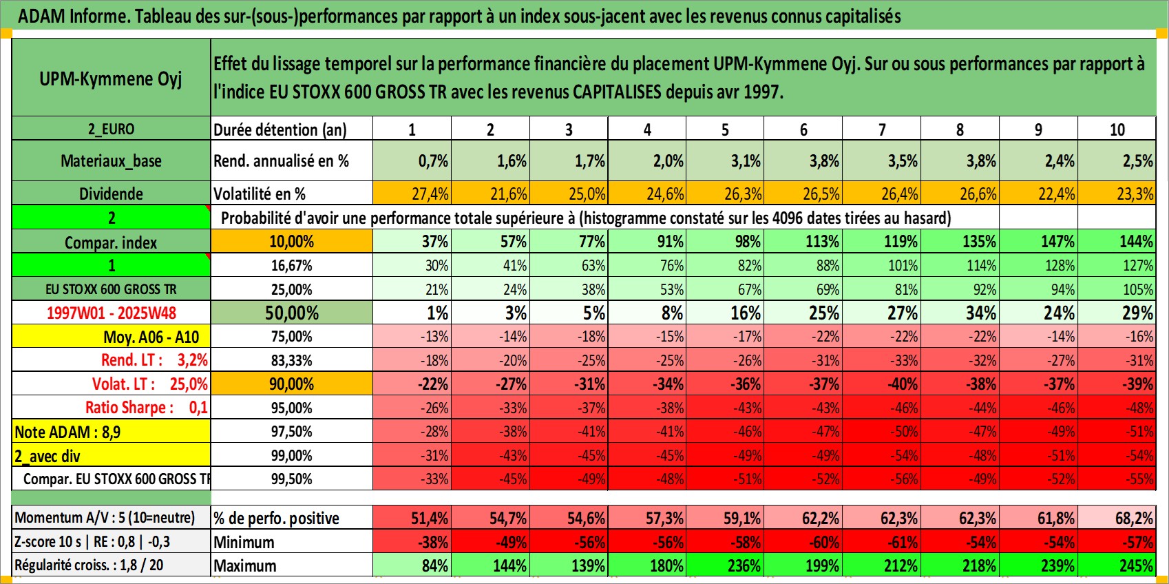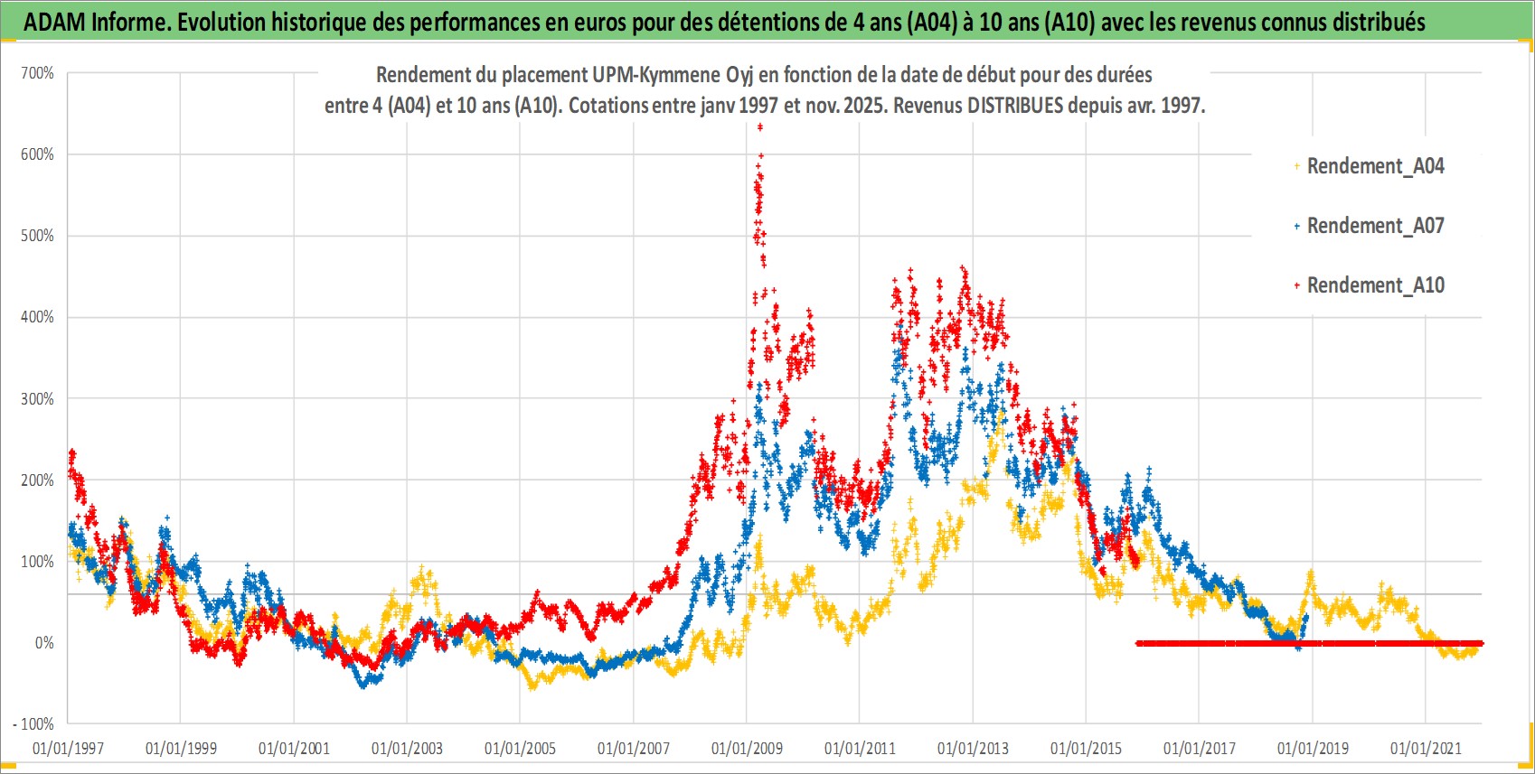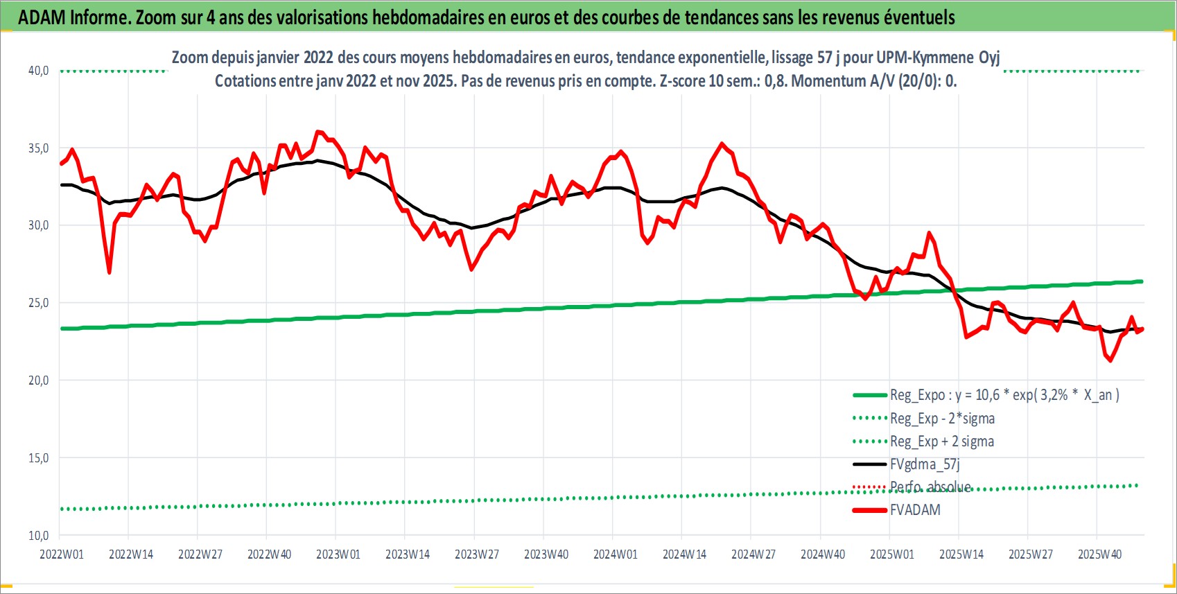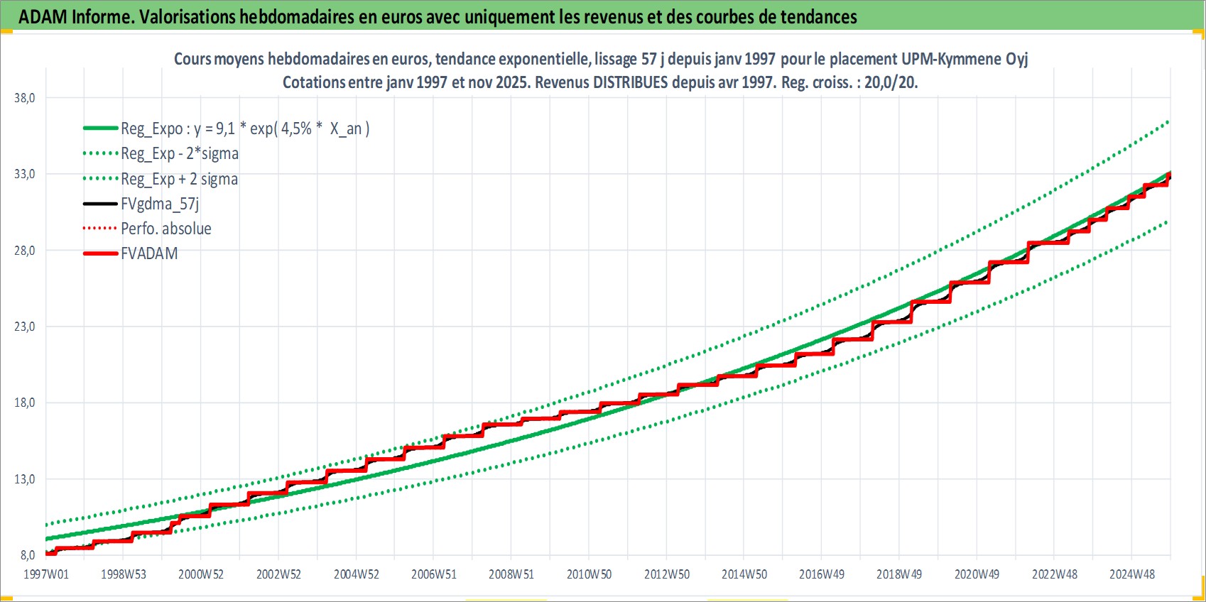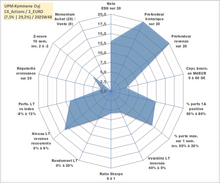 Site dédié aux investisseursPage dédiée sur site financeAnalyse des valorisations hebdomadaires de l'action UPM-Kymmene Oyj. Cet actif est cote en EUR. Les valorisations couvrent les semaines 1997W01 a 2025W48. Les revenus de cet actif financier sont pris en compte depuis la semaine 1997W15. La note globale ESG de cet actif est estimee a 13.0 (apres rebasage entre 0 et 20).