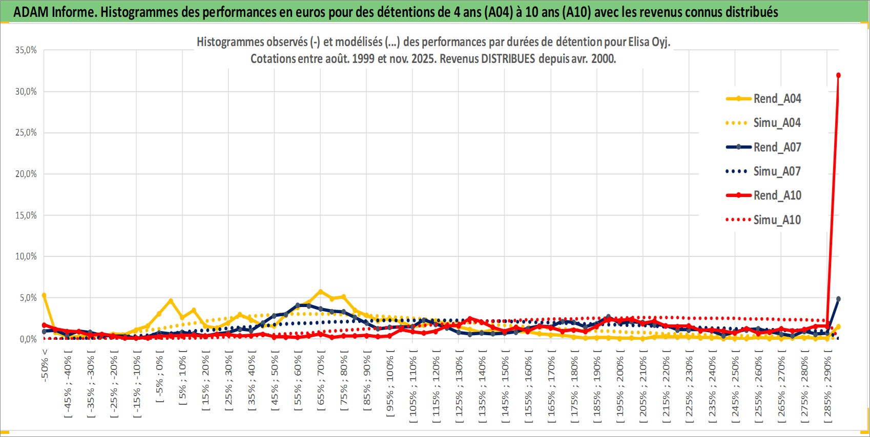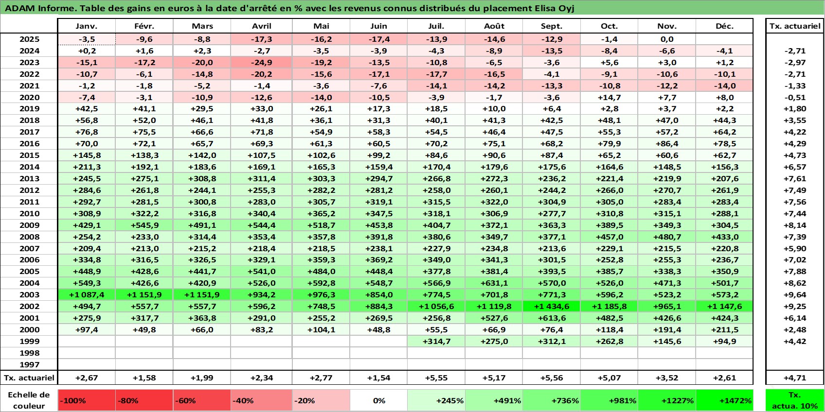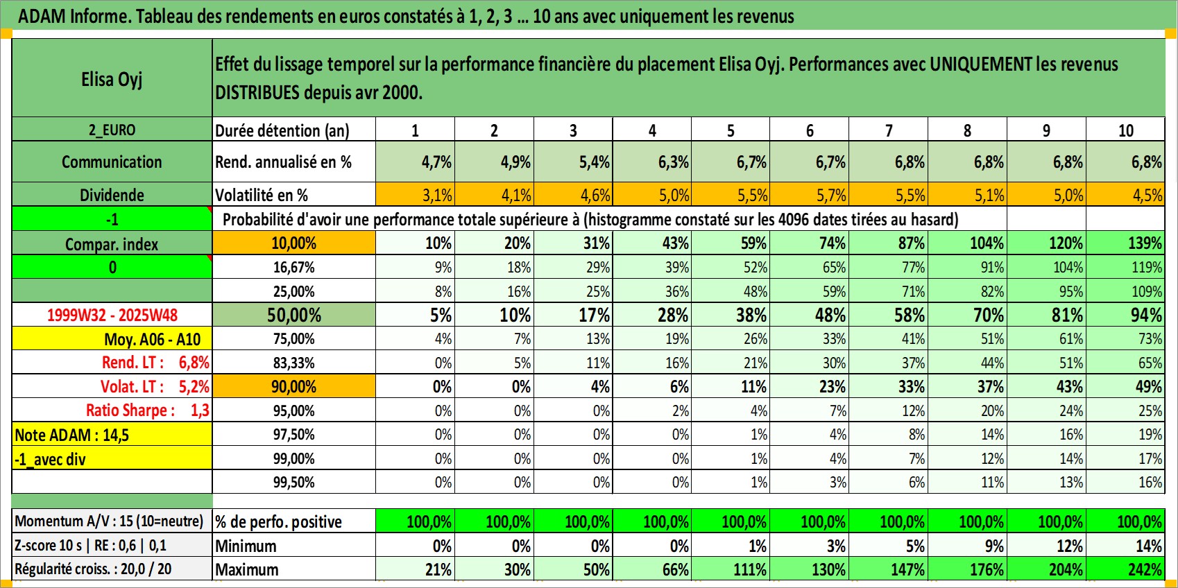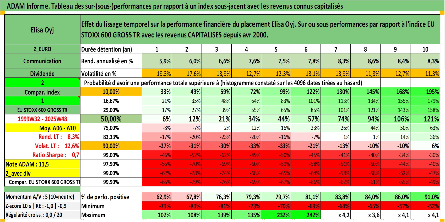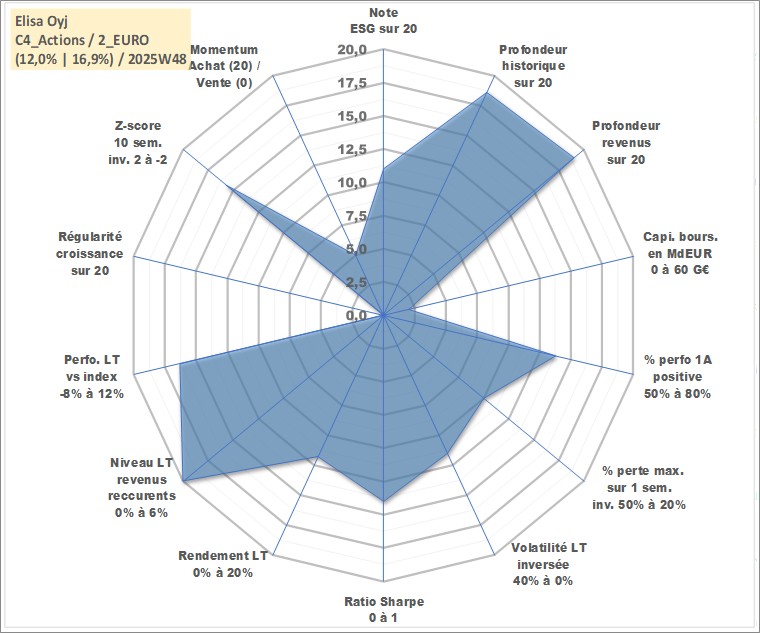 Site dédié aux investisseursPage dédiée sur site financeAnalyse des valorisations hebdomadaires de l'action Elisa Oyj. Cet actif est cote en EUR. Les valorisations couvrent les semaines 1999W32 a 2025W48. Les revenus de cet actif financier sont pris en compte depuis la semaine 2000W15. La note globale ESG de cet actif est estimee a 11.0 (apres rebasage entre 0 et 20).