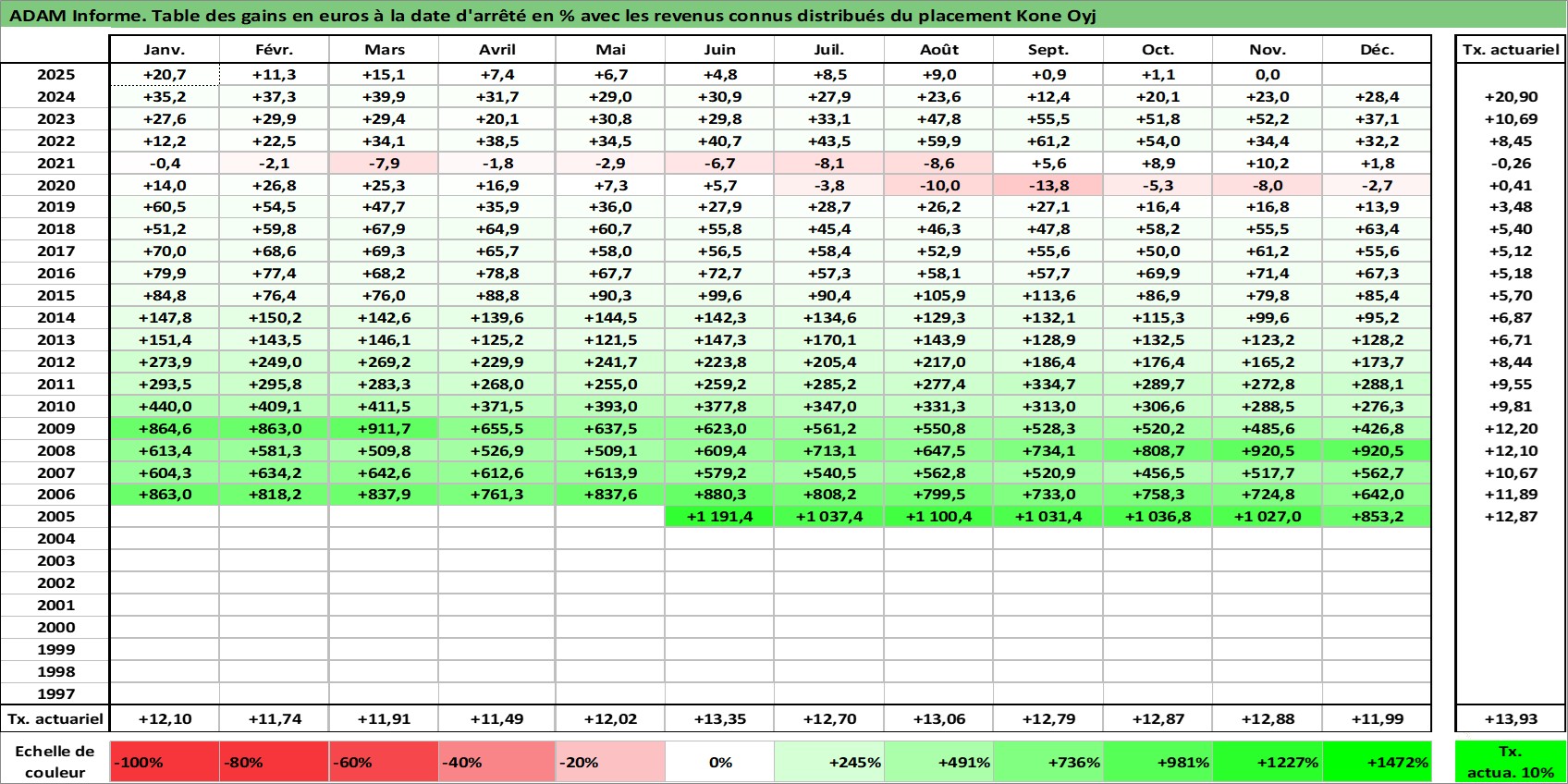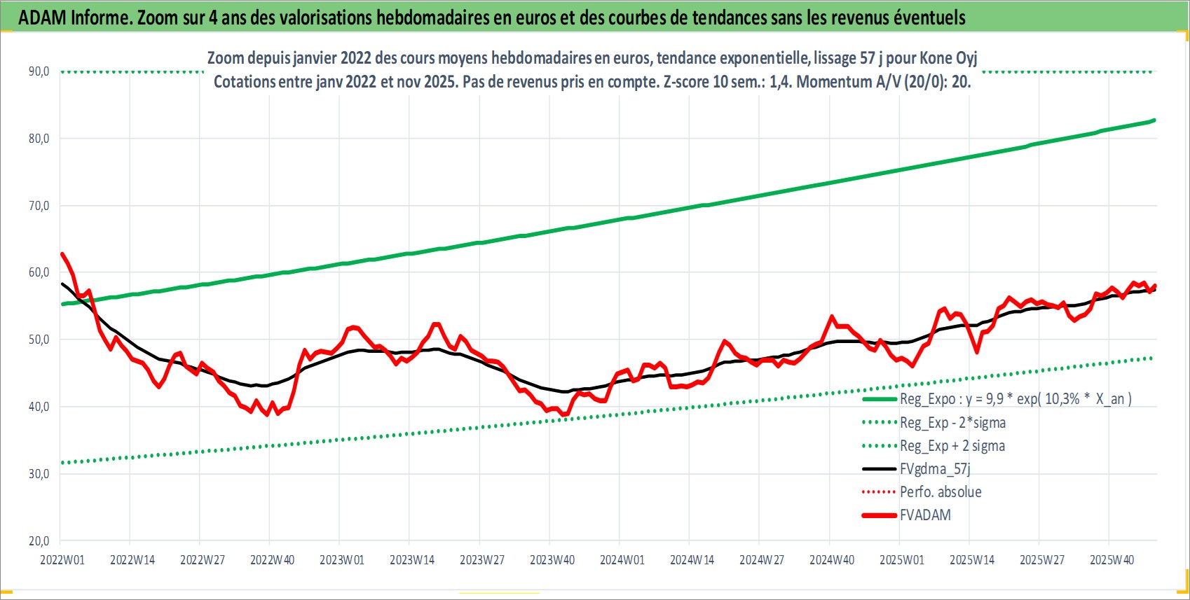 Site dédié aux investisseursPage dédiée sur site financeAnalyse des valorisations hebdomadaires de l'action Kone Oyj. Cet actif est cote en EUR. Les valorisations couvrent les semaines 2005W22 a 2025W48. Les revenus de cet actif financier sont pris en compte depuis la semaine 2006W09. La note globale ESG de cet actif est estimee a 11.0 (apres rebasage entre 0 et 20).