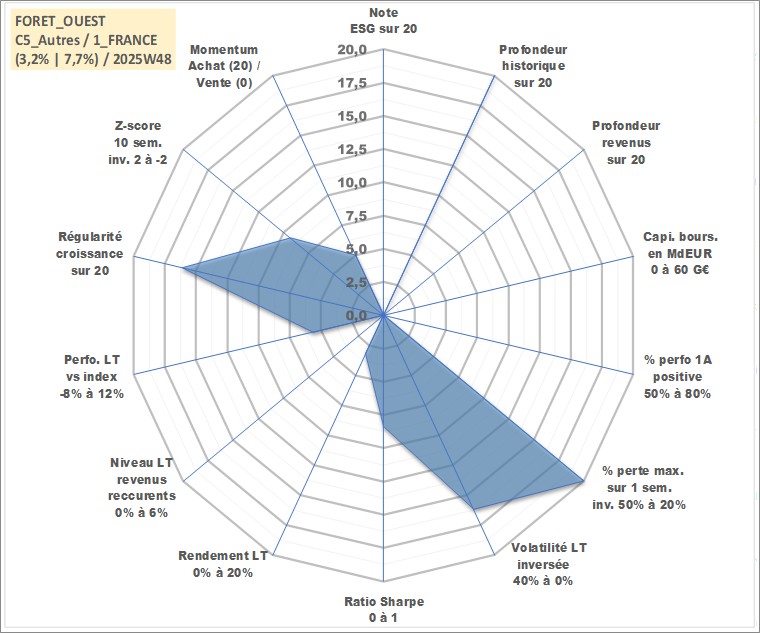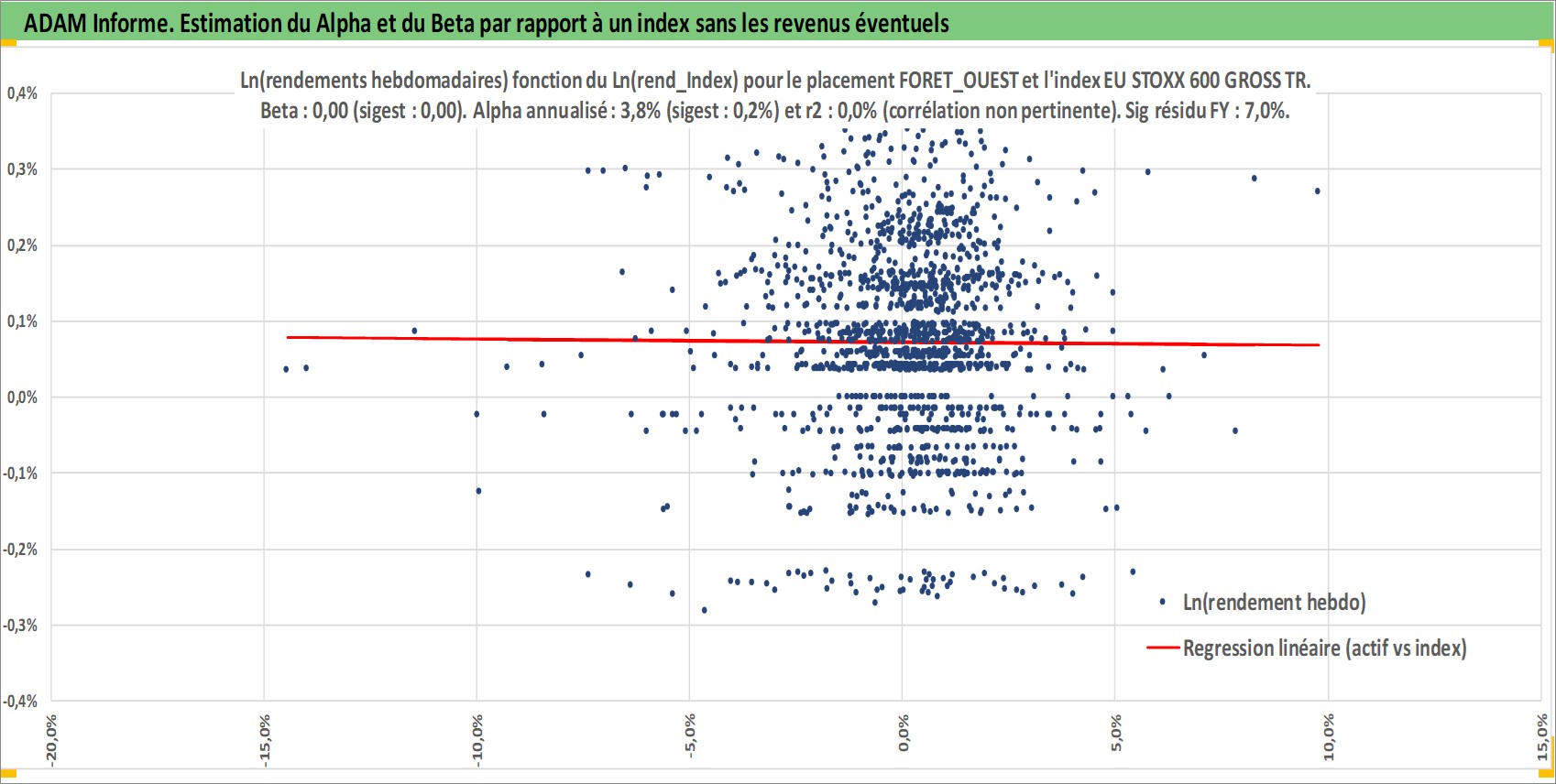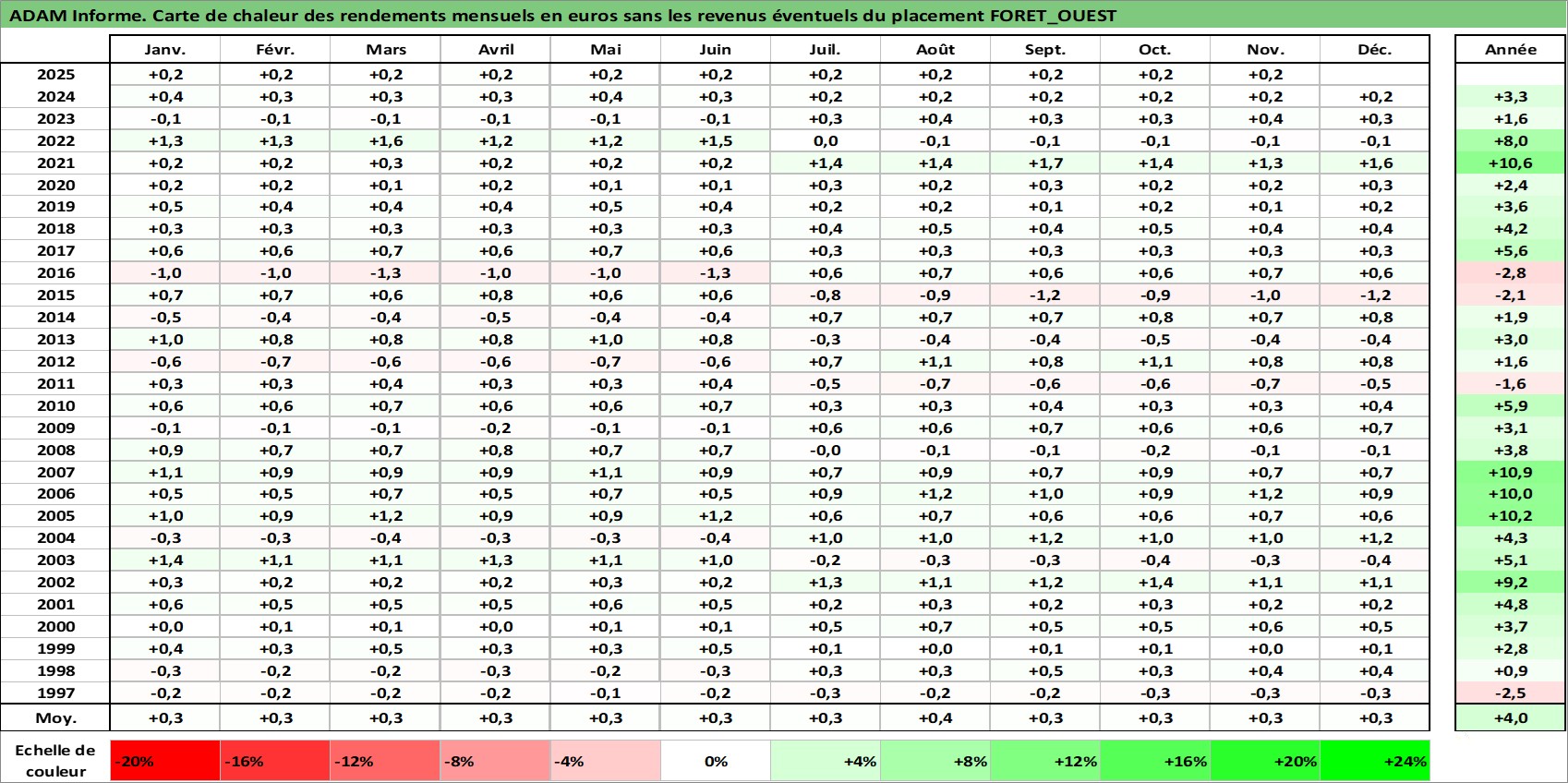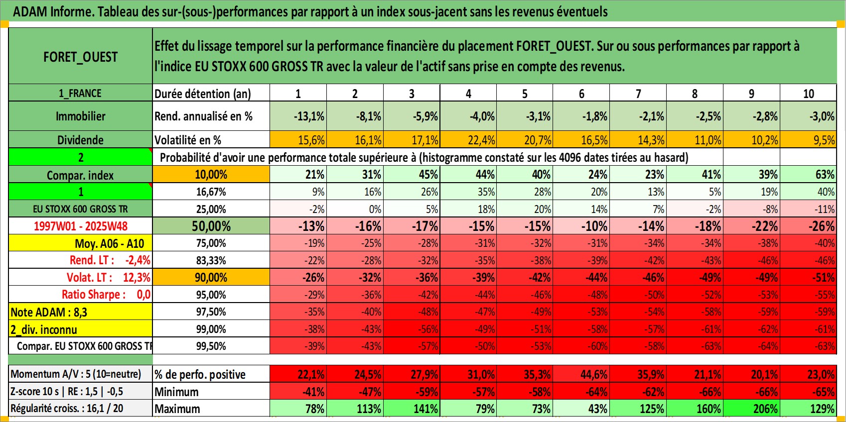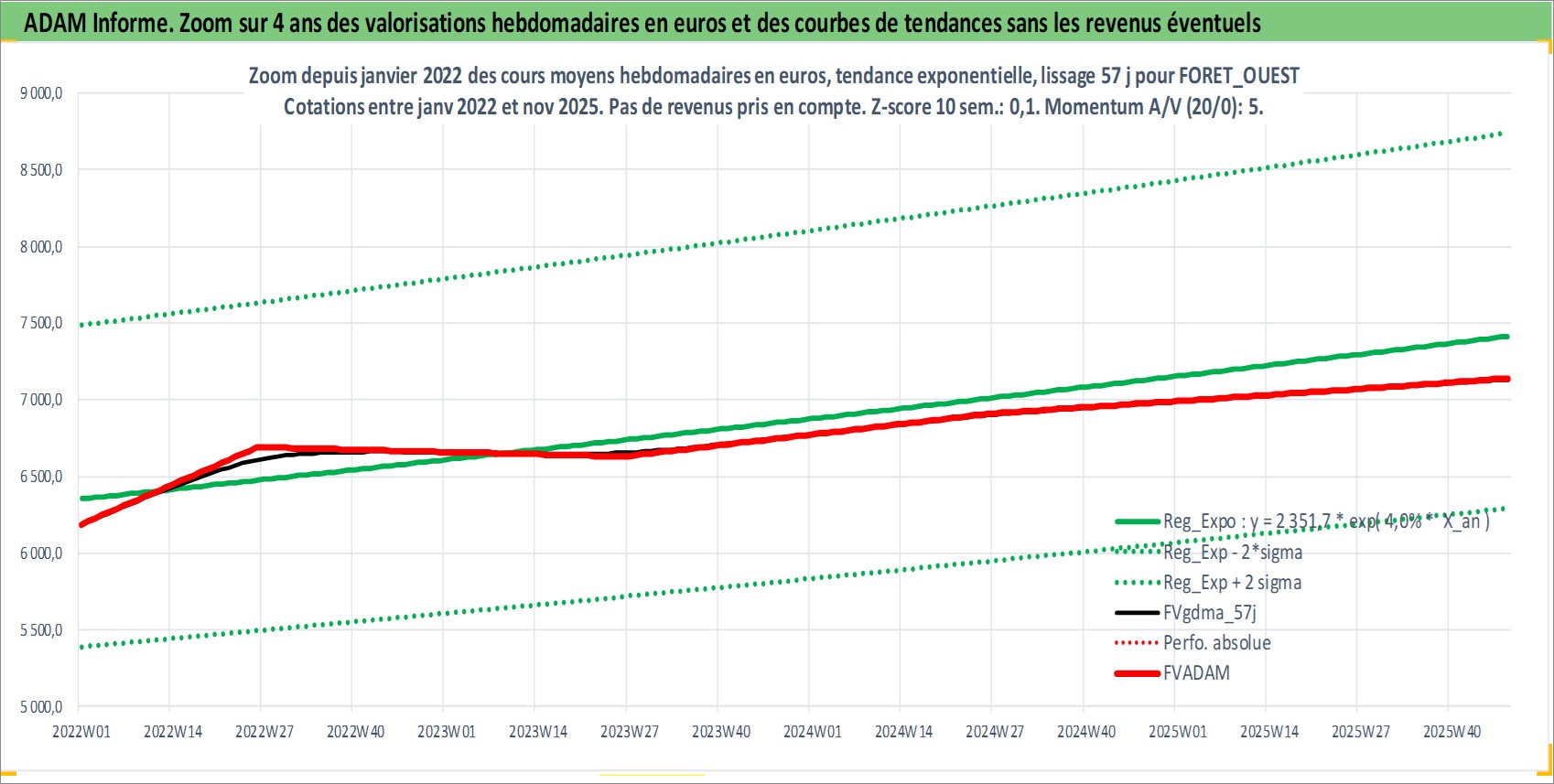 Site dédié aux investisseursPage dédiée sur site financeAnalyse des valorisations hebdomadaires de l'actif FORET_OUEST. Cet actif est cote en EUR. Les valorisations couvrent les semaines 1997W01 a 2025W48. Les fermages de ce bien foncier sont pris egaux a 2,5% annuels de la valeur venale du bien.