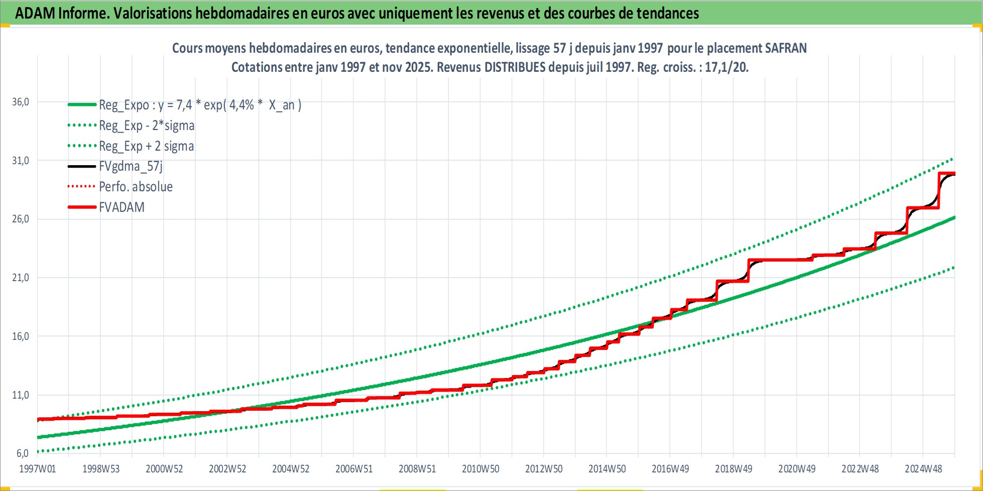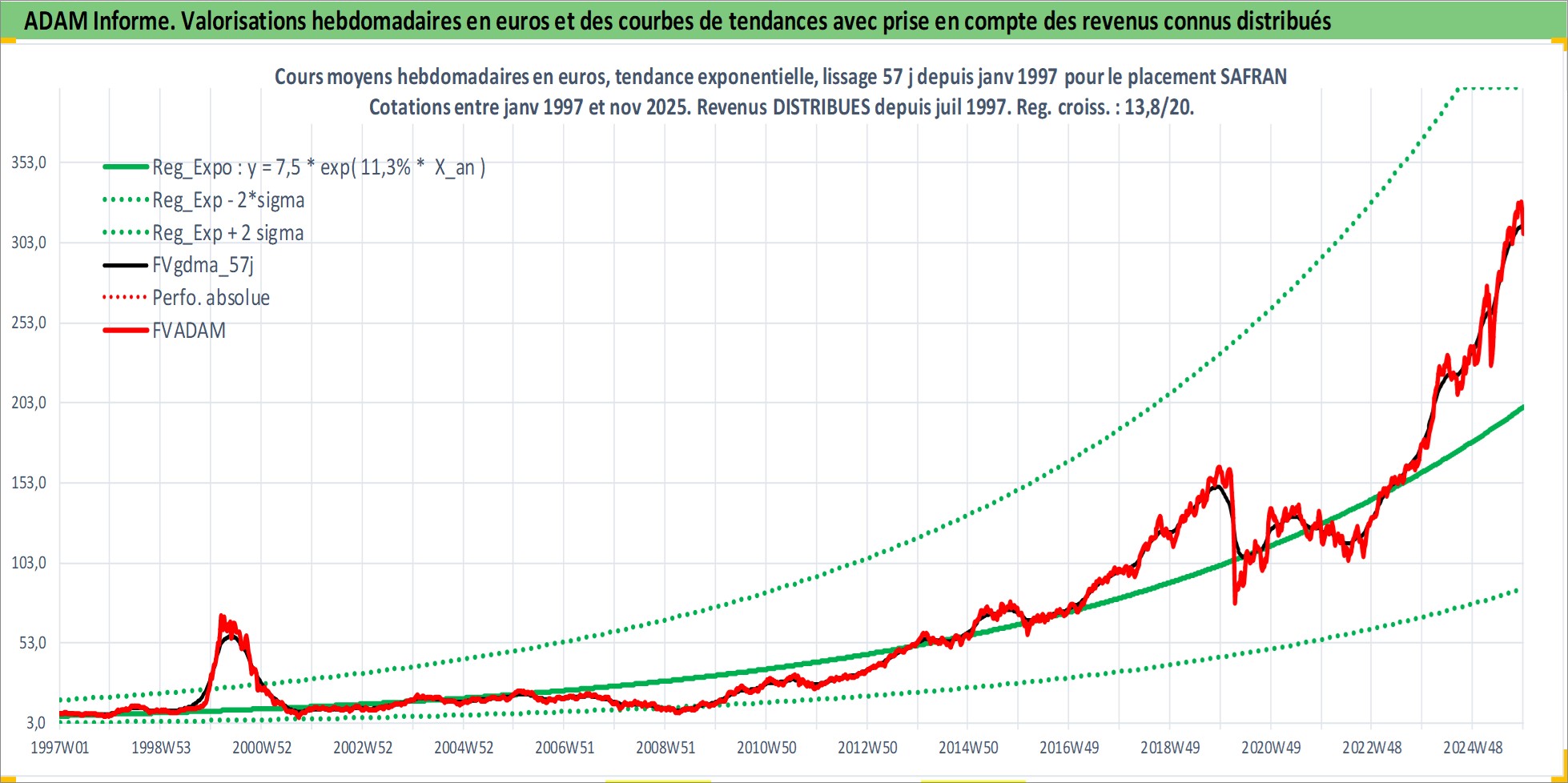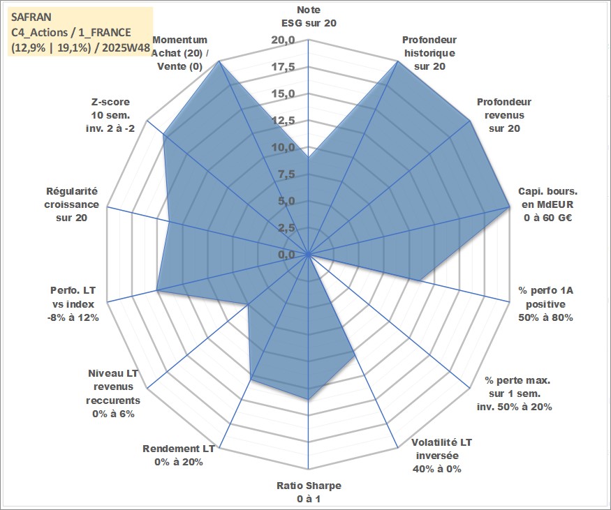 Site dédié aux investisseursPage dédiée sur site financeAnalyse des valorisations hebdomadaires de l'action SAFRAN. Cet actif est cote en EUR. Les valorisations couvrent les semaines 1997W01 a 2025W48. Les revenus de cet actif financier sont pris en compte depuis la semaine 1997W28. La note globale ESG de cet actif est estimee a 9.0 (apres rebasage entre 0 et 20).