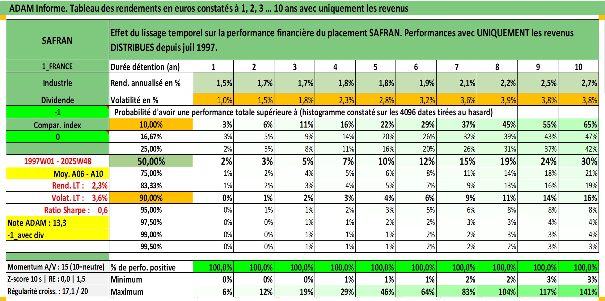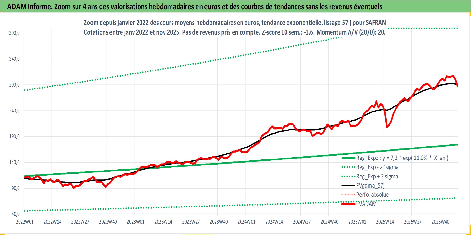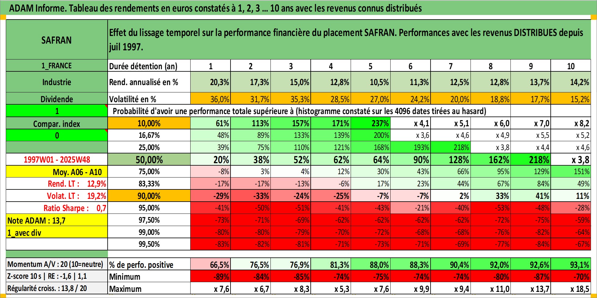 Site dédié aux investisseursPage dédiée sur site financeAnalyse des valorisations hebdomadaires de l'action SAFRAN. Cet actif est cote en EUR. Les valorisations couvrent les semaines 1997W01 a 2025W48. Les revenus de cet actif financier sont pris en compte depuis la semaine 1997W28. La note globale ESG de cet actif est estimee a 9.0 (apres rebasage entre 0 et 20).