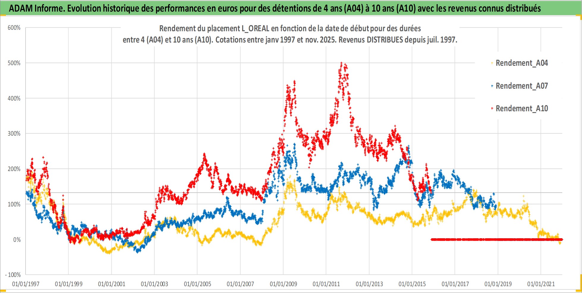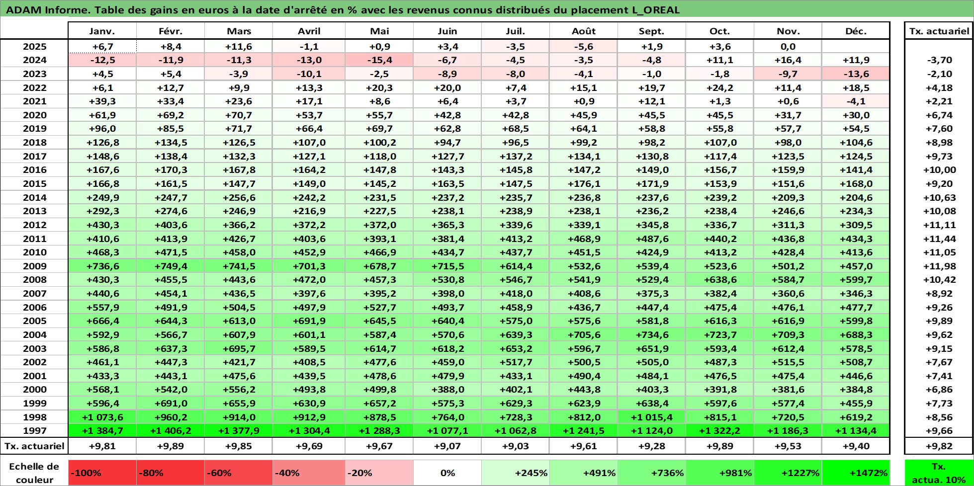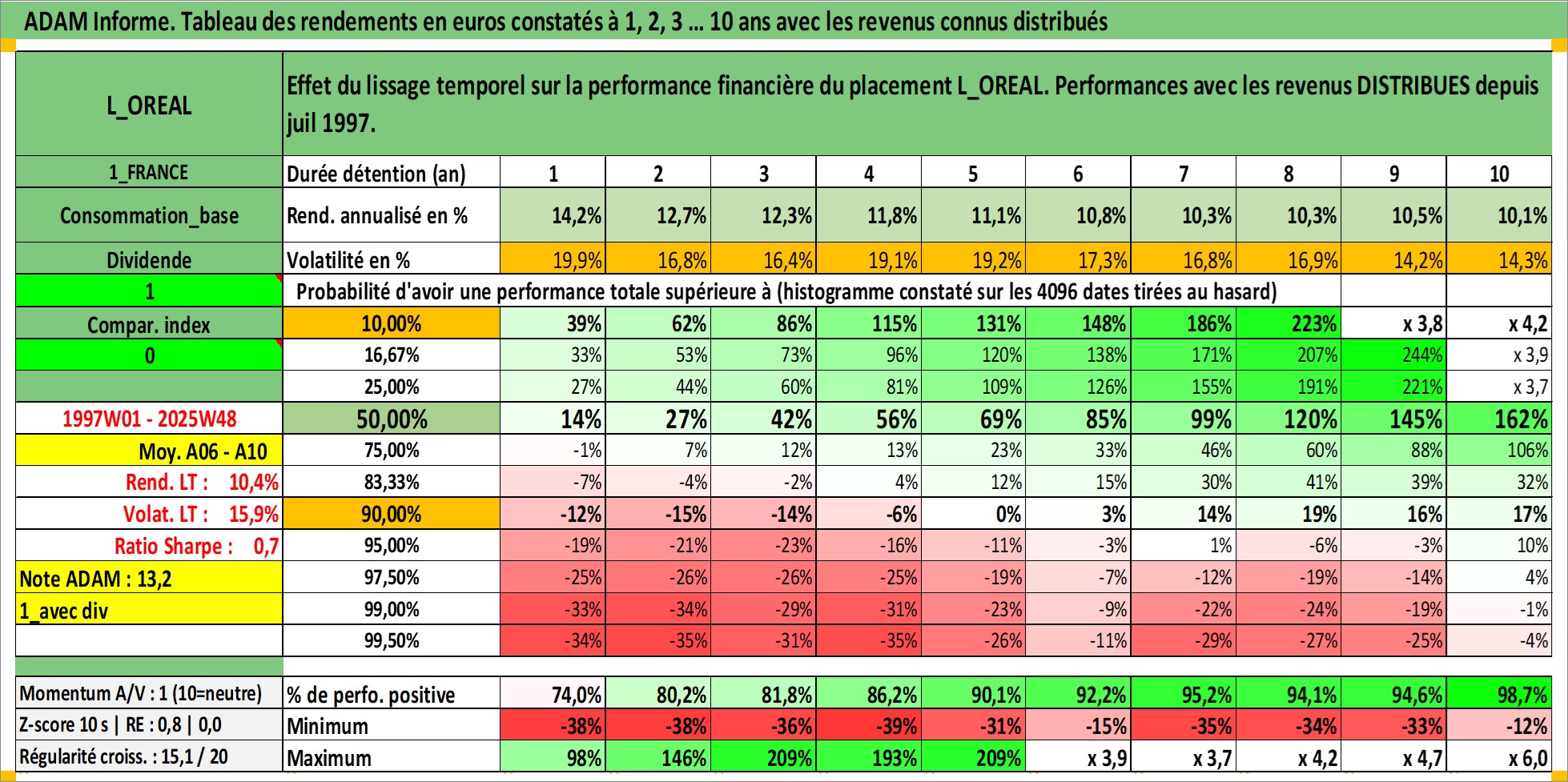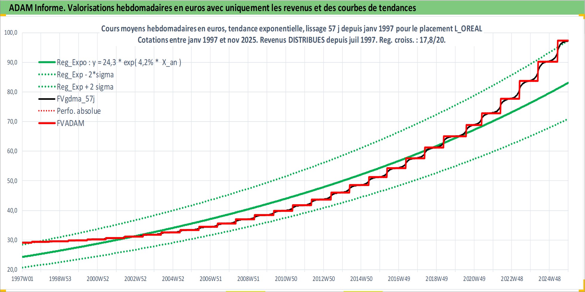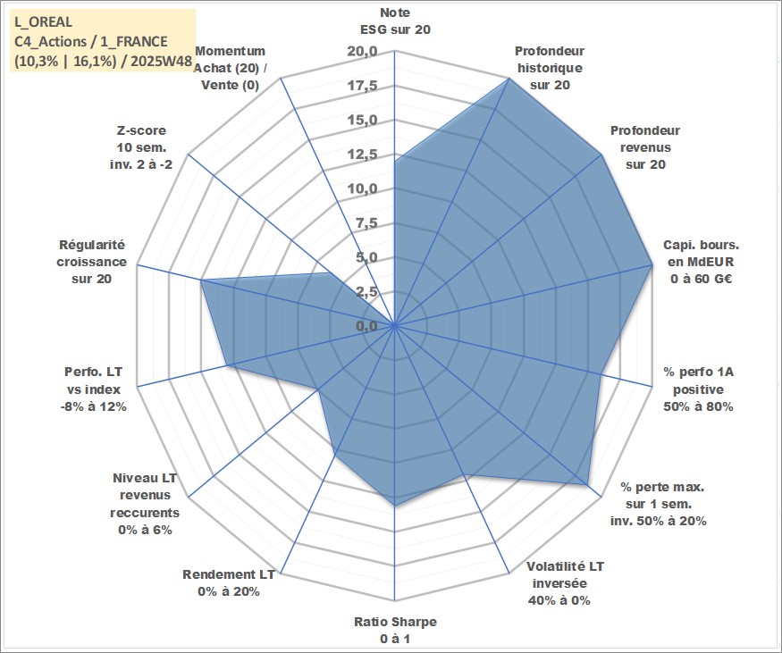 Site dédié aux investisseursPage dédiée sur site financeAnalyse des valorisations hebdomadaires de l'action L_OREAL. Cet actif est cote en EUR. Les valorisations couvrent les semaines 1997W01 a 2025W48. Les revenus de cet actif financier sont pris en compte depuis la semaine 1997W27. La note globale ESG de cet actif est estimee a 12.0 (apres rebasage entre 0 et 20).