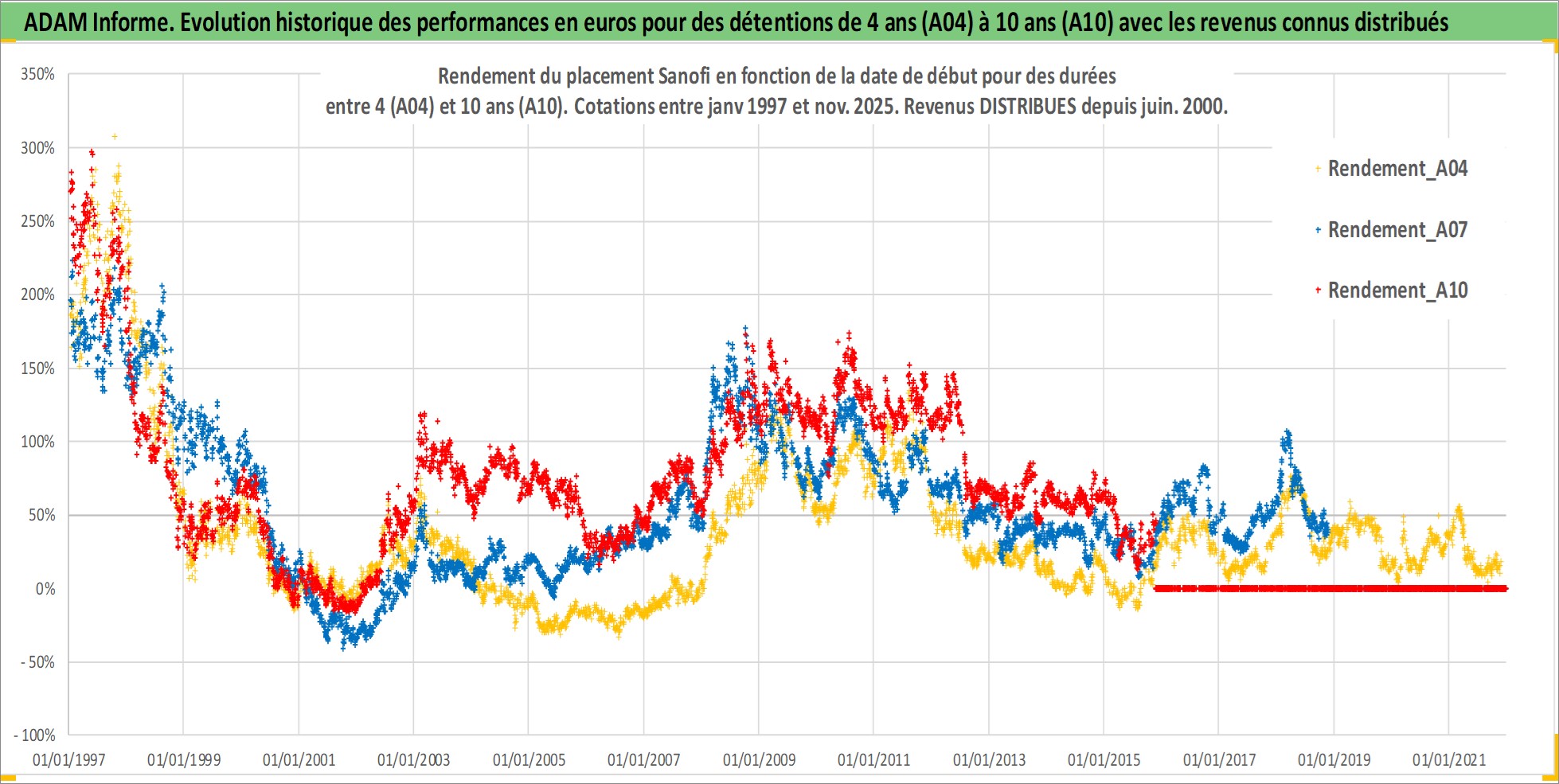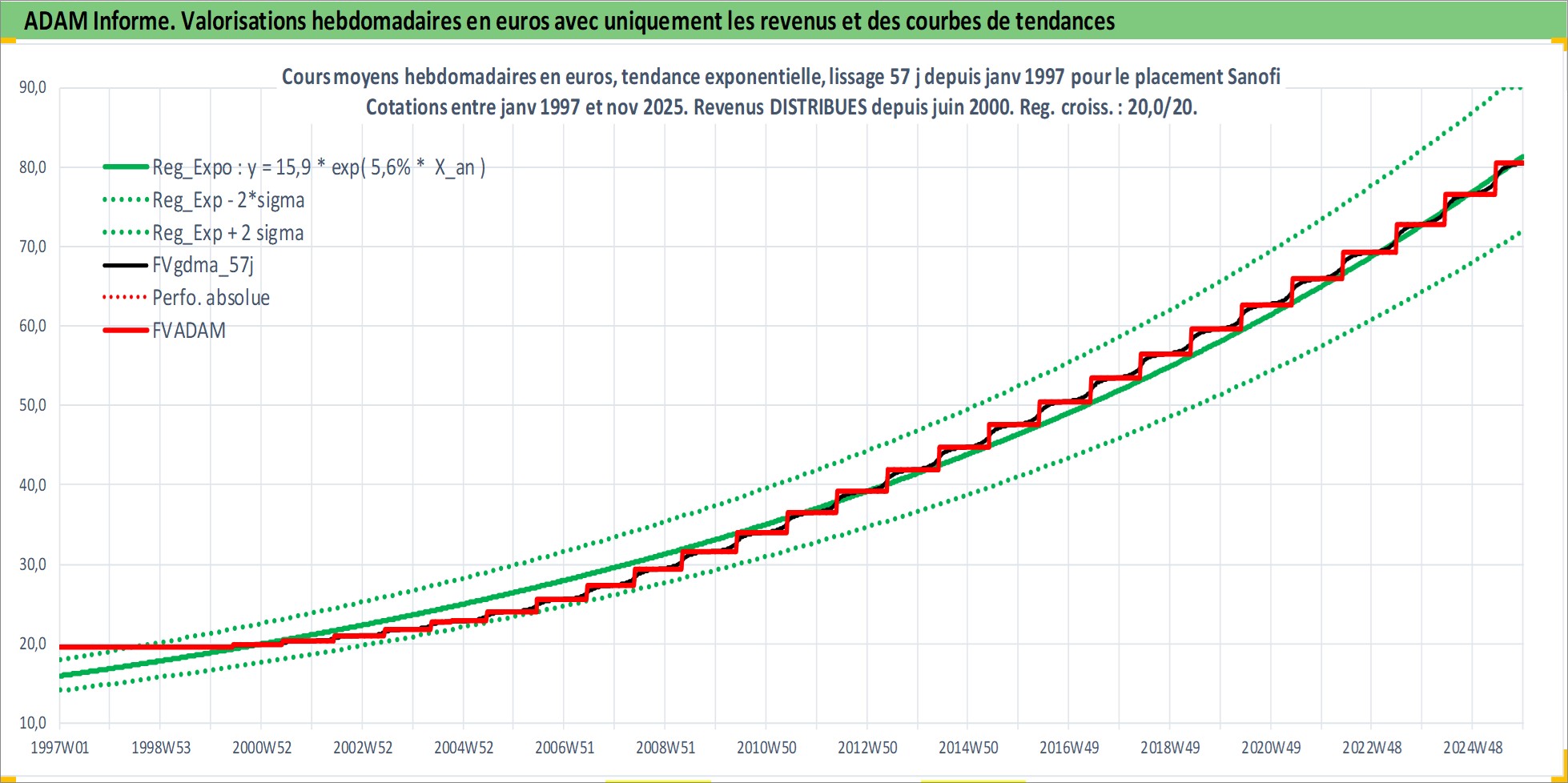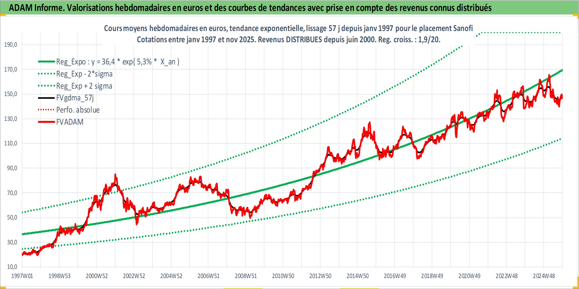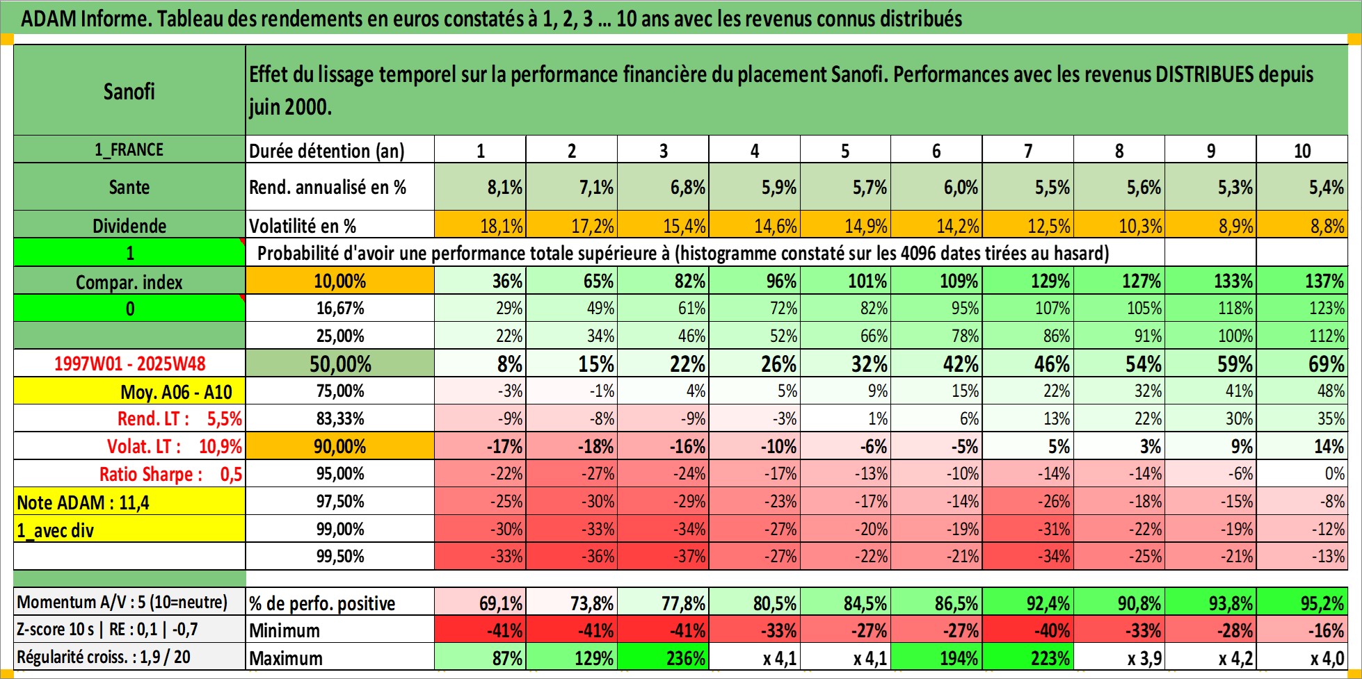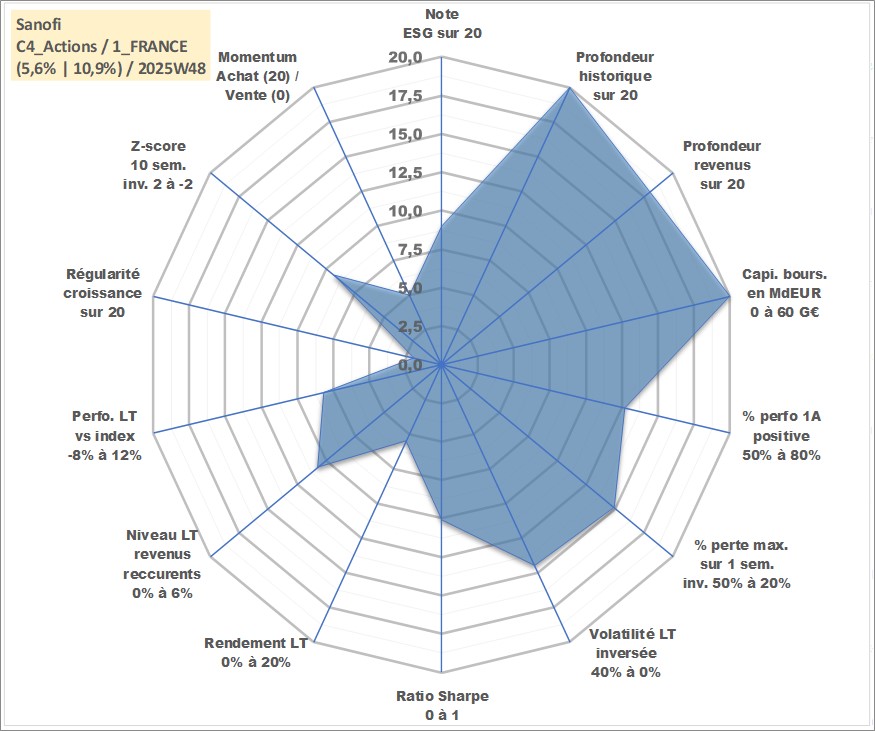 Site dédié aux investisseursPage dédiée sur site financeAnalyse des valorisations hebdomadaires de l'action Sanofi. Cet actif est cote en EUR. Les valorisations couvrent les semaines 1997W01 a 2025W48. Les revenus de cet actif financier sont pris en compte depuis la semaine 2000W23. La note globale ESG de cet actif est estimee a 9.0 (apres rebasage entre 0 et 20).